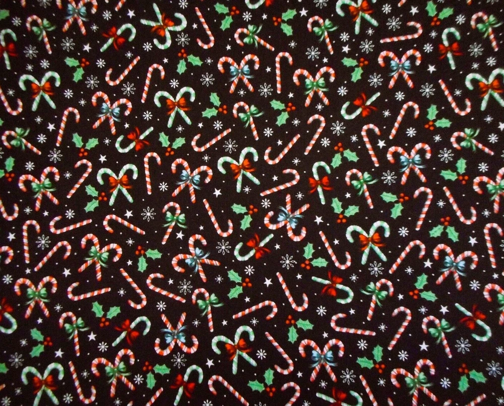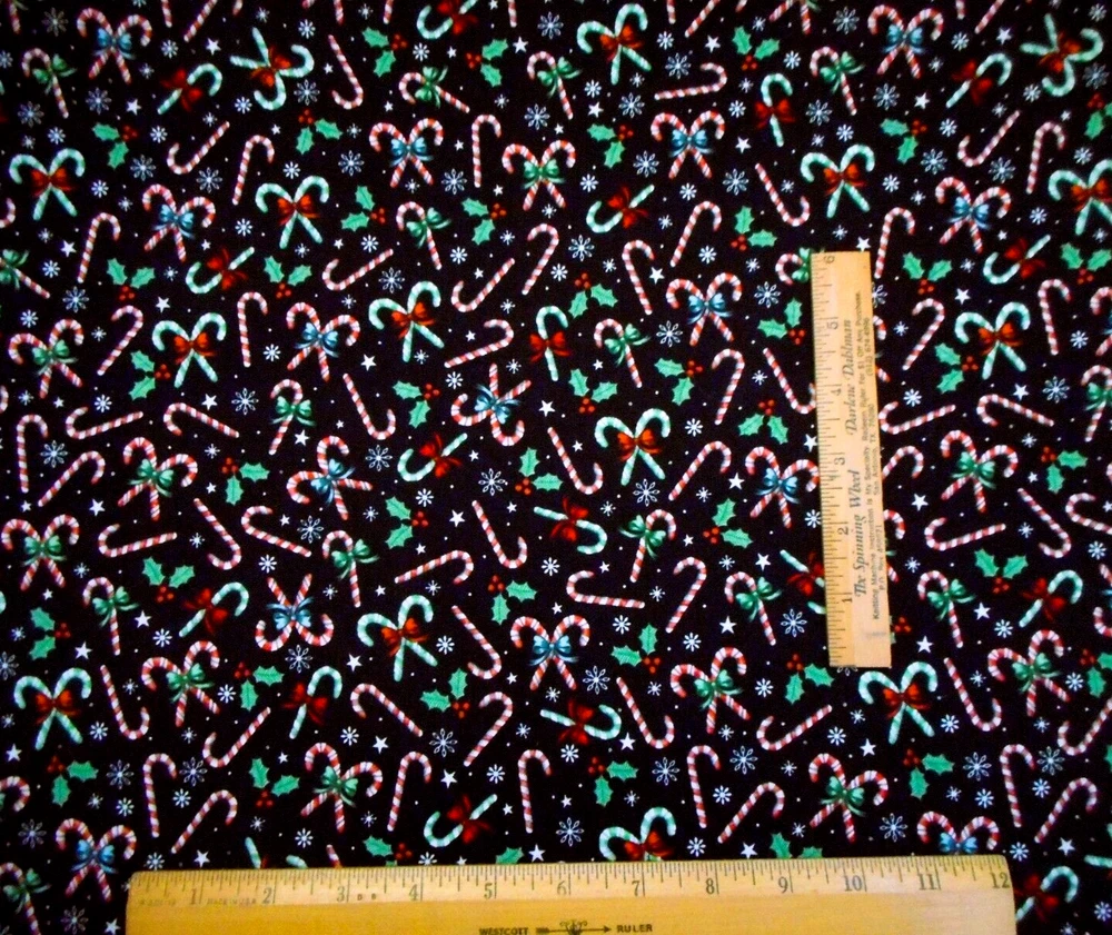 This is a very nice fabric that is 100% cotton. This a premium quilting cotton by Brother & Sister Design Studio. It has candy canes tied with ribbon, holly & white snowflakes on a black background. READ: Because computer monitors show colors and shades differently, the fabric colors can vary from the photos. If you have any questions regarding this, please contact me before p urchasing the item. I have been a quilter for 30 years and am an accomplished seamstress & would be happy to answer any questions you might have. This is for a 1 Yard of Fabric. If you purchase more than 1 Yard, I will give you one continuous cut. If you have a problem with anything you purchase from me, please contact me before leaving neutral or negative feedback and I will work it out with you. Payment is due within 48 hours. If payment isn't received within 5 days, it will automatically go to Ebay's resolution center for non-payment. INSTRUCTIONS FOR COMBINED SHIPPING: I Do combine shipping. You must put your items into your shopping cart and request an invoice from me using the request total button before completing the payment process. IF YOU'RE UNABLE TO COMBINE YOUR SHIPPING, PLEASE CONTACT ME. Payment is due upon receipt of your invoice. Thank you for looking and God bless you and your family. IF THERE IS A PROBLEM WITH ANY PURCHASE, PLEASE CONTACT ME, THE SELLER, VIA EBAY'S MESSAGING SYSTEM PRIOR TO OPENING A CASE--OPENING A CASE, EVEN IF RESOLVED SMOOTHLY, CAN HURT THE SELLER'S RATINGS. THANK YOU
