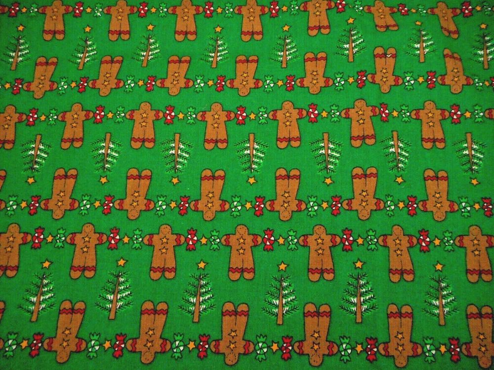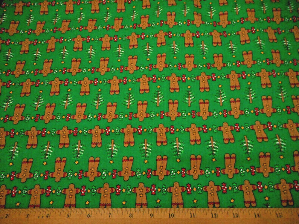 This is a very nice fabric that is 100% cotton. This fabric is out of print. THE BACKGROUND IS A XMAS GREEN & NOT YELLOW/GREEN LIKE THE PHOTOS LOOK. It has brown gingerbread men, candy & Xmas trees on a Xmas green background. Computer monitors show colors and shades differently. If you have any questions regarding this, please contact me before p urchasing the item. I have been a quilter for 30 years and am an accomplished seamstress & would be happy to answer any questions you might have. This is for a 1 Yard of Fabric. If you purchase more than 1 Yard, I will give you one continuous cut. If you have a problem with anything you purchase from me, please contact me before leaving neutral or negative feedback and I will work it out with you. Payment is due within 48 hours. If payment isn't received within 5 days, it will automatically go to Ebay's resolution center for non-payment. INSTRUCTIONS FOR COMBINED SHIPPING: I Do combine shipping. You must add the items to your shopping cart and request an invoice from me using the REQUEST TOTAL BUTTON, BEFORE completing the payment process, or I won't be able to combine your shipping. Payment is due upon receipt of your invoice. Thank you for looking and God bless you and your family. IF THERE IS A PROBLEM WITH ANY PURCHASE, PLEASE CONTACT ME, THE SELLER, VIA EBAY'S MESSAGING SYSTEM PRIOR TO OPENING A CASE--OPENING A CASE, EVEN IF RESOLVED SMOOTHLY, CAN HURT THE SELLER'S RATINGS. THANK YOU