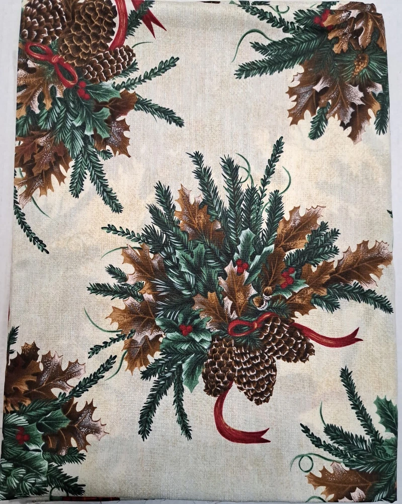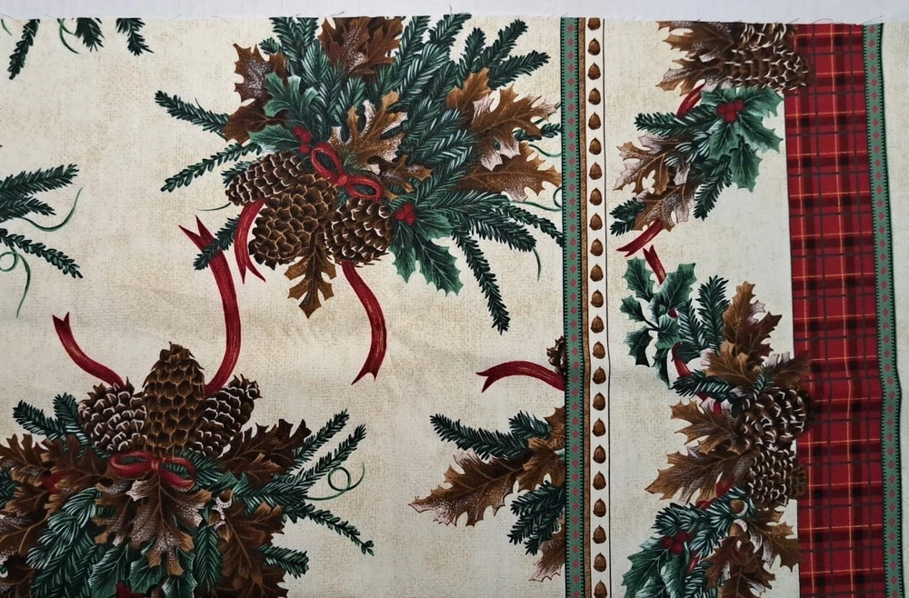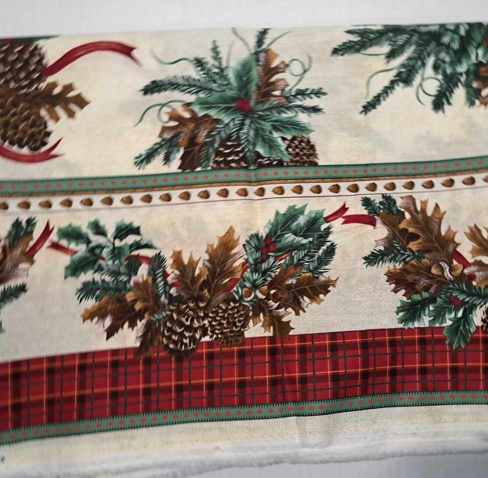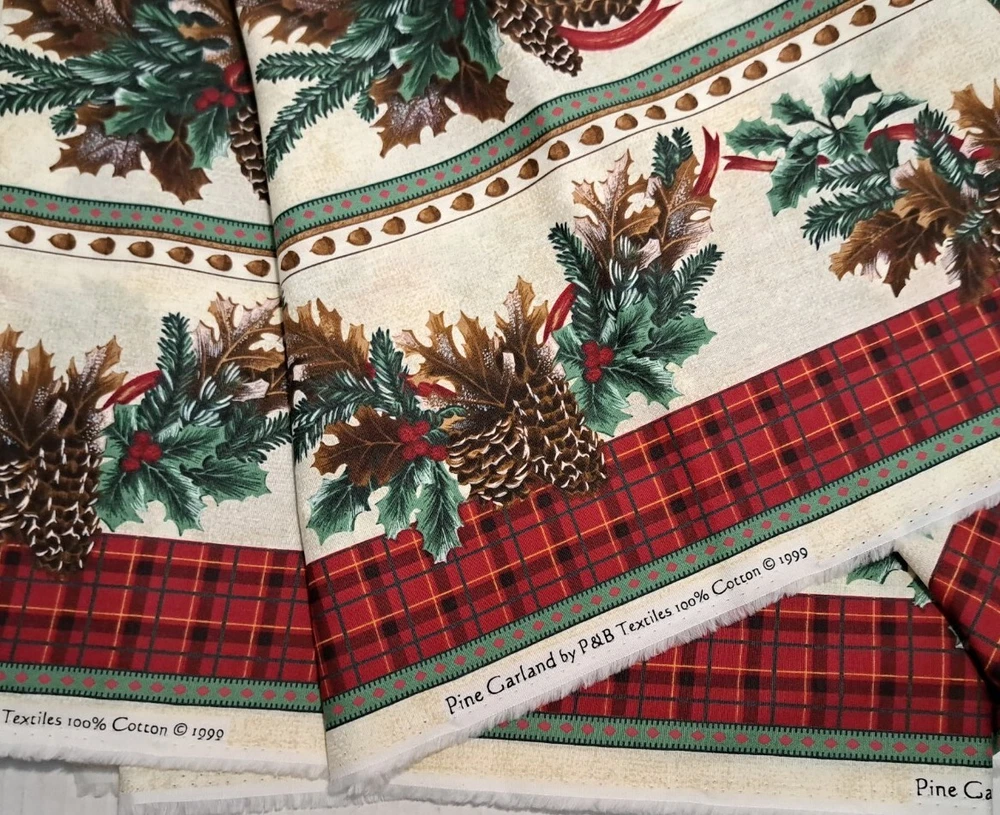 P&B Textiles 1999 Cotton Christmas Fabric Pine Garland Red Borders Approx 110" x 44 Red Plaid strip down both long edges of fabric see photos Please view all photos zooming in on them as they are part of the description for you to judge condition