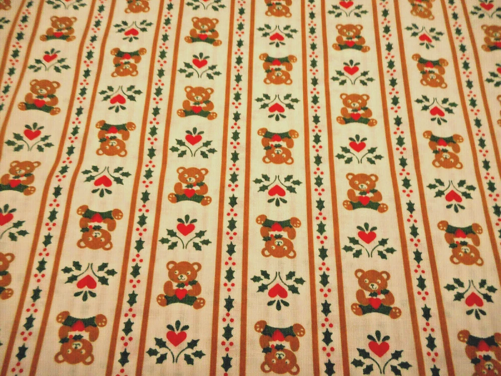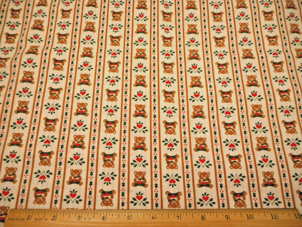 This is a very nice fabric that is 100% cotton. This fabric is out of print. It has small brown bears with holly & holding little red hearts in white stripes with narrow brown stripes & narrow white stripes with holly in it separating them. Computer monitors show colors and shades differently. If you have any questions regarding this, please contact me before p urchasing the item. I have been a quilter for 30 years and am an accomplished seamstress & would be happy to answer any questions you might have. This is for a 1 Yard of Fabric. If you purchase more than 1 Yard, I will give you one continuous cut. If you have a problem with anything you purchase from me, please contact me before leaving neutral or negative feedback and I will work it out with you. Payment is due within 48 hours. If payment isn't received within 5 days, it will automatically go to Ebay's resolution center for non-payment. INSTRUCTIONS FOR COMBINED SHIPPING: I Do combine shipping. You must put your items into your shopping cart and request an invoice from me using the request total button before completing the payment process. IF YOU'RE UNABLE TO COMBINE YOUR SHIPPING, PLEASE CONTACT ME. Payment is due upon receipt of your invoice. Thank you for looking and God bless you and your family. IF THERE IS A PROBLEM WITH ANY PURCHASE, PLEASE CONTACT ME, THE SELLER, VIA EBAY'S MESSAGING SYSTEM PRIOR TO OPENING A CASE--OPENING A CASE, EVEN IF RESOLVED SMOOTHLY, CAN HURT THE SELLER'S RATINGS. THANK YOU