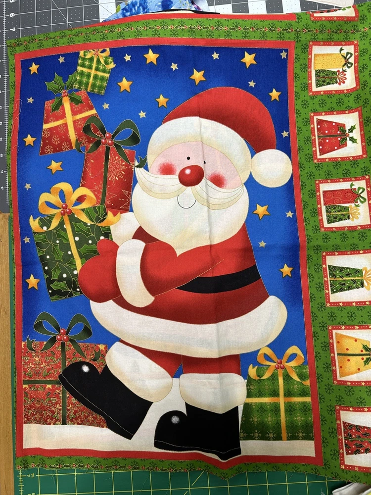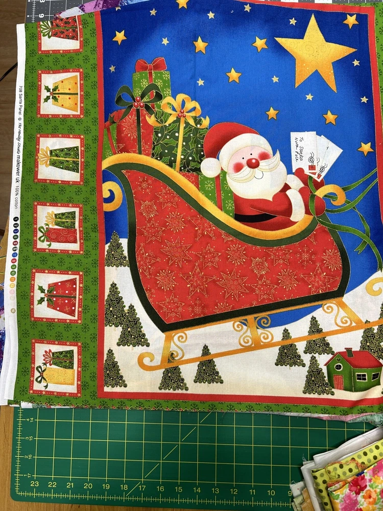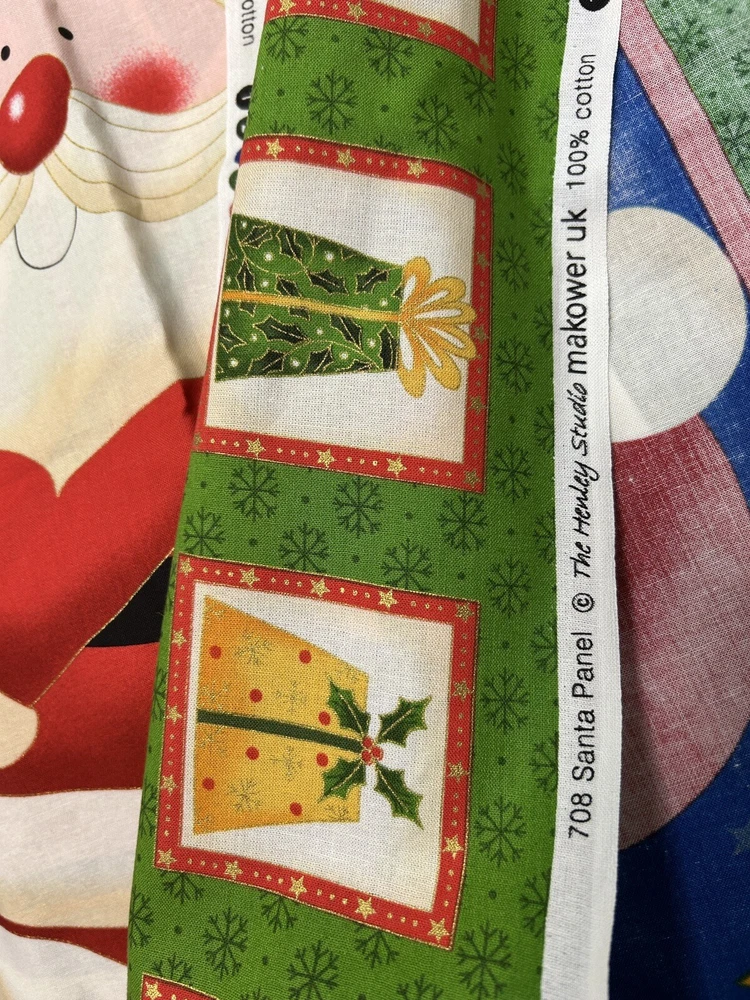 100% cotton high quality fabric This Christmas fabric from Makower features a festive pattern of Santa, gift packages and sleigh perfect for all your holiday crafting needs. The cotton material is soft and durable, suitable for apparel, quilting, bedding, and more. The 23 x 42” panel is standard weight. great for the all hanging, blankets/throws, pillow covers, and everyday clothing. The two panels on one piece of fabric makes it easy to create your own unique designs. Made in the United Kingdom, this fabric is a must-have for any holiday-themed crafting project.