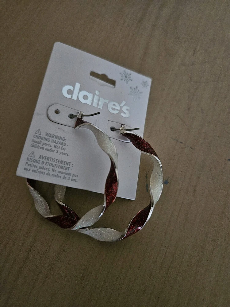 These festive hoops earrings are from the brand Claire's and feature a round shape with a Christmas theme in red and white colours. The earrings are made of steel and are designed in Great Britain. Perfect for adding a touch of holiday cheer to any outfit.