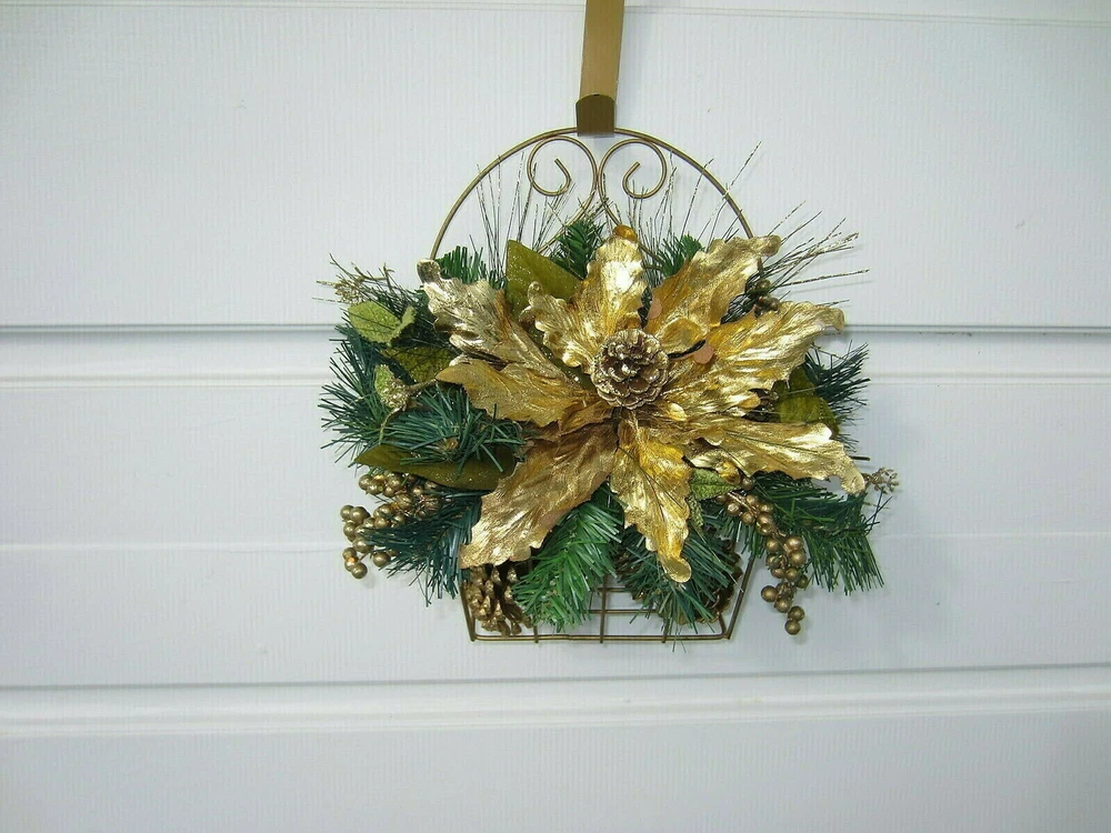 Christmas Floral Basket Handmade For hanging on the wall, door or setting it on a tabletop or shelf The Arrangement is in a Gold Wire Basket Has Two gold glitter Pinecones inside the basket under the arrangement they do not come out. Has greenery, a big gold flower Gold glittered pinecones, gold balls, and gold tipped sprays Measures 14 inches Tall 15 inches wide from end to end of the arrangement Very beautiful and Unique Please see Photos for more description COMES FROM A SMOKE FREE HOME THANKS FOR LOOKING COME AND SEE MY other items Powered by SixBit's eCommerce Solution