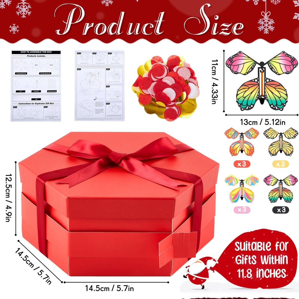 Features: Record beautiful moments: Whether it's your partner's birthday, your friend's special day, your parent's celebration ,a friend's festive occasion, or Christmas day.this DIY surprise gift box promises a creative and entertaining surprise experience, capturing their surprised expressions. Exquisitely crafted box: Crafted with attention to detail, this DIY explosion gift box is exquisite, radiating joy and surprise with its pleasing aesthetics. Besides, it's easy to assemble, adding to your convenience. Specifications: Material: card paper, rubber bands Color: red Size: Box: about 5.7 x 5.7 x 4.6 inches Ribbon: about 0.98 inches Package includes: 1 x Butterfly explosion gift box 12 x Ejecting butterflies 2 x Bag of colorful confetti 1 x Ribbon 1 x Double sided tape Notes: Manual measurement, please allow slight errors on size. The color may exist a slight difference due to different screen displays. Small parts included, please keep them away from little kids to avoid swallowing risk. Suitable for people over 14 years old, and it's recommended to use under the supervision of adults in case of choking risk Easy to Assemble: take a butterfly box, start rotating the rubber band, after about 30-40 times, put the rotating butterfly into the inner layer of the box, and so on, put the butterflies around, sprinkle some colorful confetti, and then close the lid; We also provide instructions to make it easier; Please note: twist the catapult butterfly to the appropriate number of turns for a surprising explosion and flying effect Delightful Surprise: this butterfly surprise gift box includes 1 red explosion gift box, 12 ejecting butterflies, 2 bags of colorful confetti, a roll of ribbon and a double sided tape, suitable for sparking joy and excitement, providing a wonderful unboxing experience; Rich colors, it leaves a lasting impression Easy to DIY: featuring a red design, the butterfly surprise gift box keeps its surprise element intact; You can tape the memory-filled photos on the surprise gift box and writing words. The center of the gift box provides you with a large space where you can place a sweet little cake, beautiful flowers, cute little dolls and other gifts, offering ample room for your tokens of love Quality Material: our flying butterfly box is constructed from card paper; The ejection butterflies are powered by safe rubber bands, making the entire product safe and user friendly; Please note: twist the catapult butterfly to the appropriate number of turns for a surprising explosion and flying effect Versatile Gift: the explosion gift box is a versatile present, suitable for creating an ambiance of surprise; It's an ideal choice for colleagues, family, and loved ones for Christmas,birthdays, anniversaries, Valentine's Day, Mother's Day, Father's Day and many other celebrations