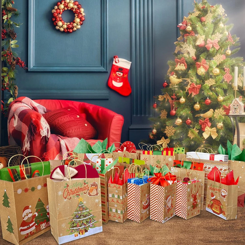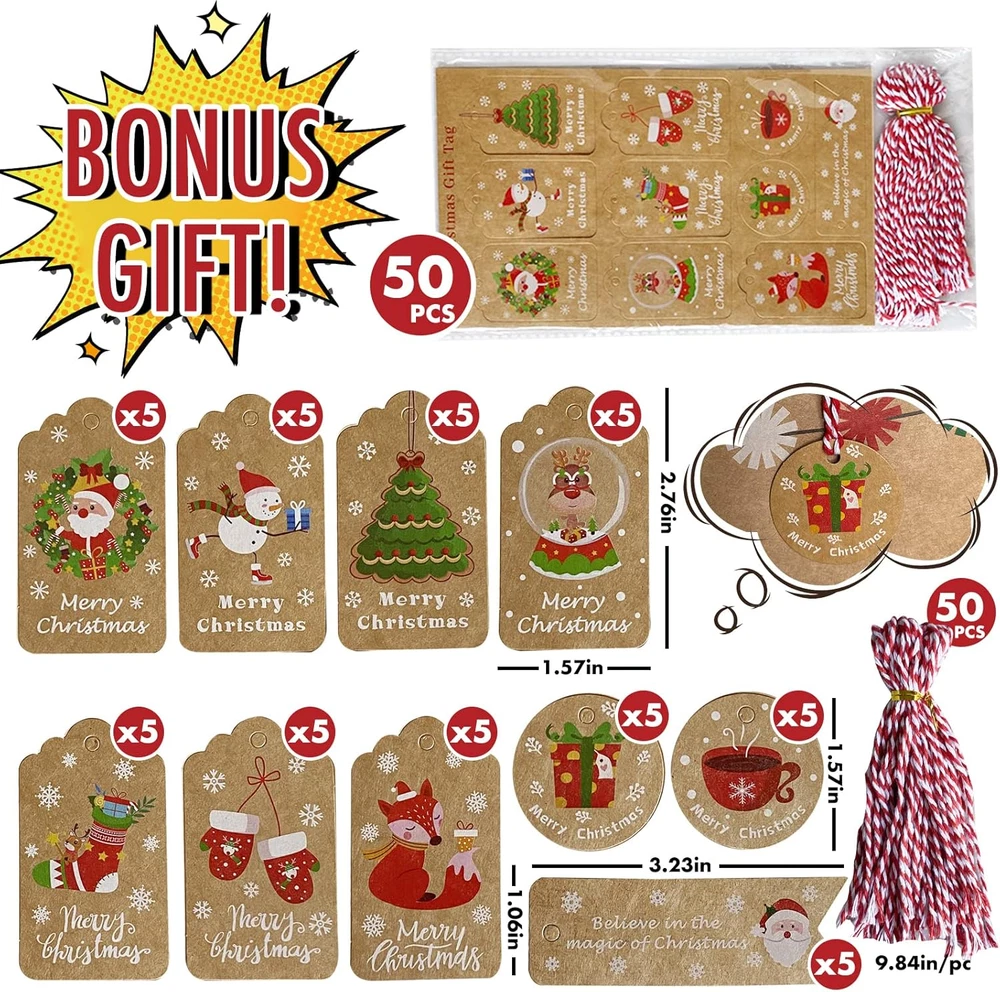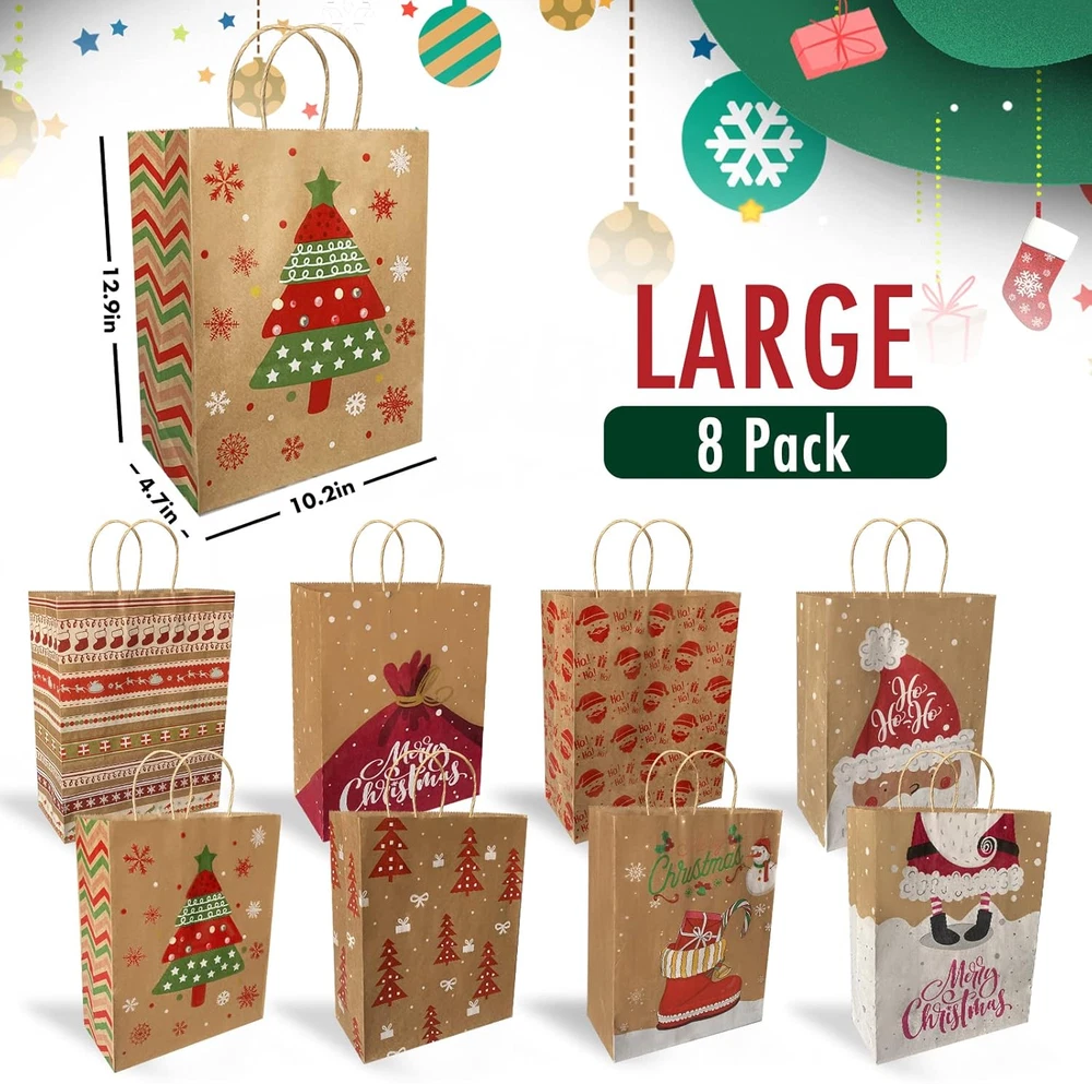 Store New Arrivals Add to Favorite View Feedback Contact Christmas Gift Bags 24 Pack, Christmas Kraft Paper Bags Bulk with Handles 24 Styles, Assorted Sizes Bag Set with 50 Tags, Xmas Holiday Paper Bags & Goody Bags, Favor Bags (8 Large, 8 Medium, 8 Small) Description Unit Count 24.0 Count Number of Items 24 Color Red, Green, White Product Dimensions 12.9"L x 10.2"W x 4.7"H Material Paper Country of Origin China Package Dimensions 16.54 x 13.5 x 2.83 inches Item Weight 1.85 pounds Theme Patterns Occasion Christmas Brand Bavcieu Cartoon Character Santa Claus Included Components Christmas Gift Bags, Gift Tags 【Great Value 24 Pack】Christmas Kraft Paper Bags includes 24-count Christmas Gift Bags and Extra 50-count Gift Tags. Christmas gift bags Designed with handles, is very convenient to carry. And the decoration of the bag with the tags is more beautiful and the festive atmosphere is stronger. 【24 Different Patterns Design】24 Pack Christmas Gift Bags with 24 patterns. There are many classical Christmas elements, including Santa Claus, reindeer, snowman, Christmas tree, pine, Christmas socks, bells, merry Christmas, snow wreath, etc. 【3 Sizes of Christmas Gift Bags】Christmas Gift Bags has Assorted Sizes. Large: 12.9" L x 10.2" W x 4.7" H (8 Pack), Medium: 10.6" L x 8.3" W x4.3" H ( 8 Pack), Small: 8.3" L x 5.9" W x 3.1" H (8 Pack). 【Premium Materials】Christmas gift bags are made of Upgraded thickening Premium Kraft Paper bags, durable, unbreakable, sturdy, and can be reused. Brown paper bags look textured and are more advanced and environmentally friendly than plastic bags. 【Multiple Uses】Christmas paper bags with handles are perfect for items such as mugs, scents, small dolls, and picture frames. Gift bags can be used as Christmas gift bags or Christmas decorations, but also as everyday shopping bags, both convenient and environmentally friendly. Product Description If you have any questions about product, please tell us. We will provide you with a satisfactory solution within 24 hours. Package Included: Christmas gift bag (Large x 8) Christmas gift bag (Medium x 8) Christmas gift bag (Small x 8) Gift Tag & Gift Tags Rope x 50 Bavcieu 24 Pack Christmas Gift Bags are perfect for Xmas or other festive occasions. It's a great choice for packing gifts for family and friends. 24 Pack Christmas Gift Bags Size 1- Large:12.9" L x 10.2" W x 4.7" H (8 Pack) Size 2- Medium:10.6" L x 8.3" W x4.3" H ( 8 Pack) Size 3- Small:8.3"L x 5.9" W x 3.1" H (8 Pack) 50 Pack Gift Tags Tag 1- Rectangle:12.9" L x 10.2" W x 4.7" H (35 Pack) Tag 2- Round:10.6" L x 8.3" W x 4.3" H ( 10 Pack) Tag 3- Strip:8.3" L x 5.9" W x 3.1" H (5 Pack) Rope:9.8" W/PCS (50 Pack) Each size contains 8 different patterns, 3 sizes have a total of 24 patterns. Share Happiness Christmas gift bags consist of 24 different patterns of gift bags, Every pattern is unique, It is easy to distinguish and give your family or Friends a different surprise. Various Occasions Christmas kraft paper bags with tags are great for Christmas party favors, home, office, classroom, Christmas tree, holiday, festival, wedding, baby shower, and birthday decorations, to create a Christmas ambiance. Perfect Capacity Christmas gift bags have 3 size match all your special packing requests, you can use them to hold Xmas gifts perfectly like toys, candies, shoes, gift cards, wine, scarf, A4 size or larger books, and so on. ABOUT US We offer the best prices around on high quality products. Our E-store includes media such as books, movies, music and games while offering electronics, toys, sporting apparel, clothing, tools, general home, garden items and more. SHIPPING We are always working hard to ensure your package arrives as soon as possible. Please understand that some factors like weather, high postal traffic, and the performance of shipping companies are outside of our control. We offer free shipping to the lower 48 states and ship within 2 business days of payment, usually sooner. We do not accept P.O. Boxes. Please provide a physical address. RETURNS We offer a 30-Day Return Policy on items which you are not completely satisfied with. You have the option for a full-refund or an exchange of the item. No returns are available on items shipped outside of the USA. PAYMENT We accept PayPal. CONTACT US This page content is yet to come Please ad us to your favorite seller and visit again later Thank You CUSTOMER SATISFACTION We try our very best to make sure every customer is completely satisfied. If there's a problem, message us! We're happy to help.