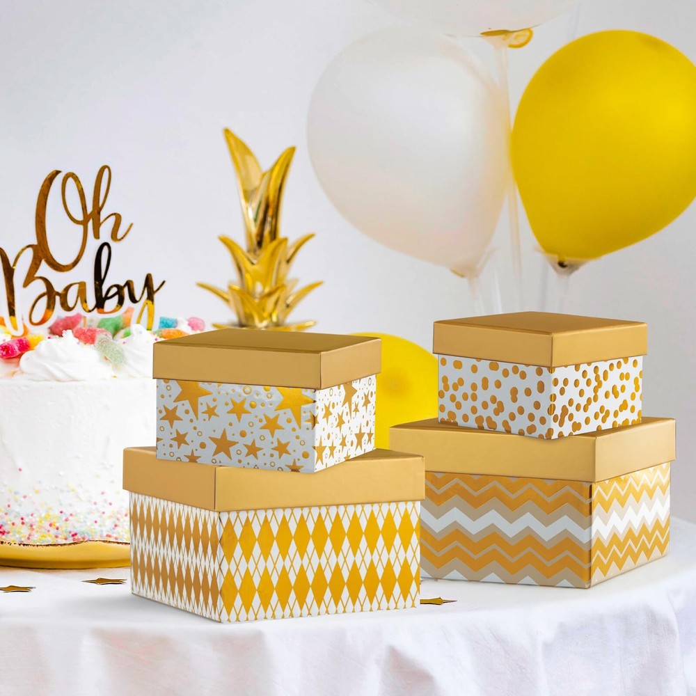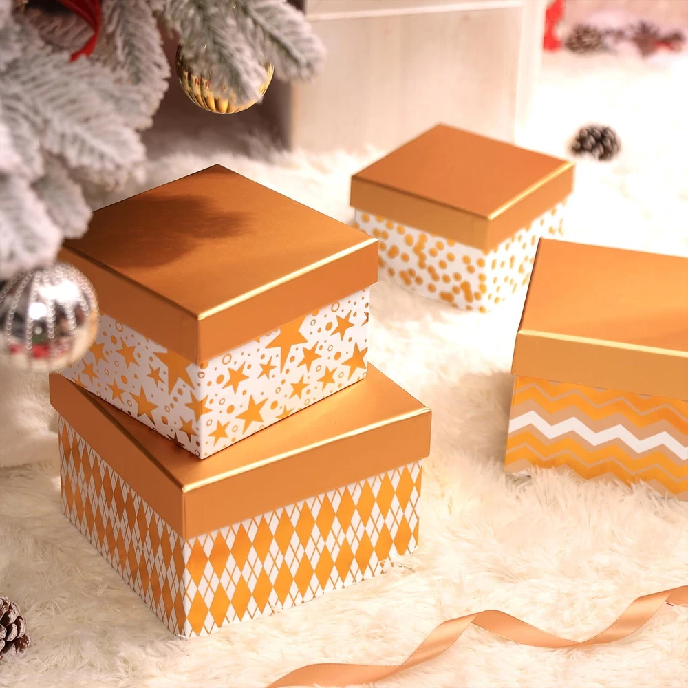 eBay Product Listing Welcome to Your Favorite My Store Your satisfaction is our top priority – Shop confidently 4PCS Christmas Nesting Gift Boxes Set, Metallic Gold Foil Geometry Flat Square Cardboard Nested Box w/Lid, for Gift Wrapping Xmas New Year, Assorted Size Item Gallery Item Description DECORATIVE HOLIDAY STORAGE ORGANIZER BOXES - Set of 4. Gold Foil Finish, flat square shape with lid, stackable nesting gift box tower. Size range from XL to S, 7.1'', 6.3'', 5.9'', 5.3'', great for any small to medium gifts like books, candles, jewelry, cosmetics, small toys, home decor, apparel, scarf, and candies. READY TO GIFT, NO WRAPPING NEEDED VALUE PACK - The boxes each have a unique geometric shape:Stars, Polka Dots, Diamonds & Stripes, and they perfectly complement one another when assembled together. Can be stacked into a tower of gifts. Just put your gifts into these lovely boxes, get ready to wow your loved ones. It is a great Christmas gift box combo and gift packaging for families, women, kids, and senior citizens. READY TO USE, VALUE PACK GIFT BOX SET - Versatile premium gift packaging. Make your gift wrapping effortless to wow loved ones. Durable and reusable paper box set is excellent for elevating events and parties like thanksgiving, weddings, bridal showers, baby showers, birthdays, Christmas, Valentine's day, New Year, Easter, mother's day, anniversaries, housewarming. LOW CARBON IMPACT MATERIAL. Our philosophy is to create every product with sustainability in mind. Our materials are mostly made from recyclable paper, wood, and fabrics. We always prioritize fair pay to our staff and integrity in our supply chain. JOY IN GIFTING. Our lifelong love for pretty paper, colors, and textures the launch of , a bespoke gift-wrapping brand intended to share their passion for the art of gift wrapping with the world, A female-led small business in southern California dedicated to the art of gift-wrapping and aiming to bring joy to gift-givers. Special Features 4PCS Christmas Nesting Gift Boxes Set, Gold Foil Geometry Flat Square Cardboard Nested Box w/ Lid, for Gift Wrapping Xmas New Year, Assorted Size Our Guarantee To You We offer fast shipping, free delivery, and 100% customer satisfaction guarantee. Not satisfied? Return your item for free within 30 days. 30-Day Free Returns Shipping Details Items will be sent to your eBay address. Please verify before purchasing. Typical delivery within 3-7 business days. Professional shipping services used for all orders. We ship to the continental US (48 states only). Unable to deliver to Alaska, Hawaii, or territories. No APO/FPO or PO Box deliveries available. We use eco-friendly packaging Payment Options We accept these secure payment methods: All transactions securely processed through eBay's payment system. Simple Returns 30-Day Satisfaction Promise Contact us through eBay messages within 30 days of delivery. We'll provide return instructions and our address. Return the item in its original condition. We'll process your refund within 48 hours of receiving the item. Get In Touch Have questions about your order? Contact us through eBay messaging for prompt assistance. We typically respond within 24 hours.