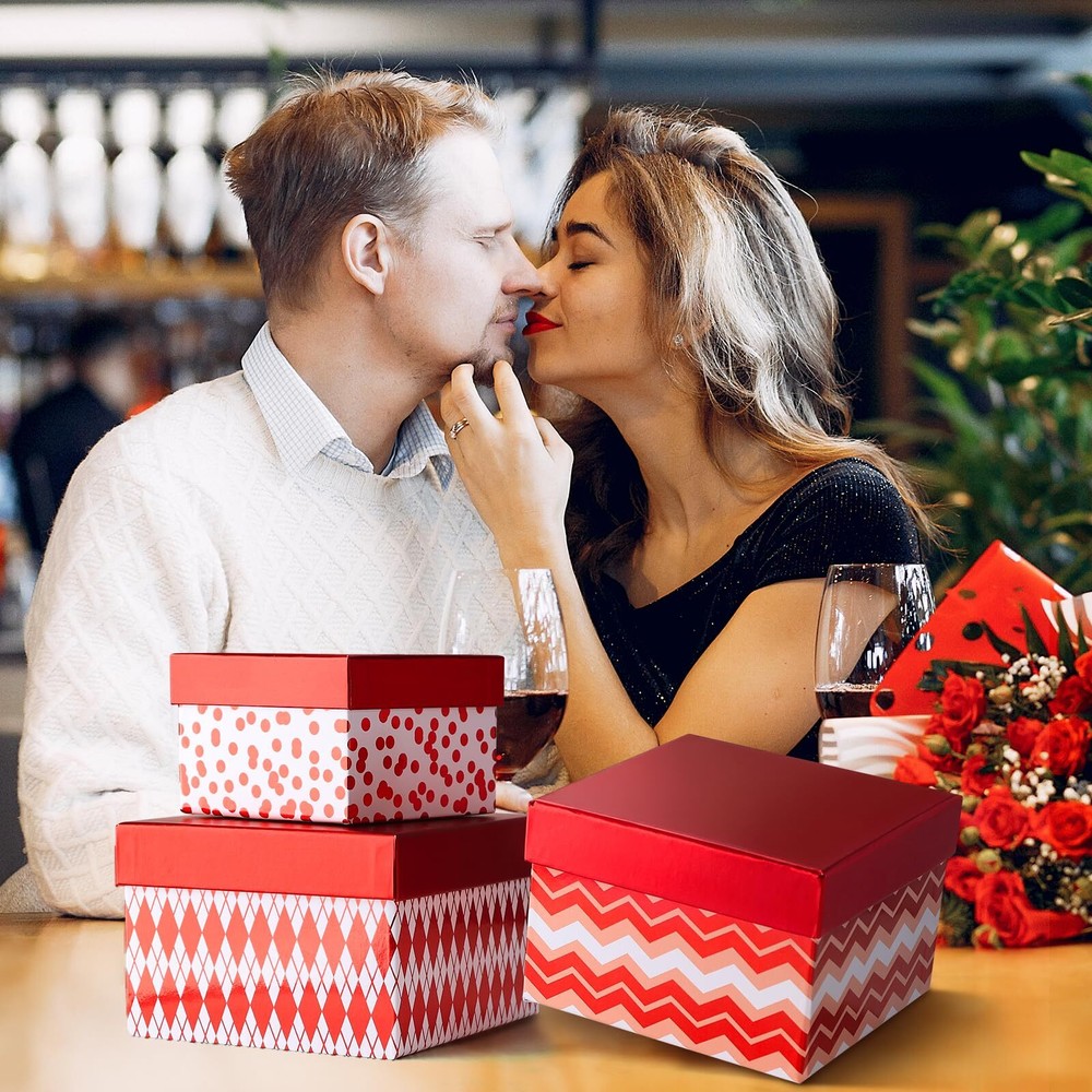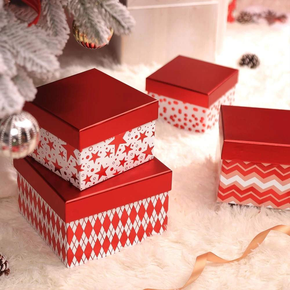 Christmas Gift Boxes 4 Pack Metallic Red Foil Geometry Square Nested Valentine