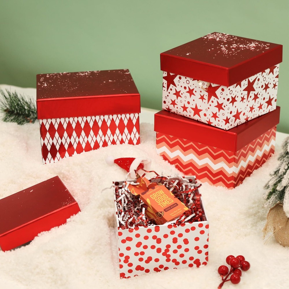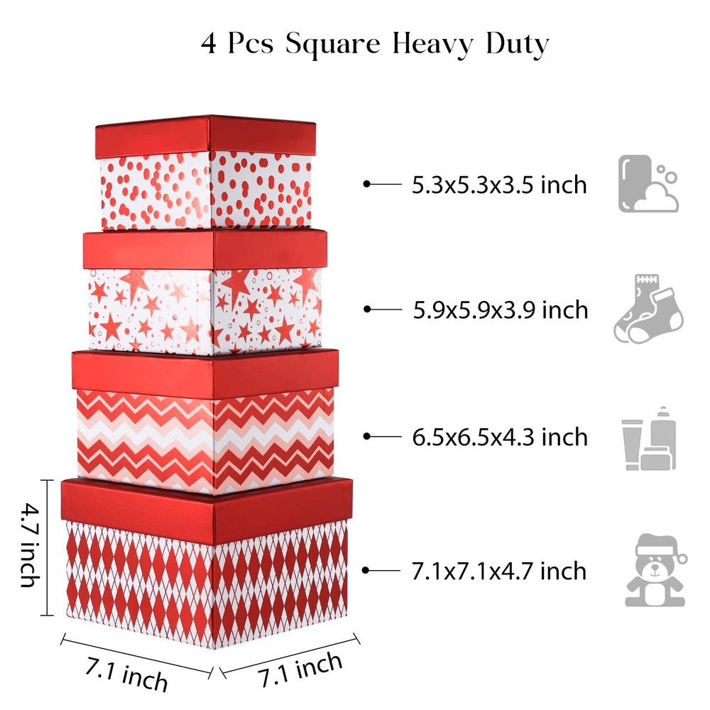 eBay Product Listing Welcome to Your Favorite My Store Your satisfaction is our top priority – Shop confidently 4PCS Christmas Nesting Gift Boxes Set, Metallic Red Foil Geometry Flat Square Cardboard Nested Box w/Lid, for Gift Wrapping Holiday Present Xmas Birthday, Valentine's Day, Assorted Size Item Gallery Item Description DECORATIVE HOLIDAY STORAGE ORGANIZER BOXES - Set of 4. Red Foil Finish, flat square shape with lid, stackable nesting gift box tower. Size range from XL to S, 7.1'', 6.3'', 5.9'', 5.3'', great for any small to medium gifts like books, candles, jewelry, cosmetics, small toys, home decor, apparel, scarf, and candies. READY TO GIFT, NO WRAPPING NEEDED VALUE PACK - The boxes each have a unique geometric shape, and they perfectly complement one another when assembled together. Can be stacked into a tower of gifts. Just put your gifts into these lovely boxes, get ready to wow your loved ones. It is a great Christmas gift box combo and gift packaging for families, women, kids, and senior citizens. READY TO USE, VALUE PACK GIFT BOX SET - Versatile premium gift packaging. Make your gift wrapping effortless to wow loved ones. Durable and reusable paper box set is excellent for elevating events and parties like thanksgiving, weddings, bridal showers, baby showers, birthdays, Christmas, Valentine's Day, Hanukkah, Easter, mother's day, anniversaries, housewarming. LOW CARBON IMPACT MATERIAL - Our philosophy is to create every product with sustainability in mind. Our materials are mostly made from recyclable paper, wood, and fabrics. We always prioritize fair pay to our staff and integrity in our supply chain. JOY IN GIFTING - Our lifelong love for pretty paper, colors, and textures the launch of , a bespoke gift-wrapping brand intended to share their passion for the art of gift wrapping with the world, A female-led small business in southern California dedicated to the art of gift-wrapping and aiming to bring joy to gift-givers. Special Features 4PCS Christmas Nesting Gift Boxes Set, Red Foil Geometry Flat Square Cardboard Nested Box w/ Lid, for Gift Wrapping Holiday Present Xmas Birthday, Assorted Size Our Guarantee To You We offer fast shipping, free delivery, and 100% customer satisfaction guarantee. Not satisfied? Return your item for free within 30 days. 30-Day Free Returns Shipping Details Items will be sent to your eBay address. Please verify before purchasing. Typical delivery within 3-7 business days. Professional shipping services used for all orders. We ship to the continental US (48 states only). Unable to deliver to Alaska, Hawaii, or territories. No APO/FPO or PO Box deliveries available. We use eco-friendly packaging Payment Options We accept these secure payment methods: All transactions securely processed through eBay's payment system. Simple Returns 30-Day Satisfaction Promise Contact us through eBay messages within 30 days of delivery. We'll provide return instructions and our address. Return the item in its original condition. We'll process your refund within 48 hours of receiving the item. Get In Touch Have questions about your order? Contact us through eBay messaging for prompt assistance. We typically respond within 24 hours.