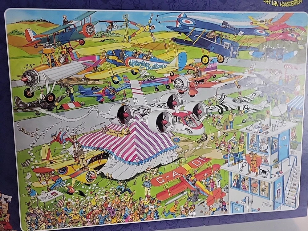 Air Show Assembled 1x then neatly bagged 90cm x 60cm Airplanes airshow biplane skydiver fun funny puzzle to put together Comedy Jan Van Haasteran Jigsaw Puzzles Jan Van Haasteran Puzzles - Jan Van Haasteren was born in 1936, in Schiedam, The Netherlands. He has been creating humorous illustrations exclusively for Jumbo puzzles. His dedicated fans immediately search for his trademark – a shark fin – in each new jigsaw puzzle that comes out! Jigsaw puzzles by Jan Van Haasteran are a joy to put together! Jan Van Haasteren creates cartoon jigsaw puzzles that are crowded, silly, and even include a secret hidden shark fin. Jan Van Haasteren puzzles on sale now! Jan van Haasteren is a comic artist who has created these crowded and funny cartoon puzzles that are very silly and enjoyable even for adults. Every cartoon he creates features a hidden shark fin, can you find i