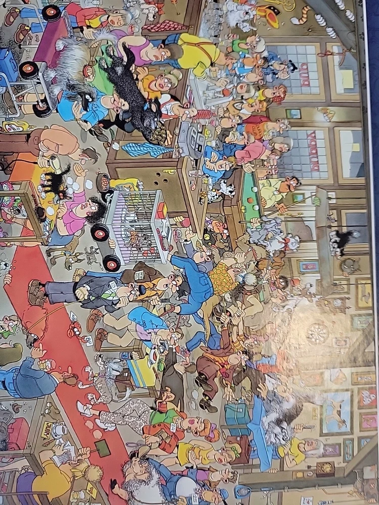 The Dogshow 2009 90cm x 60cm Rare puzzle Jumbo Was assembled 1x and bagged neatly Puppy cats dogs Grooming pets puppy pup fun fun puzzle to assemble Jan Van Haasteran Jigsaw Puzzles Jan Van Haasteran Puzzles - Jan Van Haasteren was born in 1936, in Schiedam, The Netherlands. He has been creating humorous illustrations exclusively for Jumbo puzzles. His dedicated fans immediately search for his trademark – a shark fin – in each new jigsaw puzzle that comes out! Jigsaw puzzles by Jan Van Haasteran are a joy to put together! Jan Van Haasteren creates cartoon jigsaw puzzles that are crowded, silly, and even include a secret hidden shark fin. Jan Van Haasteren puzzles on sale now! Jan van Haasteren is a comic artist who has created these crowded and funny cartoon puzzles that are very silly and enjoyable even for adults. Every cartoon he creates features a hidden shark fin, can you find i