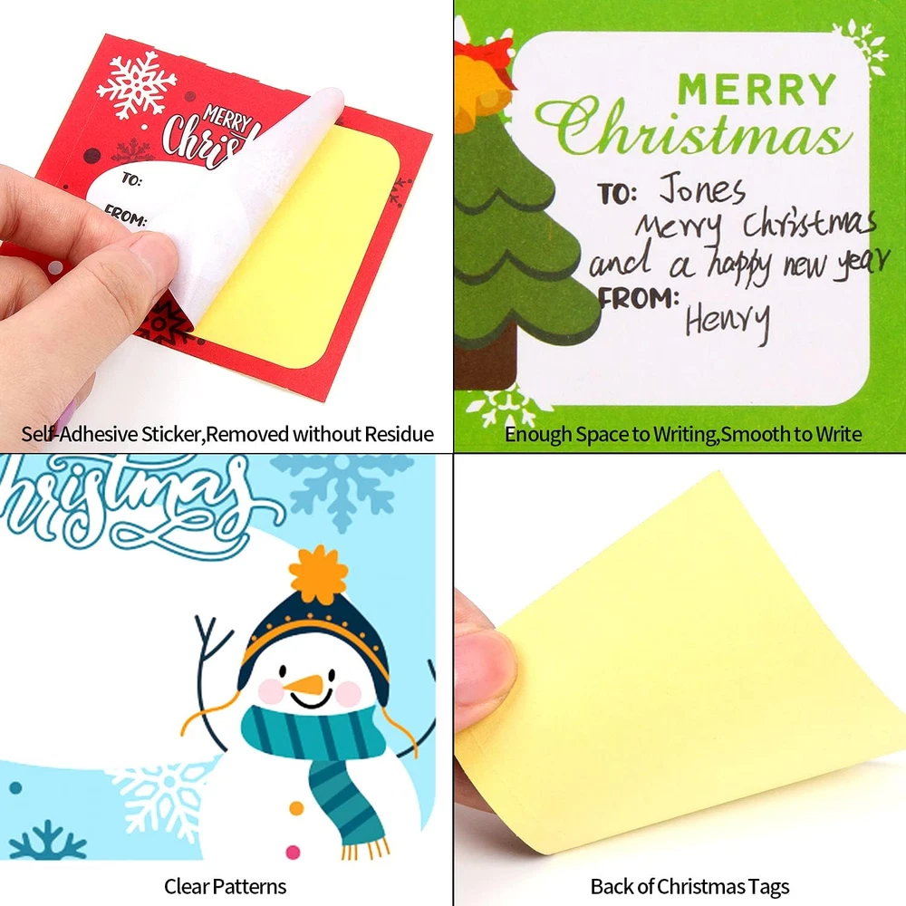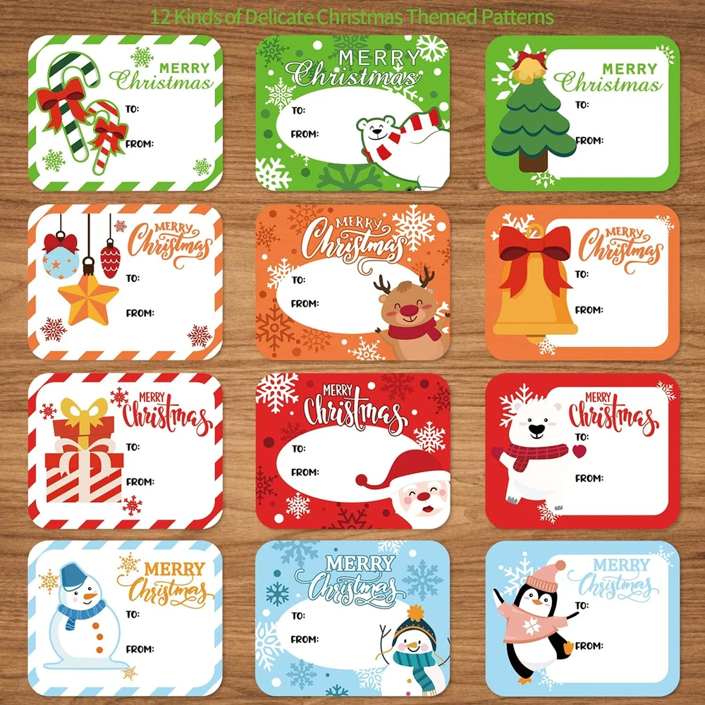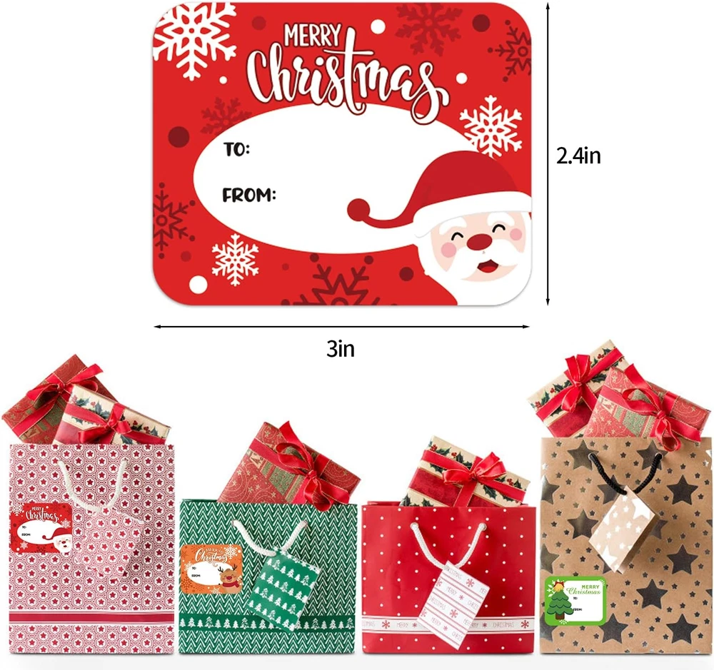 Classic Christmas Design:Colorful and lovely Christmas theme color design, including green,red,light blue,white and orange.Christmas Presents Labels contain various Xmas elements,such as Santa Claus,Christmas tree,snowman,Christmas gifts,reindeer,Merry Christmas.Enough quantity to decorate holiday presents Packaging:You will get 120 pieces jumbo Christmas gift tags in 12 different patterns packaged individually, these self adhesive stickers are good tags for gifts; Enough quantity to use and share with friends or family Easy to Peel and Apply:The Christmas self adhesive sticker has a clear pattern, and special design to peel easily. Meanwhile adheres well to most flat surfaces and not easy to fall off. The Christmas name tags will not leave residues on the gift Jumbo Size: Outer Dimension of Christmas gift tags is 3.4 x 2.8in/8.5cm x 7cm.Core size is 3 x 2.4inch/7.5 x 6cm.The standard size for various occasions,sufficient space for your writing Wide Applications:You can stick these Christmas name stickers on gift bags, goodie bags,Christmas card,envelopes and snack bags, etc. Great decorative and practical art decals Product Description Why Choose Us: 120 PCS Jumbo Christmas Gift Tags self-adhesive have 12 different patterns,give you multiple choices for different gifts,coordinate with other Christmas packaging make your gifts extra special this year Features: 1.Jumbo Size Christmas tags for gift,Core size is still 2.4x3inch(Outer Dimension 2.8x3.4in) 2.Classic Christmas Design elements,such as Santa Claus,Christmas tree,snowman,Christmas gifts,reindeer,Merry Christmas 3.Packaged individually and the brightest colors including Christmas red,Christmas green,white,light blue and orange 4.Printed with "TO" and "FROM",enough space to write smooth 5.Clear patterns,self-adhesive present labels,Removed without residue 6.120 Pieces Christmas tags stickers,12 styles,enough quantity Great decor for your family and friend Jumbo size Xmas gift sticker label,core size is still 2.4x3inch The brightest colors including Christmas red,Christmas green,white,light blue and orange