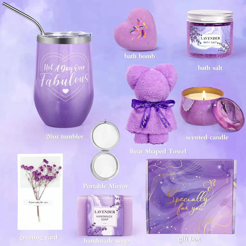 Christmas Gifts Set for Women,Self Care Basket Bath Sets for Women ,Relaxing Spa Gift Basket Set for Her Mom Sister Wife Best Friend Happy Birthday Gifts Basket for Women Item Description Practical 8pcs Gifts Set for Women: This dazzling well-designed gift box contains 8 adorable and unique gifts for women, it contains 1*beautiful 20oz wine tumbler, 1*portable mirror, 1* scented candle , 1*bear shaped towel, 1* bath bomb, 1*bath salt, 1*handmade soap, 1*greeting card Practical and Exquisite Tumbler: This gift set for women includes a large capacity stainless steel tumbler with straw and lid for cold and hot drinks, it's portable to enioy a variety of coffee, juice, milk and more anywhere Impressing Gift for Women : This exquisite gift packet is exclusive designed, it is perfect for mom, friends, sister,wife,girl friend or anyone who you care, is a great self care gifts for women,why not express your love by this gift Relaxing Gifts for Women:This gift set is a great surprise for women. The beautiful purple gift box includes 8 great gifts for women ,which is suitable for all occasions such as Birthday, Mother’s Day, Valentine's Day, Anniversary, Graduation and Christmas Relaxing SPA Gift Set:Finish the exhausting work and enjoy a delightful spa! Our scented candles and bath salt are made with natural ingredients, it's a great SPA gift for women,she will love this thoughtful gift › See more product details This large capacity stainless steel tumbler with straw and lid for cold and hot drinks, it's portable to enioy a variety of coffee, juice, milk and more Our scented candles is made with natural ingredients, it's a great SPA gift for women,she will love this thoughtful gift Try enjoying the relaxation and comfort of a bath with natural bath salts and handmade soaps - what a perfect gift! Payment We accept payment only through PAYPAL Shipping We ship products worldwide through standard express courier service, it will reach within 7 to 10 days to abroad buyers, we ship the product after recieved clear payment and give full information about shipment to the buyer Return We accept product return within 7 to 21 days from delivery date but product should be in original position and not in damaged condition,the return shipping charges will be buyer responsibility