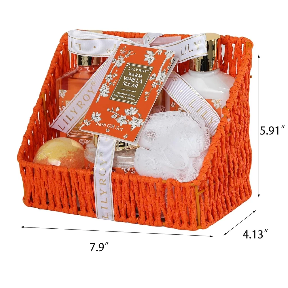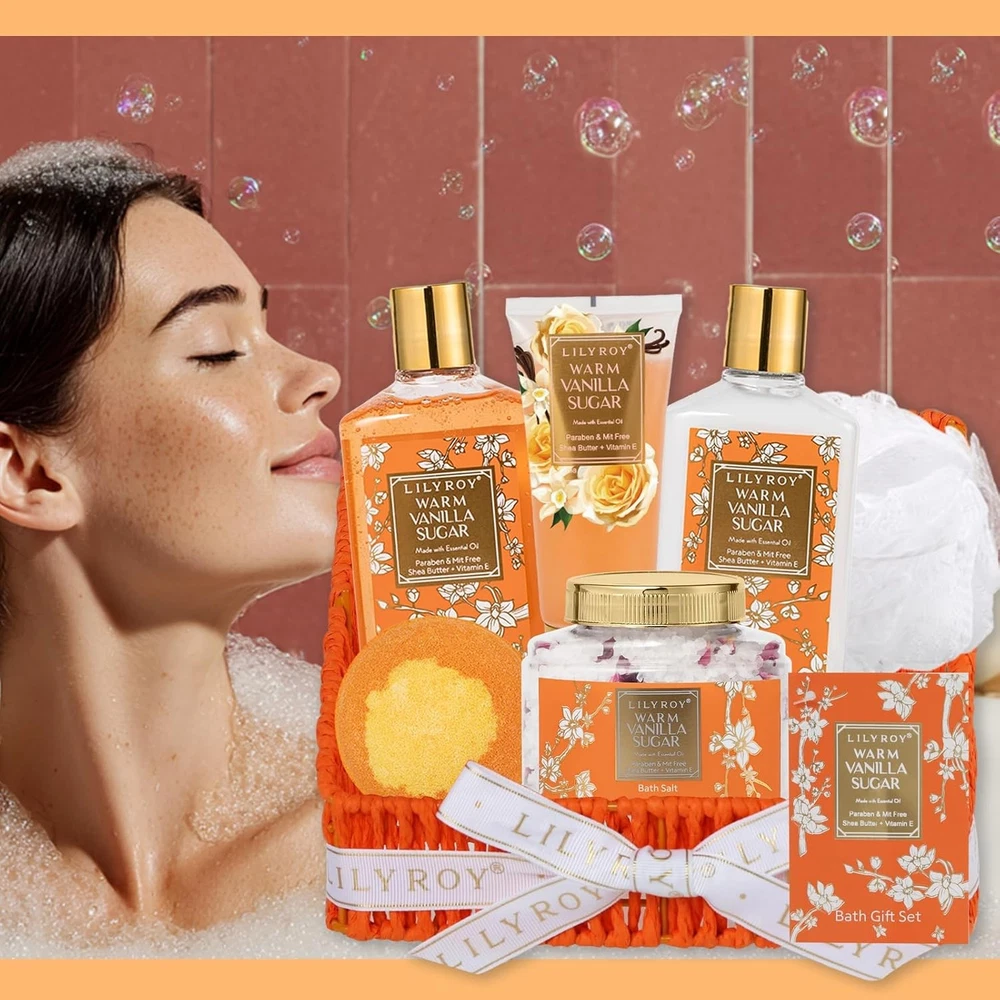 Christmas Gifts for Women - 7 Pcs Vanilla Bath and Body Gift Basket Set Spa Gift Basket Set for Women with Bath Bomb | Perfect Valentine's, Birthday, Mothers Day for Mom, Gift Set for Her All Occasion Description Features: 7 PCS SPA GIFT SET: Shower Gel, Body Lotion, Bubble Bath, Bath Salt, Bath Sponge, Bath Bomb packaged in a nice beautiful luxury Basket. The spa gift sets for women offer the most luxurious and perfect bath experience PERFECT HOLIDAY GIFT SET FOR WOMEN: Leave the ordinary behind when you lavish yourself on the soft, feminine fragrance of fresh Vanilla, and make you feel tropical like a holiday. The scent smells fresh BATH AND BODY GIFT SET: Great gift baskets for women on Valentine's Day, Mother's Day, Father's Day, Anniversary, Birthday, Christmas. The recipient will like it GOOD INGREDIENTS: Lily Roy's bath gift set for women contains premium quality and Mit-Free, Paraben-Free, and Cruelty-Free Essentials that are rich in Shea Butter and Lavender Essential Oil to help moisturize and soothe the skin COMES WITH A REUSABLE BASKET: Its upscale and beautiful basket makes a multi-purpose storage solution to keep your beauty essentials. It also creates a unique decoration for your bathroom, vanity table, powder area, and more. It also has a gift note card for you to personalize it Product Details: Scent: Warm Vanilla Sugar 2 Brand: LILY ROY Product Benefits: Brightening, Cleansing, Moisturizing, Nourishing, Smoothing, Soothing Skin Type: All Special Ingredients: Essential Oil, Shea Butter, Vitamin E Handling We will ship all orders within 1 business day of payment. Delivery We Do Not Ship Outside of the Continental US. Return Policy All items qualify for returns within 30 days of receipt. Buyer is responsible for return shipping on any item that is not damaged. Feedback We take our reputation seriously, we buy and sell online, so we understand the value of trust. If you are unsatisfied with your order, please contact us and we will work with you to resolve it to your satisfaction.