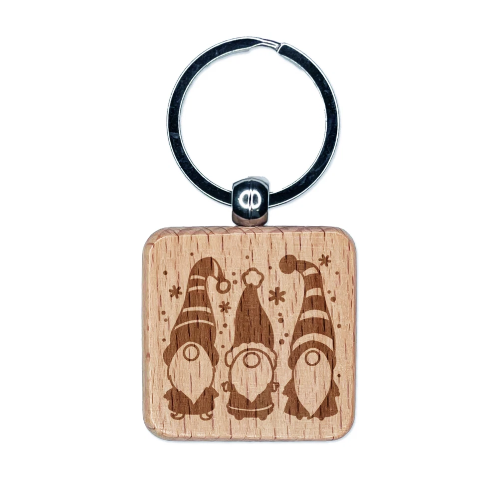 Christmas Gnome Trio Engraved Wood Square Keychain Tag Charm