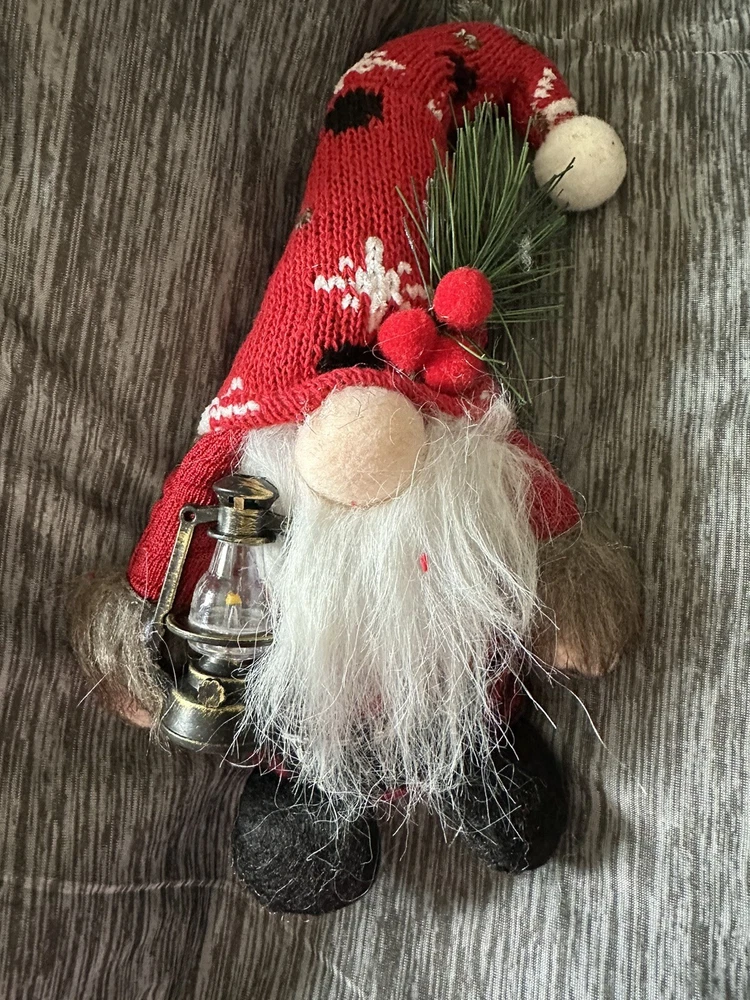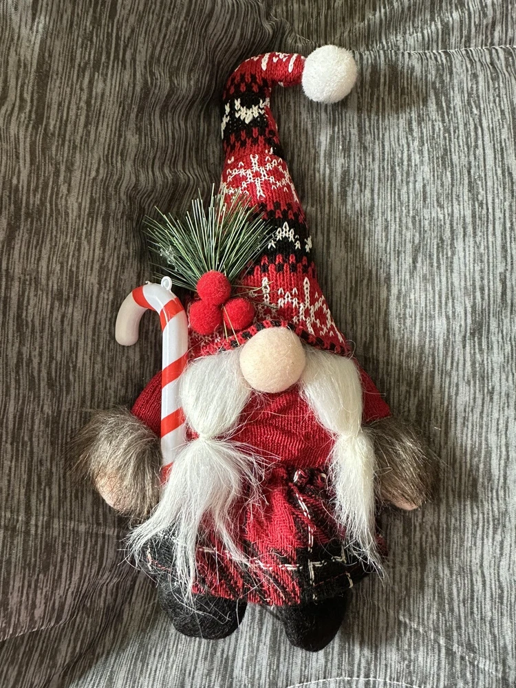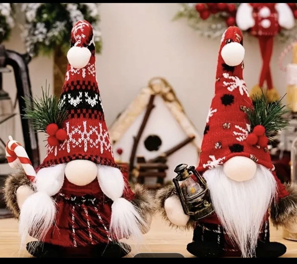 Add some festive charm to your Christmas decor with this set of two knitted Christmas gnomes. One gnome holds an oil lamp, while the other holds a candy cane, making them the perfect addition to your holiday display. The red and black plaid design adds a touch of holiday cheer to any room in your home. These gnomes are perfect for Christmas enthusiasts who love to decorate their home during the holiday season. Bring some unique charm to your Christmas decor with these delightful gnomes.