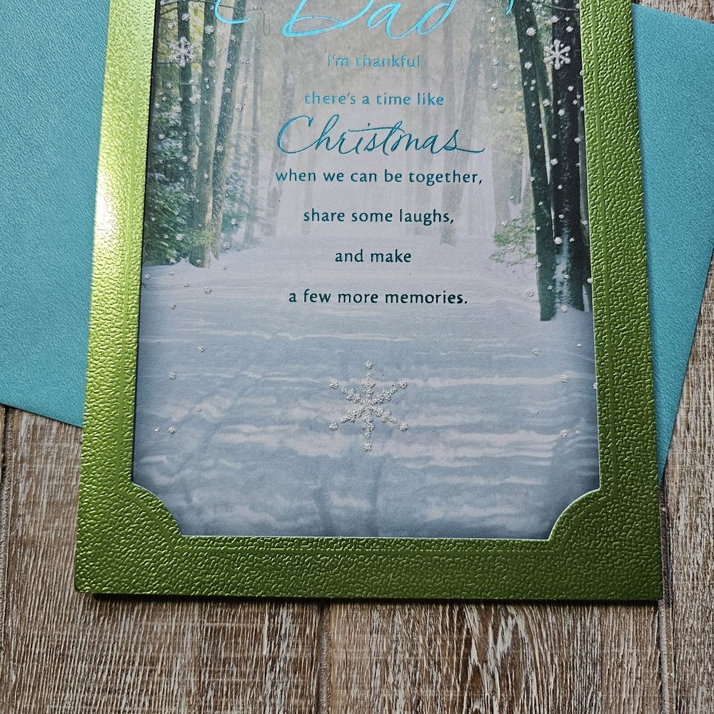 Hallmark Christmas Greeting Card For Dad Green Blue Metallic Snow Glitter Full Size 5.5 x 8 inch card This listing is for a single card and matching envelope in new condition. Click here to add a personalized label to the inside of your card. Search thousands of cards for all occasions in our eBay Store . Our cards ship with limited tracking via USPS First Class. Standard delivery time is 5-7 days but may take up to 10 days.