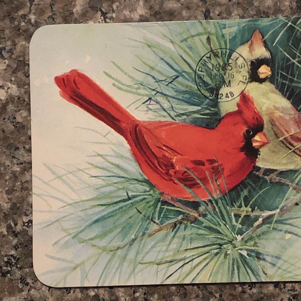 This vintage Christmas postcard features a charming scene of birds perched on a tree with pine needles, including a cardinal. With its postcard birds theme and holiday occasion, it captures the essence of the Christmas season. The printed lithograph design and the fact that it is an original piece from the 1980s add to its collectible value. Made in the United States, this postcard is a unique and nostalgic piece that would make a delightful addition to any Christmas card collection.