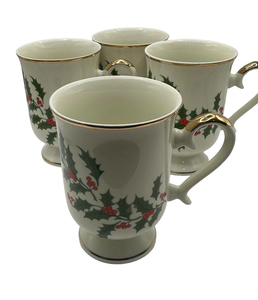 Set of Four (4) Christmas Holly/Berry - Fine China of Japan - Vintage Retired Pattern 1989 FOOTED MUGS - Holly Pattern Description: White Body with Green Holly Red Berry Berries; Gold Rimmed Dimension: 4-3/8"H x 3"Diameter - Mugs are in great condition, Gold-Rim is solid; without chips, cracks or crazing. Set will ship USPS Ground Advantage Tags: Vintage Christmas Footed Mugs, Irish Coffee Mugs, Holly and Berries, Made in Japan, Holiday Mugs, Christmas Mugs, Christmas Dining #1456