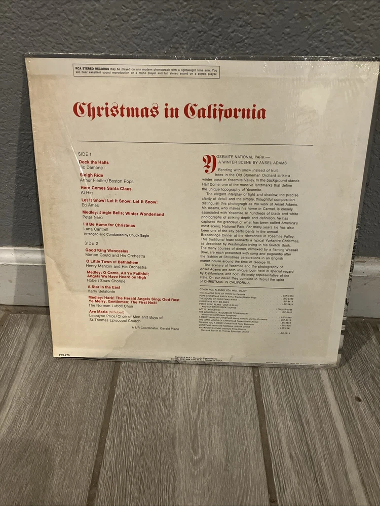 Genre:HolidayRecord Grading:Near Mint (NM or M-)Occasion:ChristmasCountry/Region of Manufacture:United StatesRelease Title:Christmas In CaliforniaRelease Year:1968Features:SamplerFormat:RecordCase Type:Cardboard SleeveLanguage:EnglishMaterial:VinylInlay Condition:Excellent (EX)MPN:PRS-276Record Size:12"Sleeve Grading:Excellent (EX)Edition:StereoType:LPUPC:Does Not ApplyVinyl Matrix Number:WNRS-2347--5S B1 HRecord Label:RCA VictorColor:BlackArtist:Al Hirt, Ed Ames, Harry Belafonte, Various, Vic Damone, Arthur Fiedler, Boston Pops, Peter Nero, Lana Cantrell, Morton Gould And His Orchestra, Henry Mancini And His Orchestra, Robert Shaw Chorale, The Norman Luboff Choir, Leontyne Price, Choir Of Men And Boys Of St. Thomas Episcopal ChurchEra:1960sCatalog Number:PRS-276Speed:33 RPMStyle:1960s, Chorale, christmasgtin13:Does Not Apply