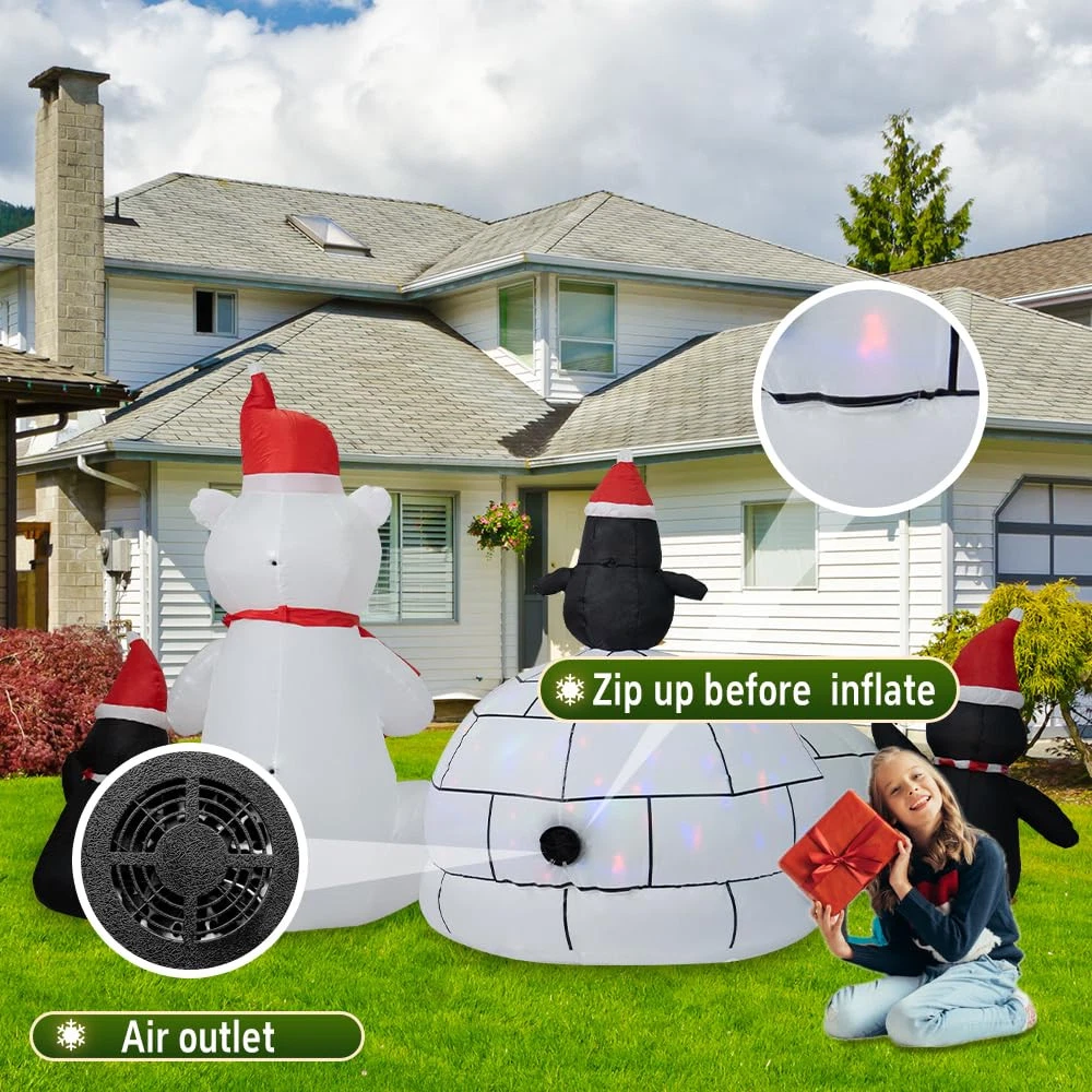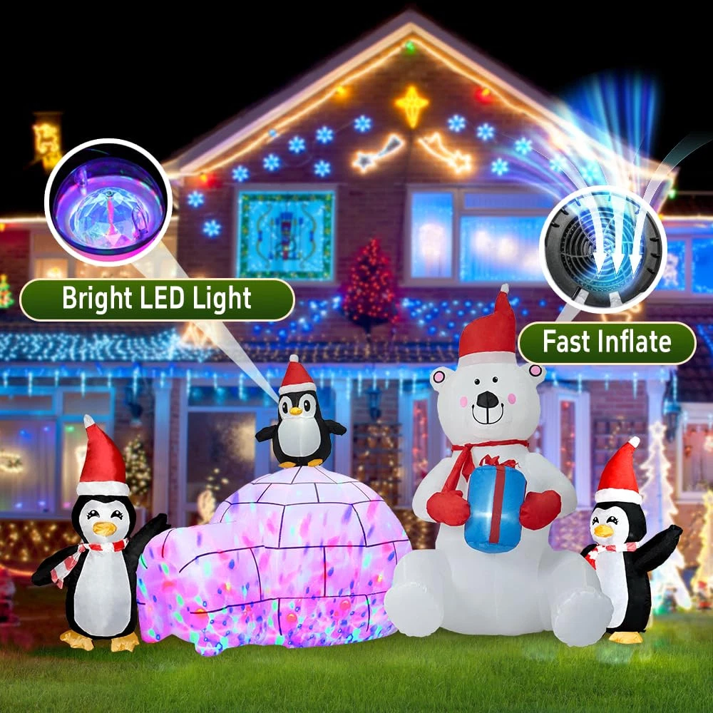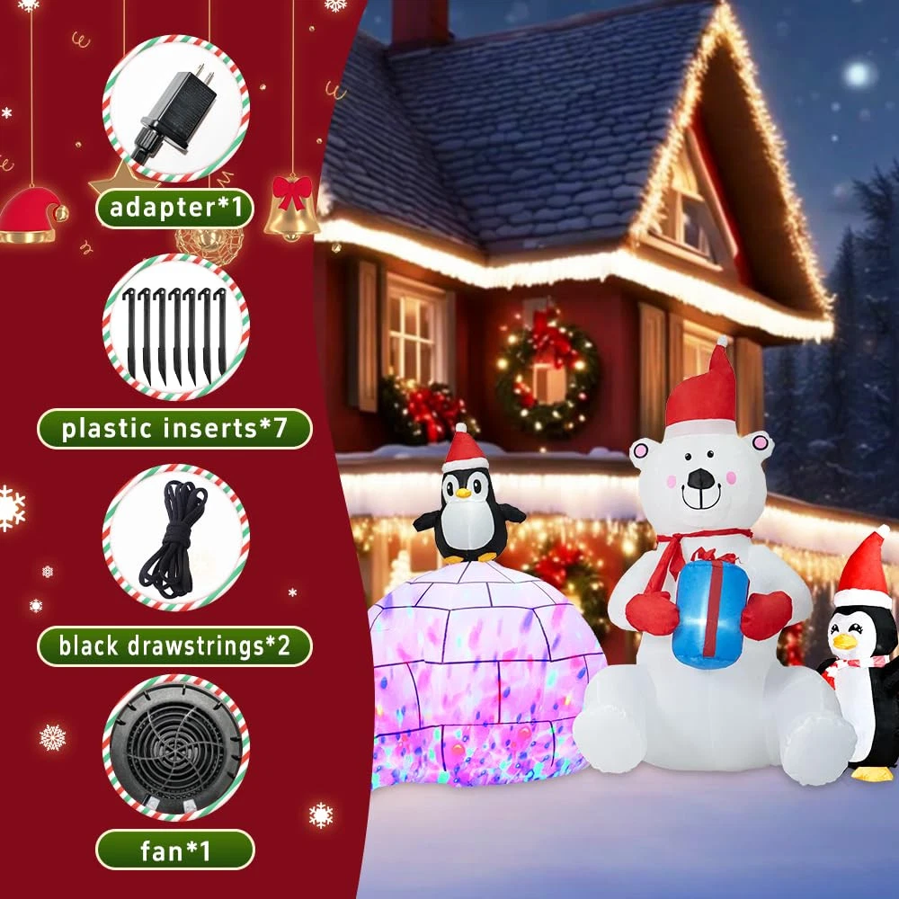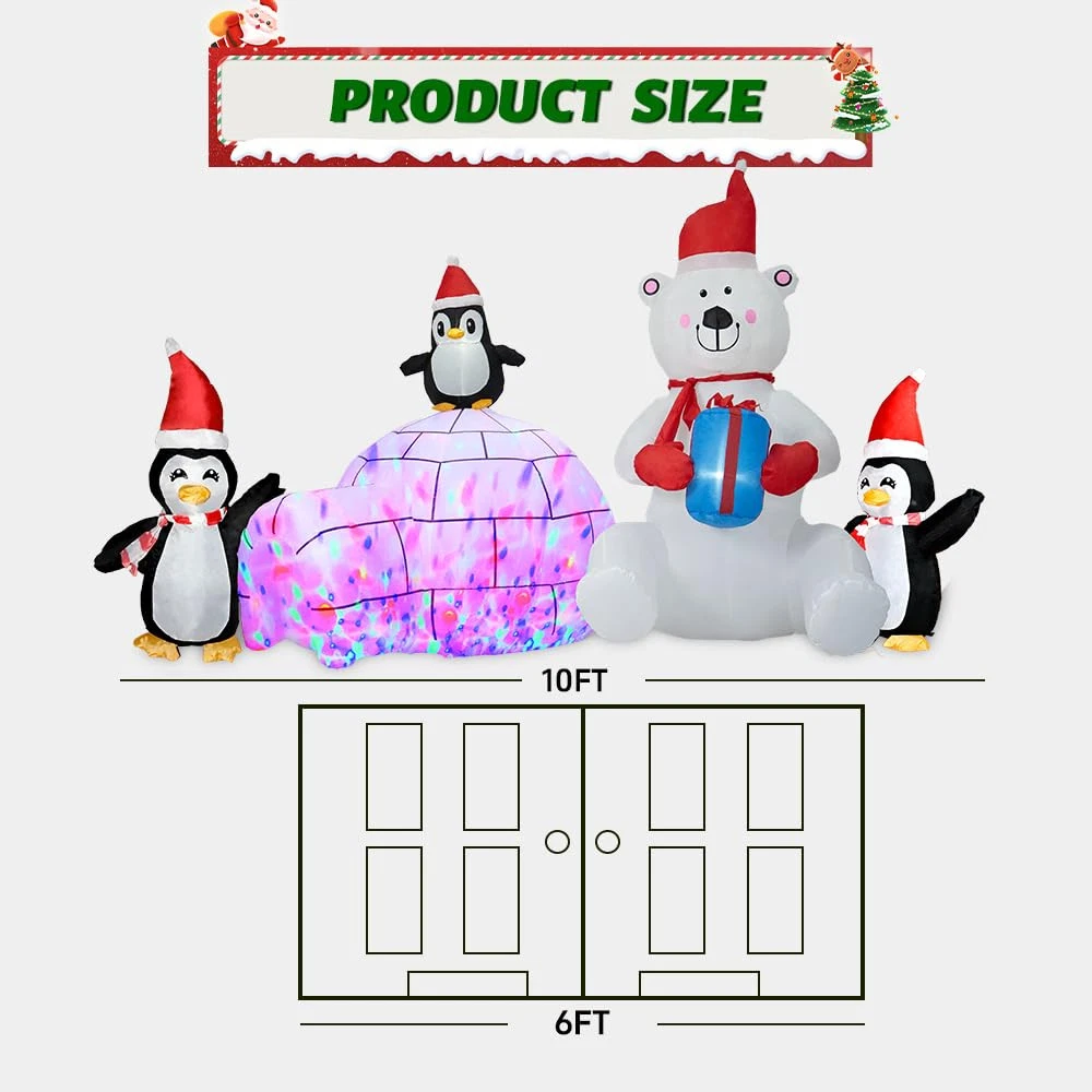 【10FT Chirstmas Polar Bear Decoration】 10 Foot long Polar Bear with its dazzling rotating light igloo will make a great hospitable impression for your front lawn. who can possibly say no to a cute polar bear and his whole family, coming through thousands of mountains and rivers, gives his best wishes for Christmas, adding joyful and delighted atmosphere to the holiday. 【Kaleidoscope Lighting Effect in Igloo】 This Chirstmas inflatables decoration has a built-in automatically rotating light ball which will catch all the attention from your kids, neighbors and friends at Christmas. They must fall in love with this blow up inflatable decor at the first sight! Try it and you will believe it. 【Self-Inflates & Easy to Store】 Equipped with a powerful blower, simply place the Christmas Inflatable Decoration on the ground and turn on the power, it can be quickly inflated in minutes. Secure it with 2 ropes 5 inserts and 2 moveable sandbags in the package. Storage is simple and compact. Just roll up the Christmas yard decorations and put it in the box for storage. 【Waterproof Material for Outdoor Use】 This outdoor Christmas decor is made of high-quality polyester waterproof material, strong enough to withstand rips, tears, and outdoor weather. The excellent stitching improves the durability of the Christmas blow up yard decorations. 【Best Christmas Decoration for Any Occasion】 Great for indoor, outdoor, front yard, lawn, garden, stage props, party, restaurant, cafe, home, party, Christmas, holiday, festivals, vacations, Mardi Gras, New Year's Day, gifts. Holiday blow-ups for parties and More!