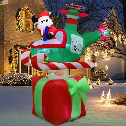 30 Days Return Policy Fast Delivery Trusted seller Christmas Inflatables Outdoor Decorations, 6FT Inflatable Xmas Santa Claus with Helicopter on Gift Box, Lighted Blow Up Santa Flying Airplane, Built in Light for Holiday Lawn Yard Garden Decor Product Description Christmas Inflatable Decorations: Our 6 feet tall Xmas inflatable outdoor decor portrays Santa Claus piloting a helicopter with spinning propeller, landing on a large, red gift box, making for an amusing and memorable holiday scene. It adds an eye-catching centerpiece to your holiday seasonal layout and makes it big and attractive Christmas decorations around. With led lights inside, light up at night and make your home a new sight in your neighborhood Great Quality: This outdoor Christmas decoration is made of thickened waterproof polyester fabric to ensure years of usage. Standing tall and brightly colored, it creates an eye-catching spectacle sure to make passersby smile and turn heads. Please make sure the air blower is facing up when inflating. The air blower facing the ground will affect the effect of inflating Self-Inflates in Minutes: Our Christmas yard inflatable is easy to install, just plug it in and watch as the holiday inflatable self-inflates in minutes, coming to life. Everything pops up in a moment! Don't forget to zip up the bottom zipper. For storage simply let the air out and fold it Reinforced Tie-Downs: 6 Ground stakes and 4 tethers are provided for tie-down. Built-in fixed sandbag, an opening at the bottom with a zipper provides space for adding some heavy objects to make it more secure and stable. No need to worry that your Christmas yard inflatables will fly away with the wind Eye Catching Holiday Decorations: With the inflatable Xmas Santa Claus in helicopter on gift box decor, you're not just adding another decorative item to your Christmas holiday collection, but a center of fun and attraction, sure to be enjoyed by both kids and adults. It can be used for decor front door, yard, lawn and garden, Christmas parties, and New Year's party. If outdoor use, please keep the fan and adapter dry, can not submerge them in water Shipping Returns Payment Shipping Shipping is FREE to all addresses other than APO/PO boxes in the lower 48 states. All our stock ships from US-based warehouses. Shipped via USPS or UPS (depending on location and package weight) Unless stated otherwise, all orders will ship within 24-72 hours of your payment being processed. Check our feedback to see the great reviews of FAST shipping we offer. Returns As our valued customer, we will do our best to make sure the product you receive arrives to you on time and as expected. If you are not satisfied with your purchase, please contact us within 30 days of receiving your order to process a return. Payment We currently accept payment via eBay managed payments only. Once payment is cleared, we will dispatch your shipment within 1-3 business days. Please refer to the "Shipping" tab for more information regarding shipping speed to your destination.