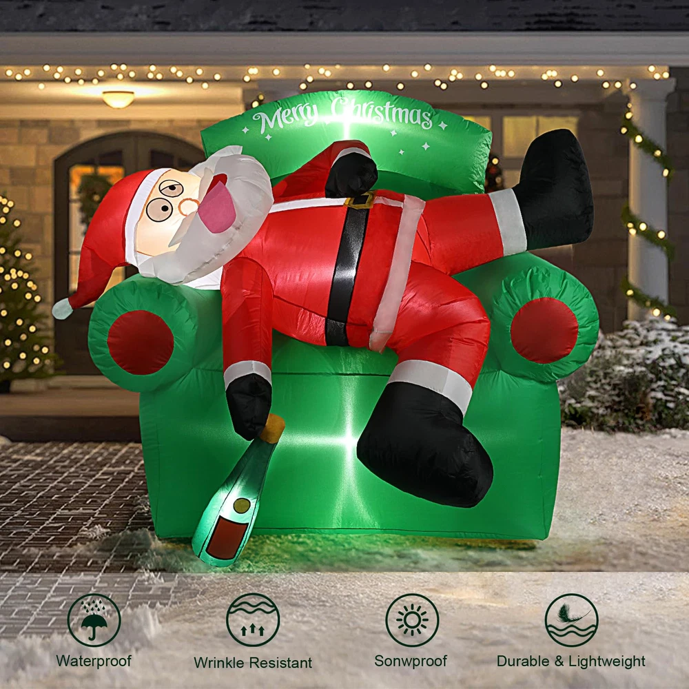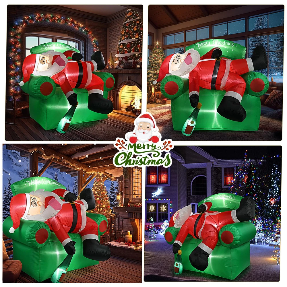 【Create Merry Christmas Atmosphere】: funny Santa Claus lying on the sofa Christmas decorations outdoor. It will bring a Exciting vibe to your outside Christmas decor. Your guests will be intrigued by its eye-catching appearance, making them feel like they are stepping into a winter wonderland. They will absolutely love it! 【Easy to Set Up】: Simply turn on the built-in fan and watch as this Christmas Santa Claus blow up yard decorations come to life in a matter of minutes. Note: Zip up the bottom and not attempt to inflate this Santa inflatables outdoor decorations during unusually strong wind and raining day. 【Funny Christmas Inflatables Outdoor Decorations】: Thanks to its weather-resistant material, this 6 FT Christmas couch decor & Santa blow up yard decorations is able to withstand wind, rain, and other harsh outdoor elements. Use it year after year to add a touch of warmth to your outdoor space during the Christmas holiday. 【Complete Accessories of Christmas blowups】: You will get not just a combination of inflatable Santa and Christmas couch inflatables, but also 2 water bladders, 3 tethers, 7 stakes for securing our Christmas tree inflatables outdoor decorations onto the ground and a detailed instruction manual. 【Widely Suit for】: Are you currently bothered about choosing inflatable Christmas yard decorations? Not only is this merry Christmas tree inflatable perfect for decorating your garden & yard, but it also works well as thanksgiving inflatables outdoor decorations. Trust me, your child will love this funny Christmas gifts for kids, order now and get ready for wonderful Christmas with child!