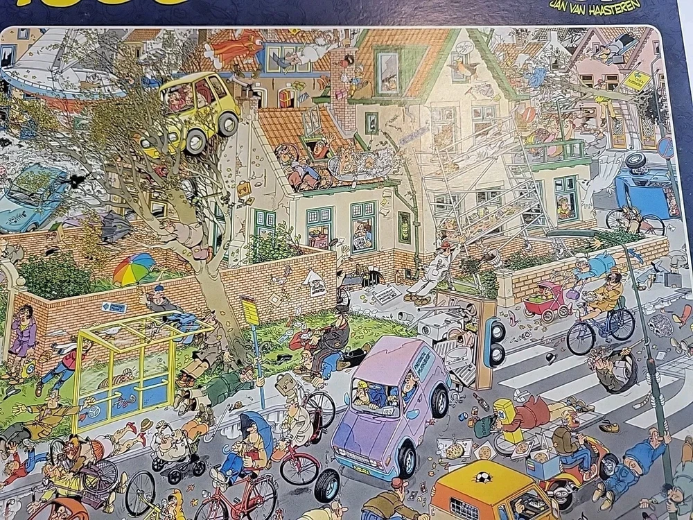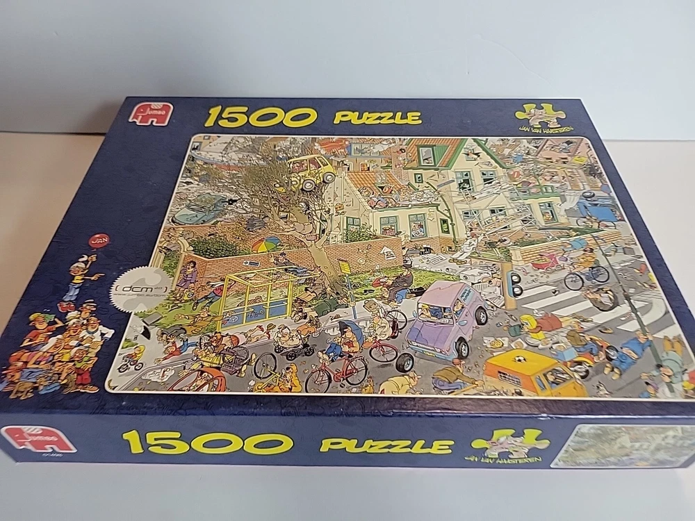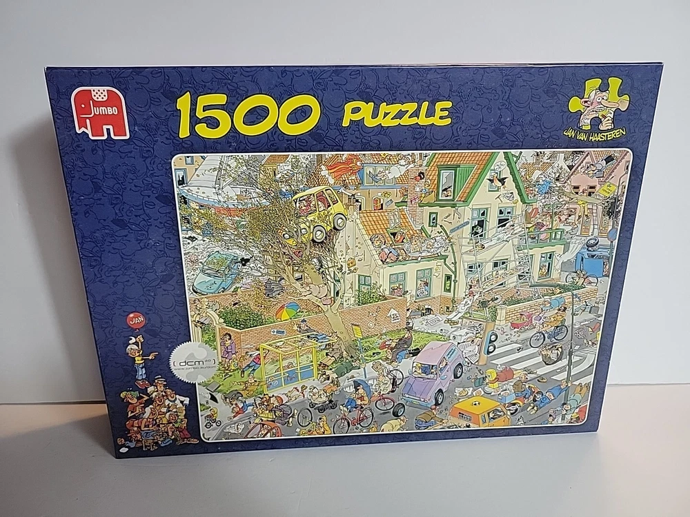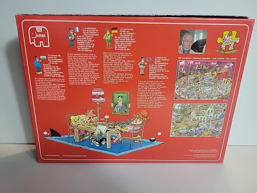 Box opened. Puzzle piece bags sealed THE STORM Jan Van Haasteran Jigsaw Puzzles Jan Van Haasteran Puzzles - Jan Van Haasteren was born in 1936, in Schiedam, The Netherlands. He has been creating humorous illustrations exclusively for Jumbo puzzles. His dedicated fans immediately search for his trademark – a shark fin – in each new jigsaw puzzle that comes out! Jigsaw puzzles by Jan Van Haasteran are a joy to put together! Jan Van Haasteren creates cartoon jigsaw puzzles that are crowded, silly, and even include a secret hidden shark fin. Jan Van Haasteren puzzles on sale now! Jan van Haasteren is a comic artist who has created these crowded and funny cartoon puzzles that are very silly and enjoyable even for adults. Every cartoon he creates features a hidden shark fin, can you find it?