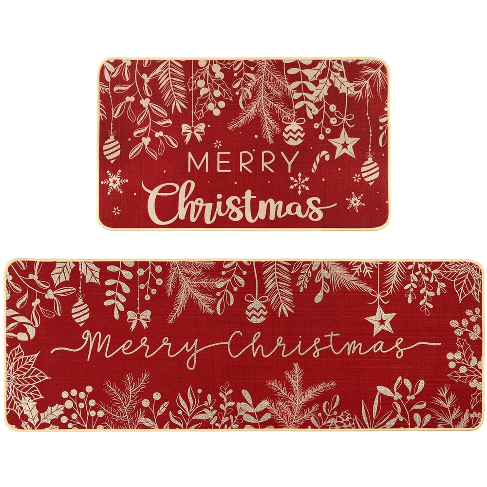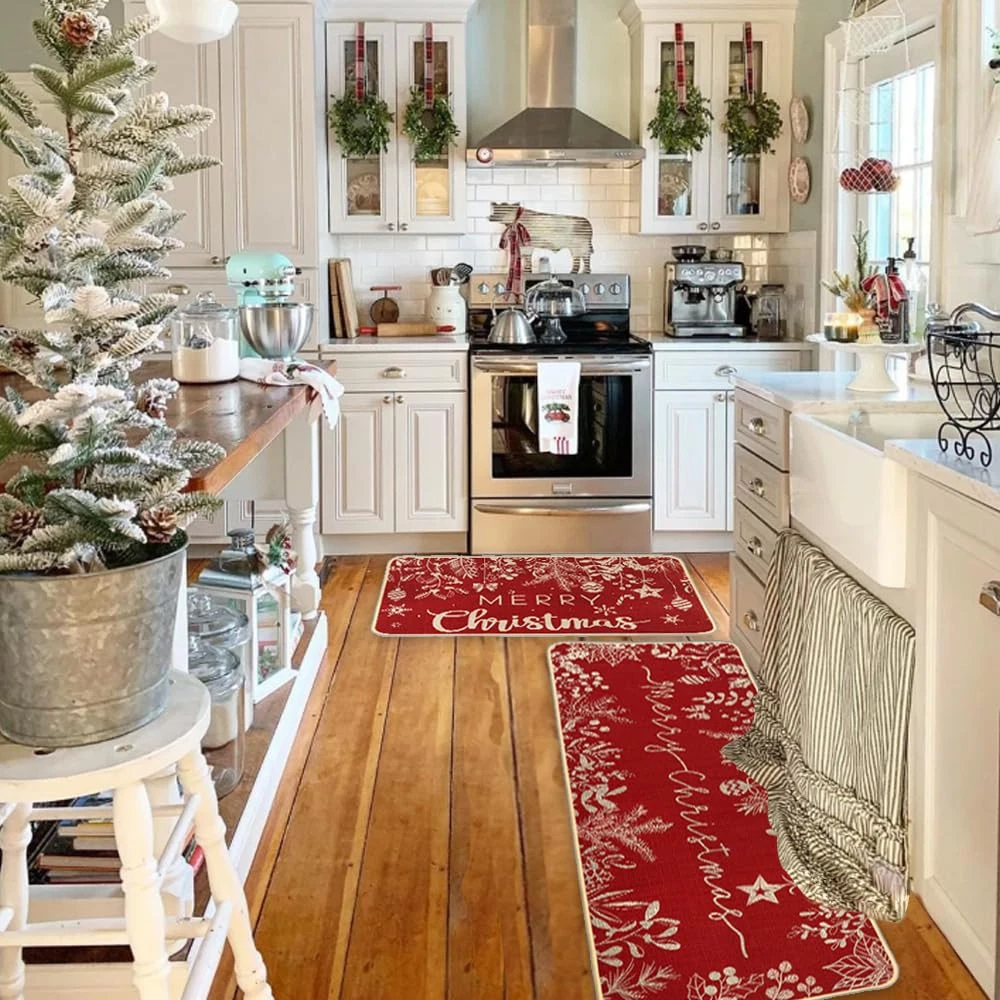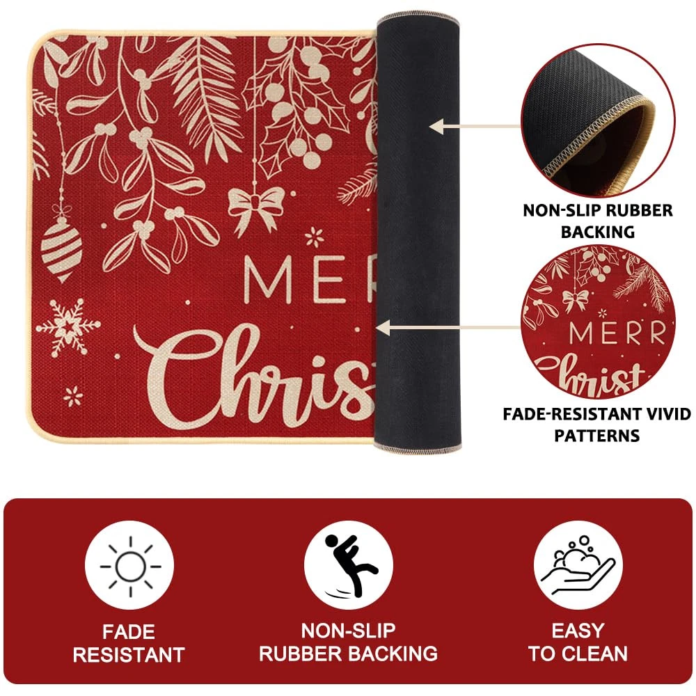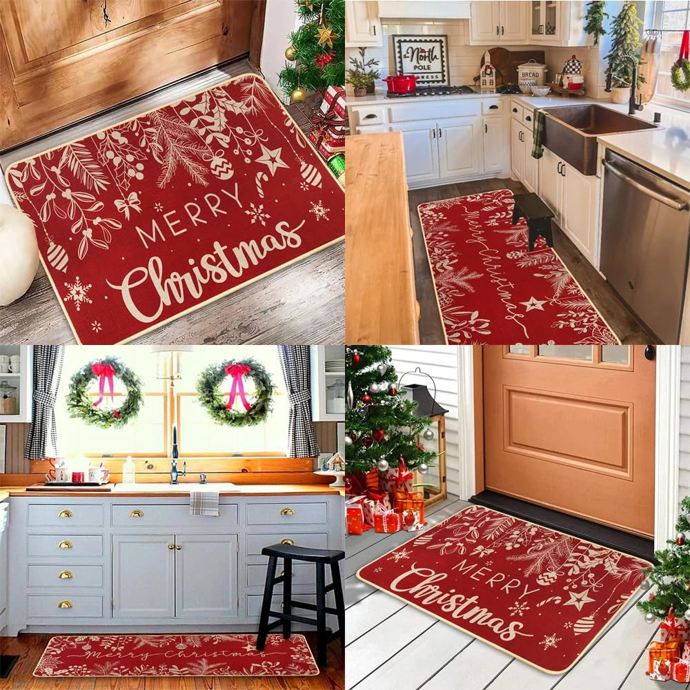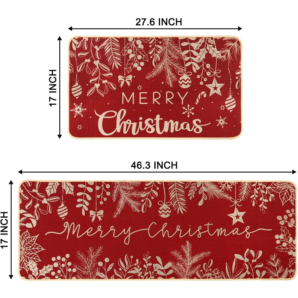 Kitchen Rugs Valuable Packages: You will get 2pcs of Christmas kitchen rugs, small size 43*70cm/17*27.6IN, large size 43*117.5cm/17*46.3IN, different sizes of floor mats, not only can meet your different needs, but also can add festive atmosphere. Premium Material: The back of the Christmas mat is made of high-quality rubber, and the front is made of high quality polyester, which is more wear resistant and non-slip. The advanced printing technology makes the pattern clear, the color is bright, not easy to fade. The surrounding suture craft is more lasting to add atmosphere to your holiday. Unique Design: Christmas kitchen mats using red as the main color, coupled with the embellishment of pine needles, more beautiful, it can be well matched with Christmas decoration together, add a strong atmosphere for the holiday, as a holiday decoration is a good choice. Easy to Clean: The Christmas bedroom mat is easy to clean, the surface has oil or other stains, cleaning can use a soft cleaner, wipe gently with a sponge, rinse with water, can not bleach. Widely Used: Christmas bathroom rugs can not only be placed in the bedroom door, bathroom door, kitchen and other places you want to decorate, can be well matched with other decorations, not only can add atmosphere to the holiday, but also as a gift to friends, enjoy the happiness of the holiday together.