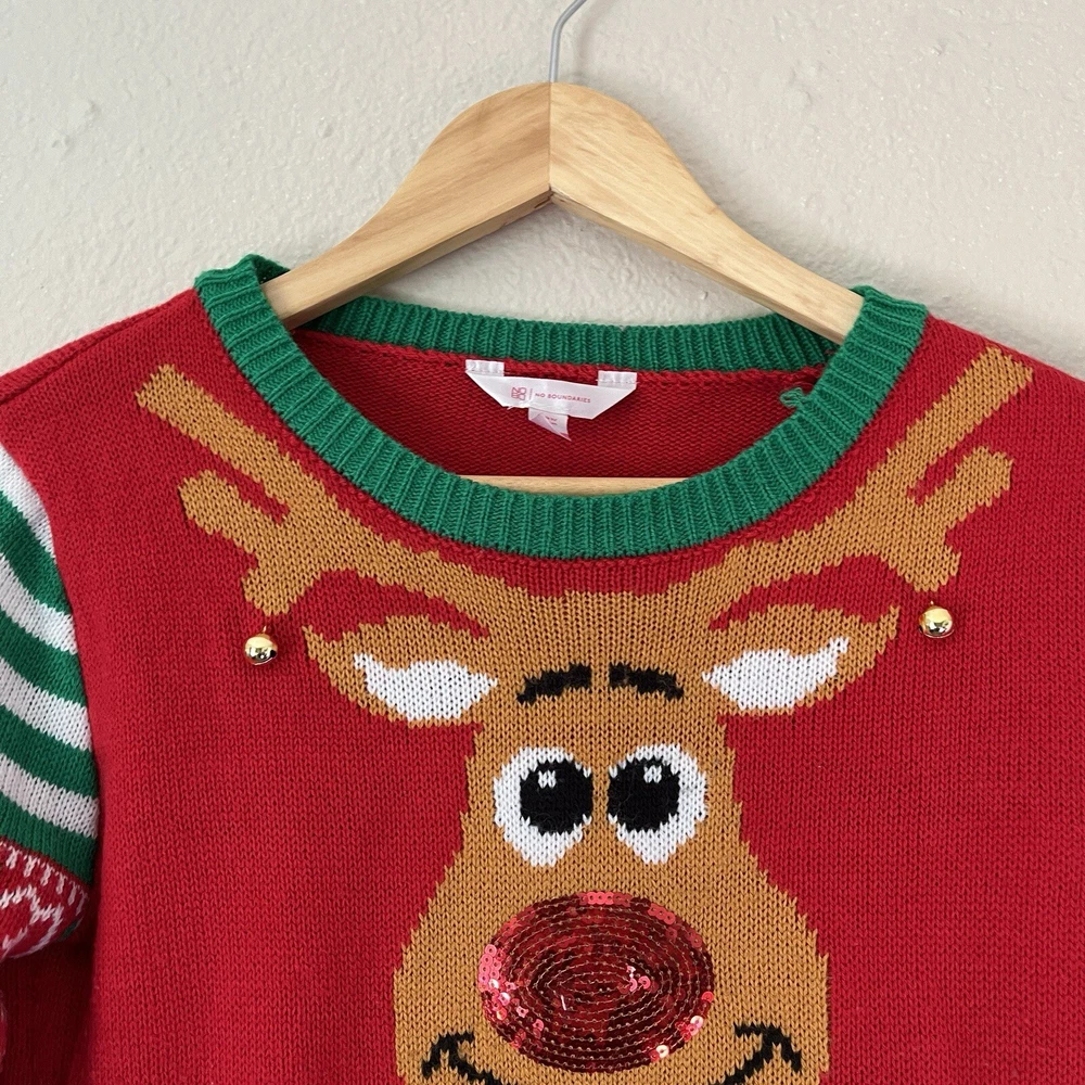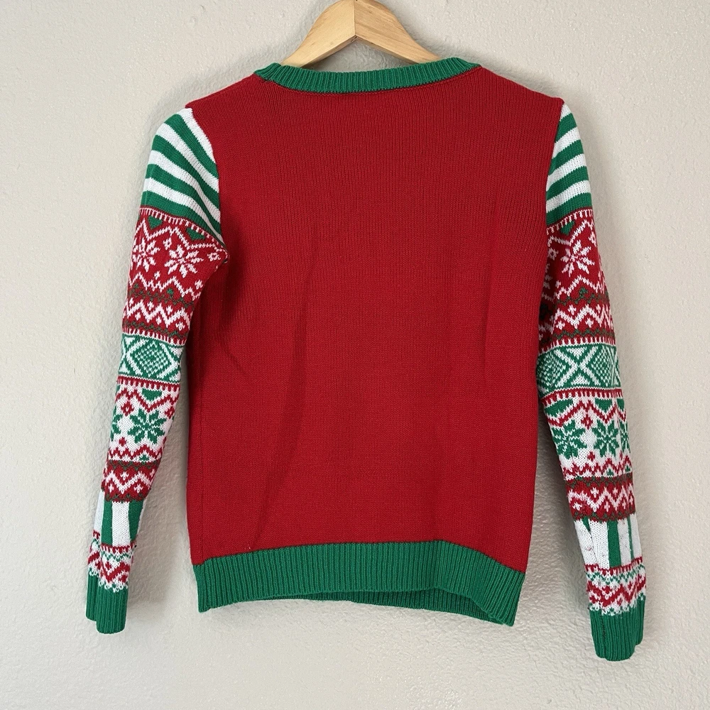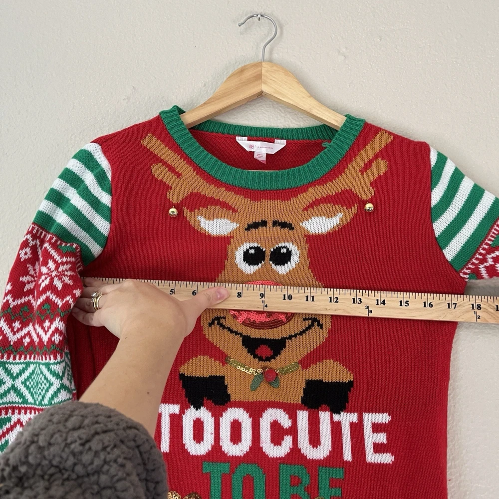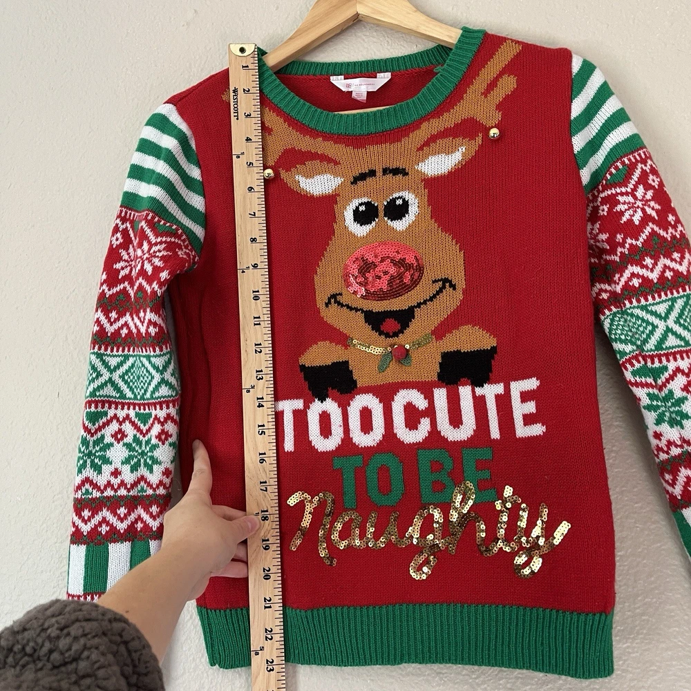 Christmas sweater “Too Good To Be Naughty” reindeer, winter holiday, size small, sequin, bells