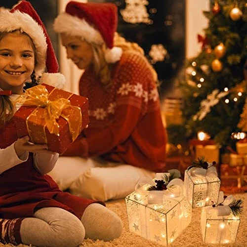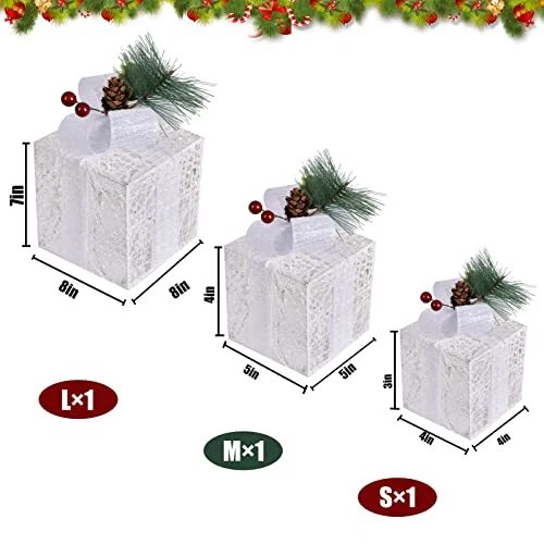 30 Days Return Policy Fast Delivery Trusted seller Christmas Lighted Gift Boxes, Set of 3 Christmas Decorations for Home, Light up Christmas Ornaments, Warm White LED with Bows for Indoor Party Holiday, Christmas Decor(Star) Product Description Unique Design: Cute star pattern with white bows design makes the Christmas lighted gift boxes look premium and exquisite. When you light it, christmas decorations indoor will be warm and charming. Timer Function: Each gift box has a high quality string light. The string light has two modes: constant light and twinkle. After timing, it stays bright for 6 hours and then goes out for 18 hours. Waterproof: IP44 Waterproof and battery case need to be equipped with 3 AA batteries (not included). Note: But avoid immersing the battery case in water for a long time when using outdoor. Easy Storage: Their sizes allow them be overlapped one by one for facilitate storage, carry and space-saving. Christmas decor boxes goes well with most decor style and is a fabulous addition to Christmas party celebration or christmas decorations outdoor yard. Christmas decorations: Christmas decor boxes go well with most decor style and is a fabulous addition to Christmas party celebration or Christmas decorations outdoor yard. Shipping Returns Payment Shipping Shipping is FREE to all addresses other than APO/PO boxes in the lower 48 states. All our stock ships from US-based warehouses. Shipped via USPS or UPS (depending on location and package weight) Unless stated otherwise, all orders will ship within 24-72 hours of your payment being processed. Check our feedback to see the great reviews of FAST shipping we offer. Returns As our valued customer, we will do our best to make sure the product you receive arrives to you on time and as expected. If you are not satisfied with your purchase, please contact us within 30 days of receiving your order to process a return. Payment We currently accept payment via eBay managed payments only. Once payment is cleared, we will dispatch your shipment within 1-3 business days. Please refer to the "Shipping" tab for more information regarding shipping speed to your destination.