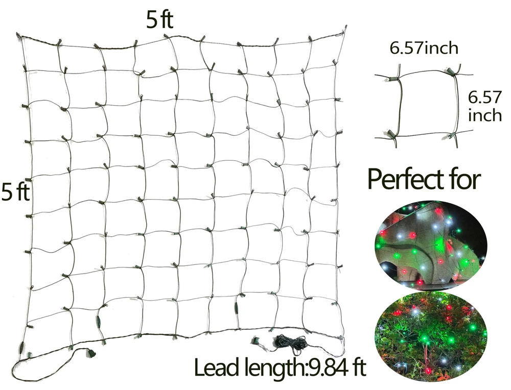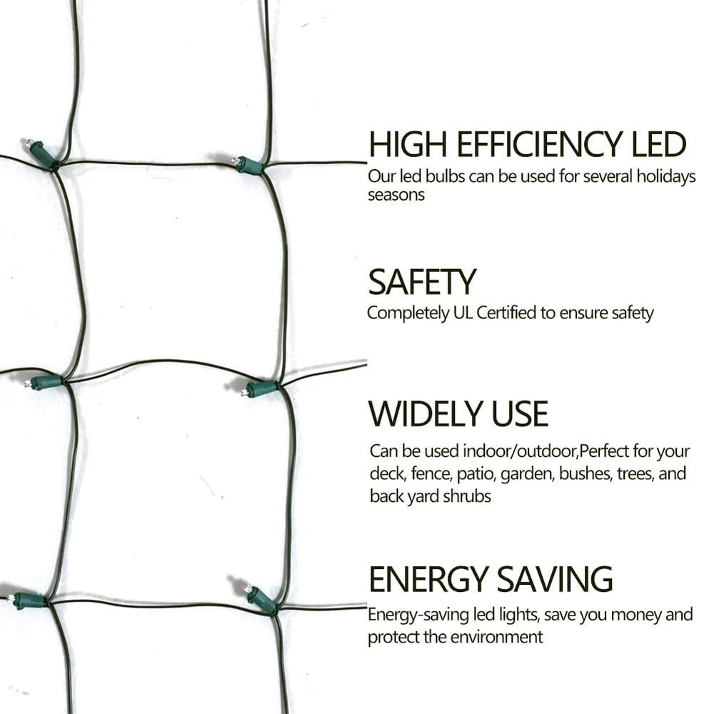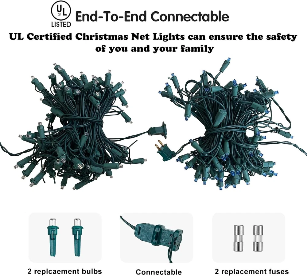 【Ideal Outdoor Christmas Lights】Our 5ftx5ft 100led Christmas net lights string has a length of 9.84ft in front lead and 1.64ft in rear lead, perfect outdoor indoor decorations for Christmas, Thanksgiving, Easter, Halloween, party, yard, balcony, garden, pergola, gazebo, especially for trees and bushes. The green wire grid can perfectly blend with green bushes and trees, making your yard/garden look more natural during the day. 【Totally UL Certified Christmas Lights】This outdoor christmas net lights Strictly tested and meets the US requirements of string lights UL safety standards.The whole christmas lights string and every part (string wire, led bulbs, output plug and all raw material) are UL certified.It has approved for indoor and outdoor christmas decorations.The christmas lights string is IP44 waterproof and can be used indoor outdoor(CAUTION:The plug is not waterproof, please keep the plug away from water). 【Durable and Sturdy Mesh Net Lights】 Our mesh net lights use the high quality and durable green wires so they are difficult to be break off. The strong construction makes it tough and sturdy, not easy to break apart and overheat after long hours of usage. They are strong enough to provide years of high quality lighting. 【Connectable Christmas Net Lights】 This outdoor christmas lights string has both male/female plug,allowing you to connect max 12 sets together.You can connect lights string on different shrubs or splice them into a larger net without adding power sockets.You can connect different light strings at distance within 11.48ft,very convenient to use. 【Waterproof Outdoor Christmas Decorations lights】The christmas lights string is IP44 waterproof and can be used indoor outdoor(CAUTION:The plug is not waterproof, please keep the plug away from water). 【Independent Fuse Mesh Lights】Each bulb of this bushes lights is individual, so if one or several bulbs are damaged or burnt out, the other bulbs will work normally,the entire strands of net christmas lights will stay on normally,continuing to provide you with holiday colors. We also provide 2 spare bulbs and 1 spare fuse for repair (basically no need to use). 【Widely Used Bushes and Tree Lights】The mesh and tree lights is very easy to use, unroll the net string lights then mount it at the place where you want to decorate ,suitable for terrace, indoor, outdoor, yard, garden, cafe, wedding, birthday, Christmas, Thanksgiving, Halloween, Valentine's Day, Christmas tree,etc. 【Satisfaction Guarantee】After the Christmas net lights are manufactured,we tested each function and color temperature before packaging,it will help you create a perfect holiday atmosphere.If you have any questions, please feel free to contact our after sale service team at any time, we will help you solve the problems within 24 hours.