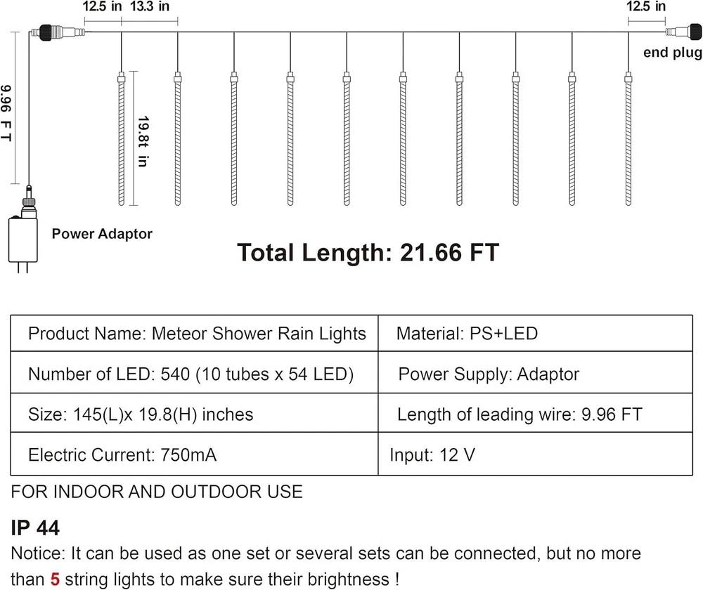 Color Warm White Brand Joiedomi Indoor/Outdoor Usage Outdoor, Indoor Special Feature Waterproof Power Source Corded Electric Light Color Warm White Theme Holiday Occasion Christmas Style Modern Material Polycarbonate About this item PERFECT SIZE. The White LED Meteor Shower Rain Lights have 10 tubes on one strand, each tube is 50cm long, 540 LEDs. EXTENDABLE. Designed with a connector that can connect more than 2 lights together to suit wider occasions. We recommend connecting at most 4 strings to ensure all the lights work well and get the best brightness. PERFECT DECORATION SUPPLIES & WIDE APPLICATION. Each of the outdoor lights fall in sequence then have a slight delay on each tube, just like a meteor shower or falling snow across the night sky, which shows a super beautiful display. They are perfect to decorate trees along street/park/ river, hang along the roof, great for market engineering lighting, urban and architectural beautification. Ideal for patio, yard, garden, hotel hall, shopping mall decoration. PREMIUM QUALITY & WATERPROOF. Made of premium PC material that is transparent, you can see the light glow clearly through the tube. The Christmas light is waterproof, ideal for indoor & outdoor decoration, please protect the plug from the water or heavy raining day. Dustproof, corrosion-resistant, cost resistant, aging resistant, more durable that will last several years using. Safety test approved. CUSTOMER SATISFACTION. Providing a great satisfaction experience is our main priority to our customers. Feel free to message us through “contact seller” if products don't meet your expectations.