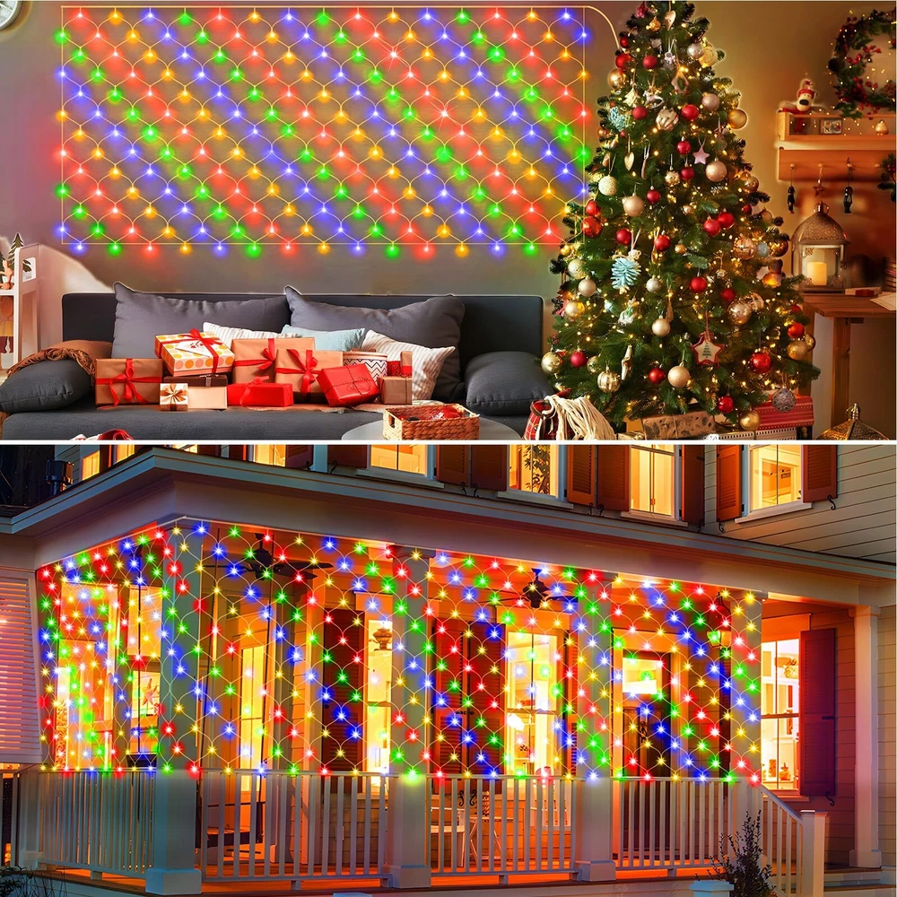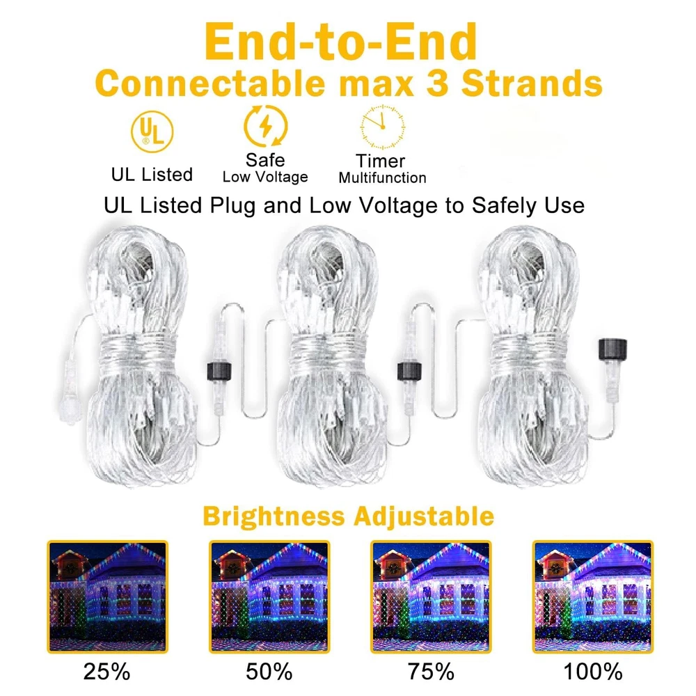 【Easy to Install & Safer】Easy to use and cover a lot of area in either horizontal or vertical spacing. Keep these up all year, they case a perfect warm soft surrounding light for our Trees, Hedges, Bushes, Fence, Yard, Balcony, Backyard, Wall, and more. UL Listed Plug and Low-temp LED bulbs ensures safe to touch even after long time use. Allows you to save time and effort. Safer to use! Connectable & Widely Use:360 LED net lights size is 13ft*9.8ft with 16.4ft lead cable. Come with a waterproof end-to-end connector, that connects up to 3 strands to meet your needs for large or small area decor. Easy to cover bushes, grassland, treetops, walls, hedges, shrubs, fences, railings, windows, balcony, add a relaxed and romantic ambiance to your Easter, Halloween, Xmas, party, camping, wedding and room. Christmas Net Mesh Lights:The biggest advantage of this net light is its unique fishing net design and easy installation, saving you the hassle of winding decorations. Whether it's for lawns, shrubs, gardens, windows, or balconies, you simply need to spread out the net light and turn on the switch, and it will become a beautiful sight. The net light features a built-in fishing net shape, making it very eye-catching. Enjoy the charm and fun that this delightful net light brings you! 8 Lighting Modes & Memory Function:Outdoor mesh lights are available in 8 lighting modes, including steady on, In Waves, Sequential, Slo-Glo, Chasing/Flash, Slow Fade, Flash, and Combination, which will create a cozy & romantic atmosphere for you or your family. The LED net lights built-in memory chip saves your last mode's setting, no need to reset every day! Timer Setting & Dimmable:Press DIM+/- button to adjust the brightness level ( 100% 75% 50% 25% ), you can choose the brightness that makes you feel most comfortable & happy.And 3 Timer Setting modes can custom your time by remote control. 6 Hrs on, 18 Hrs off; 8 Hrs on ,16 Hrs off; 6 Hrs on, 6 Hrs off, 3 Hrs on, 9 Hrs off. Safely Install & Waterpoof:These outdoor mesh string lights have passed the authoritative UL588 safe certification,and a 29V low output voltage will not overheat after long time use. It is safe for children and pets. The net lights made of of IP44 Waterproof design to make sure a long lifespan, perfect for rainy/snow weather and humid environment.