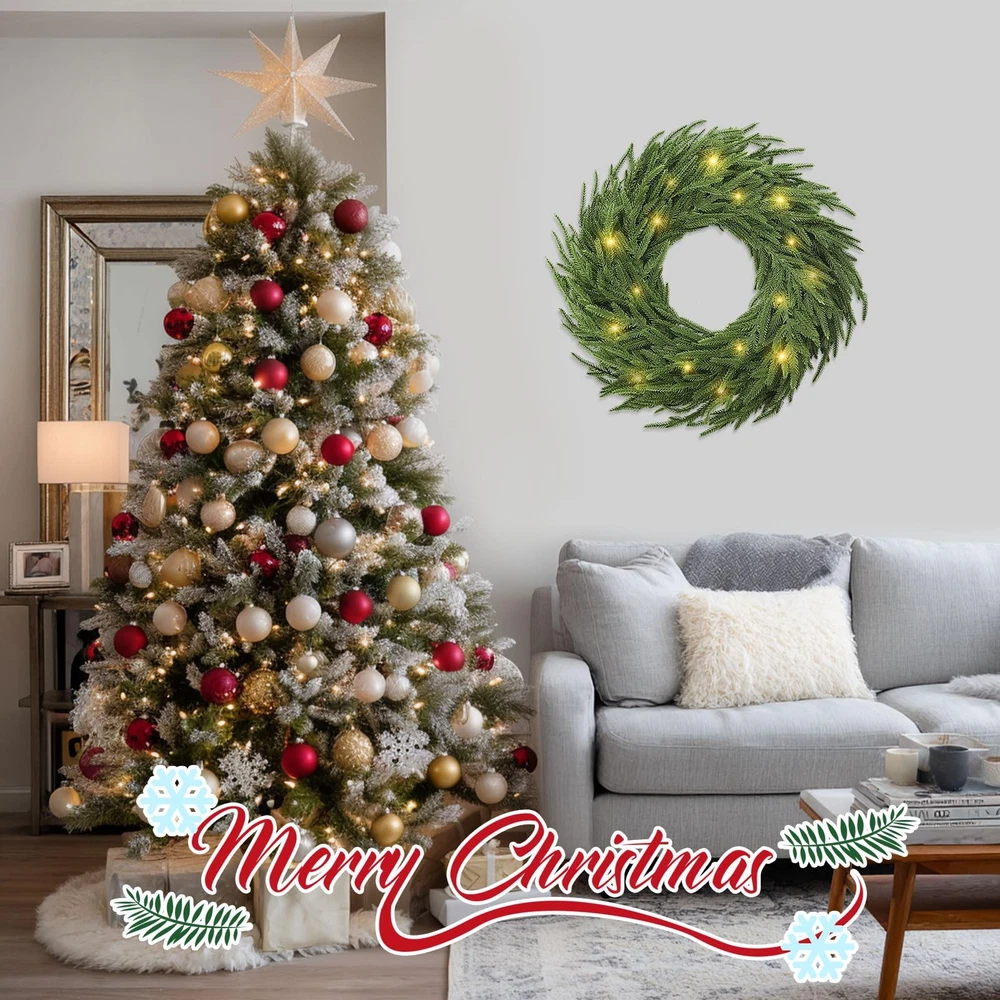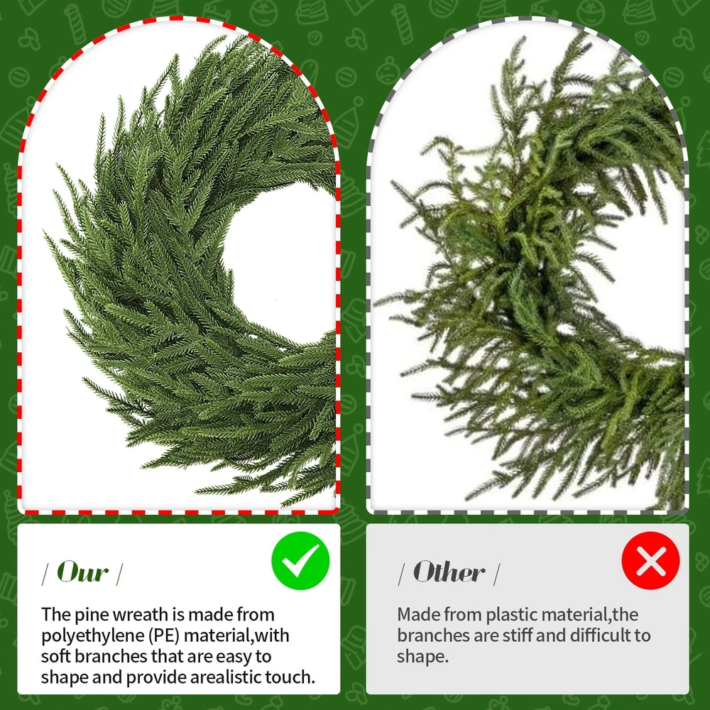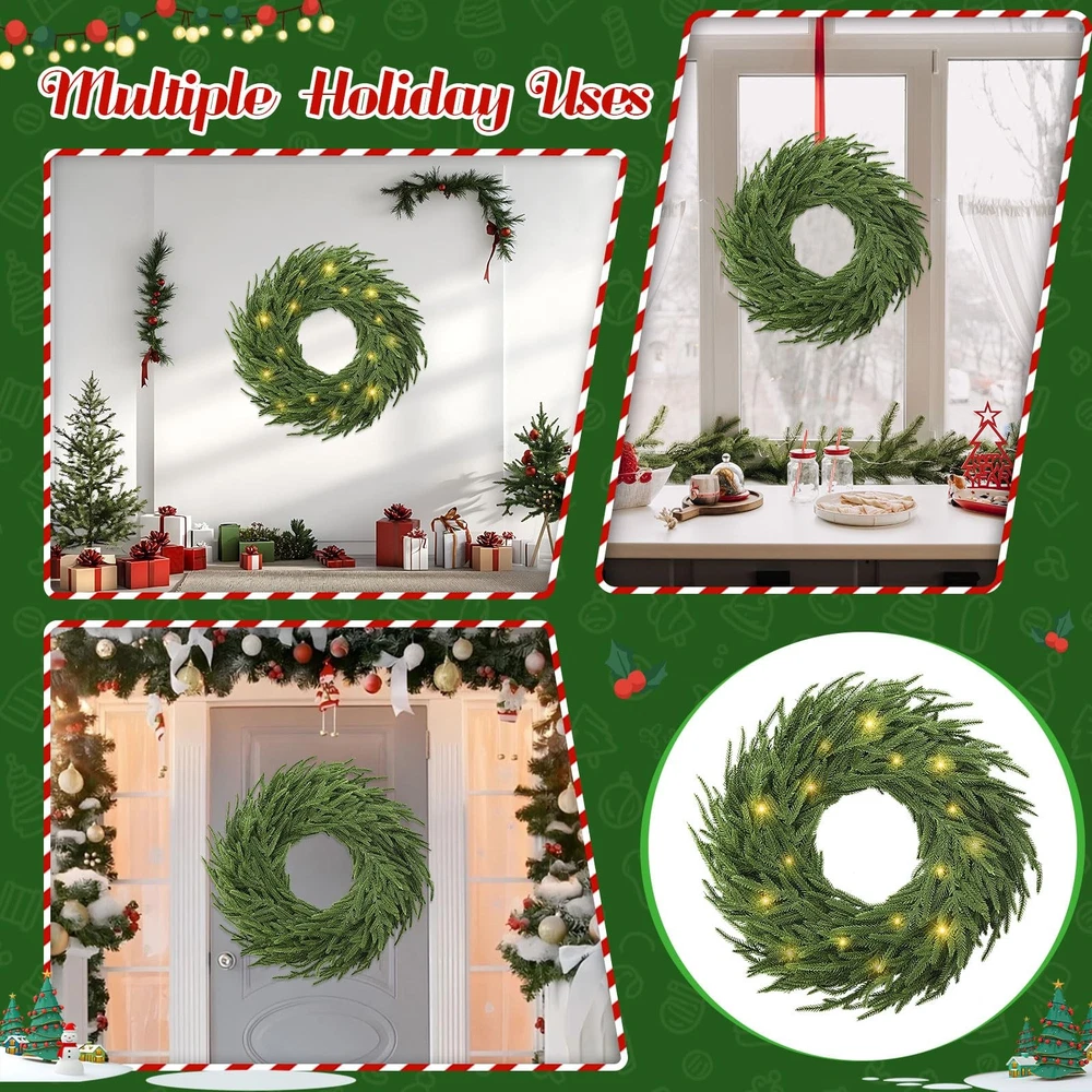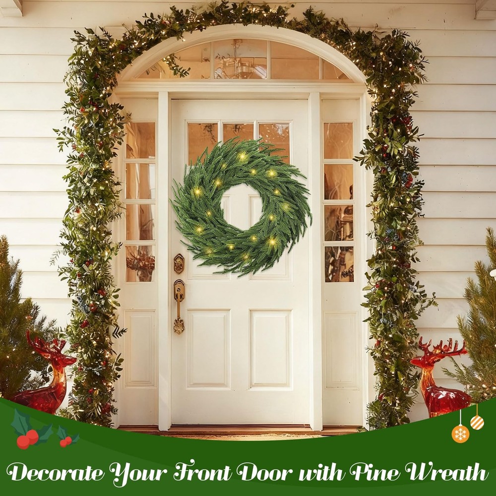Real Touch Christmas Wreath: 24" pine wreath offers a realistic design, handmade with care. Compared with other Christmas wreaths for front door, this 24 inch Christmas pine wreath is fuller, more layered and more realistic.The real touch large artificial green Christmas wreath is as lifelike as a pine tree in nature Real Touch Christmas Wreath: 24" pine wreath offers a realistic design, handmade with care. Compared with other Christmas wreaths for front door, this 24 inch Christmas pine wreath is fuller, more layered and more realistic.The real touch large artificial green Christmas wreath is as lifelike as a pine tree in nature 50 Warm White LED Lights 8 Lighting Modes : Choose from 8 lighting effects, including combination, wave, sequential, slow glow, chasing/flash, slow fade, twinkle/flash, and steady on-to match your holiday mood. This battery operated garland with lights equipped with 50 long-lasting warm white LED fairy lights (up to 30,000 hours), this lighted garland indoor delivers a soft, welcoming glow for cozy holiday evenings. The waterproof battery box (requires 3 AA batteries, not included), cordless operation for both indoor and outdoor decorating-no outlet needed Natural and Vivid Pine Wreath: This artificial pine wreath is made from quality polyethylene (PE) materials and features a sturdy grapevine base for durability. The 24 inch Christmas wreath outdoor stems and leaves with dark green and tender green interlaced , which is astonishingly realistic. The branches have clear textures, allowing the Christmas cedar wreath to get rid of the stiff and plastic feel of artificial plants Outdoor Christmas Decorations Yard: Designed to withstand outdoor conditions, the Christmas door wreath is resistant and fade-proof, making it the perfect choice for outdoor wreaths for front door displays. It can handle wind, rain, and snow, so your wreath stays vibrant and beautiful no matter the weather Perfect Holiday Accent for Every Celebration: Add a decorative touch to festive occasions with this warm light Christmas wreath for mantle, ideal for holiday dinners, themed parties, seasonal photo backdrops, or retail displays. Whether arranged as a table centerpiece, draped along reception desks, or wrapped around indoor columns, it instantly enhances your space with classic Christmas style and joyful atmosphere