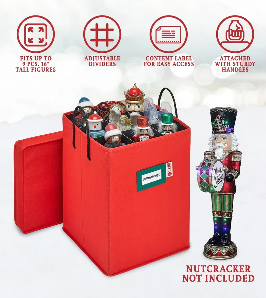 Premium Nutcracker and Figurine Collectible Storage Box Santa, Nutcrackers, and nativity scenes are a few of the most cherished decorative items for the holidays. You probably have a treasured collection passed down from family members or gifts from loved ones. While they are lovely to display, they can also be the most fragile to store. Protect these adored keepsakes in a container that will surely keep them in good condition year after year. Adjustable & Versatile - Accommodate Up to 9 Nutcrackers or Figurines That Measure 16-inches Tall Our Nutcracker and Figurine Collectible Storage Box is designed to preserve your favorite collectibles while keeping them organized. This 17” x 12” x 12” container can accommodate up to 9 figurines that measure 16 inches tall. Adjustable dividers allow you to customize according to your needs. The same dividers are wrapped in acid-free material that will prevent the contents from being damaged or discolored. Nutcrackers and figurines are not included Quality Craftsmanship in Every Detail We have designed the storage box as a better option to storing your figurines in tissue paper and flimsy boxes or plastic bins. The handles on the side allow for easy transport, the clear identification card slot enables you to label the contents and the color makes it easily identifiable from your other storage cases. The HOLDN STORAGE Holiday Decor Storage Bag aims to solve your problems and make life easier for you so that you can spend less time stressed & more time relaxing and enjoying the holidays with your family, friends and loved ones. That's why customer satisfaction is the cornerstone of our business so you can be confident that your satisfaction is always our top priority We stand behind our products 100% and are committed to fulfilling our customers’ needs. If you are unsatisfied with your purchase, get in touch with us and we will be more than happy to assist you. PROTECTS AND ORGANIZES: Storing your holiday decor once the holidays are over should be given the same care and thoughtful consideration as to when you were displaying them. Family heirlooms, rare, or one-of-a-kind figurines should not be kept in flimsy boxes or loose plastic bins that are not always reliable. What you need is our Nutcracker and Figurine Collectible Storage Box to keep them safe year after year. Nutcracker NOT included. DESIGNED FOR FRAGILE NUTCRACKERS & COLLECTIBLES: Measuring 17” x 12” x 12”, our storage box can fit up to 9 collectibles and figurines with a maximum height of 16 inches. You can significantly reduce the need for more storage containers since you can store several pieces in just one case. Keep similar items in each box so you can easily keep track of when it's time to put them on display again ADJUSTABLE DIVIDERS: Storage case comes with 4 dividers that you can customize. If you have figurines or nutcrackers that are bigger or bulkier, you may choose to use only 2 of the dividers providing you 4 - 6-inch compartments. For smaller items, use all 4 of the dividers and you'll have 9 individual slots measuring 4 inches each. You won't find this option with ordinary holiday storage boxes or bins! SECURE STORAGE SOLUTIONS: With our storage container, we are not only offering you convenience but also peace of mind as well. Your prized figurines and collectibles will be protected from dust and dirt while in storage. The acid-free dividers will prevent any discoloration and damage keeping your favorite decor looking as good as the first time you brought them out on display AN IDEAL CHOICE THIS HOLIDAY SEASON: Not just for figurines and collectibles, this storage box is appropriately sizes so that you can use our storage box for other holiday decor throughout the year. It can also be used for ornaments and dolls. Without the dividers, you can store lights, garlands, tree skirts, and more. The clear slot on the exterior of the box allows you to label the contents so you'll know at first glance what it holds