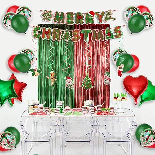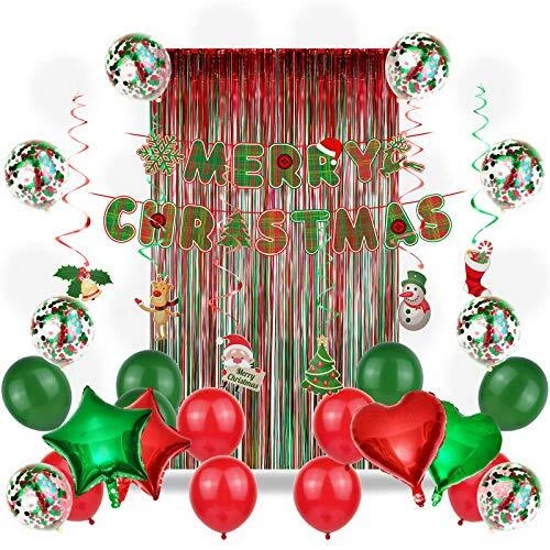 30 Days Return Policy Fast Delivery Trusted seller Christmas Party Decoration Supplies Christmas Balloons Merry Christmas Banner Hanging Swirls Red and Green Metallic Fringe Curtains Christmas Decor Product Description Christmas party decoration includes: 1 Merry Christmas banner, 2 pcs red and green foil curtain, 2 pcs red and green star foil balloons, 2 pcs red and green heart shape foil balloons, 6 pcs Christmas hanging swirls, 8 red and green confetti balloons, 6 pcs red balloons, 6 pcs green balloons Christmas party decorations size and color: Christmas Banner: 12x15cm/4.7x5.9inches for each letter; green and red foil curtain: 1mx2m/39.3x78.4inch for each curtain; star and heart shape foil balloons: 18 inch; Christmas hanging swirl: 65 cm/25.6 inches length, Christmas balloons: 12 inches Have much fun for Christmas: Put this Christmas Decor in your living room, bedroom, kitchen, classroom, or office and surround yourself with the beautiful things for Christmas. It will make your Christmas party different and unforgettable to both kids teens & adults! Excellent quality Christmas party decoration: The Christmas banner is a good thick card paper which can be able use multiple times, christmas foil curtain and balloons are made of high quality foil material, and Christmas christmas balloons are made of natural latex, which are non-toxic and odorless CUSTOMER SERVICE: If the Christmas party decoration balloons set do not meet your need, our customer service is free-hassle for you to resolve your issue. You can "seller contact" button in your account to email us to get money back or new one Shipping Returns Payment Shipping Shipping is FREE to all addresses other than APO/PO boxes in the lower 48 states. All our stock ships from US-based warehouses. Shipped via USPS or UPS (depending on location and package weight) Unless stated otherwise, all orders will ship within 24-72 hours of your payment being processed. Check our feedback to see the great reviews of FAST shipping we offer. Returns As our valued customer, we will do our best to make sure the product you receive arrives to you on time and as expected. If you are not satisfied with your purchase, please contact us within 30 days of receiving your order to process a return. Payment We currently accept payment via eBay managed payments only. Once payment is cleared, we will dispatch your shipment within 1-3 business days. Please refer to the "Shipping" tab for more information regarding shipping speed to your destination.