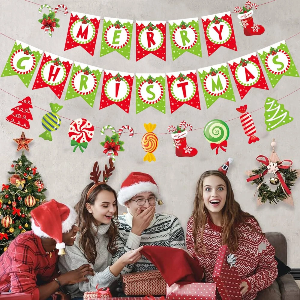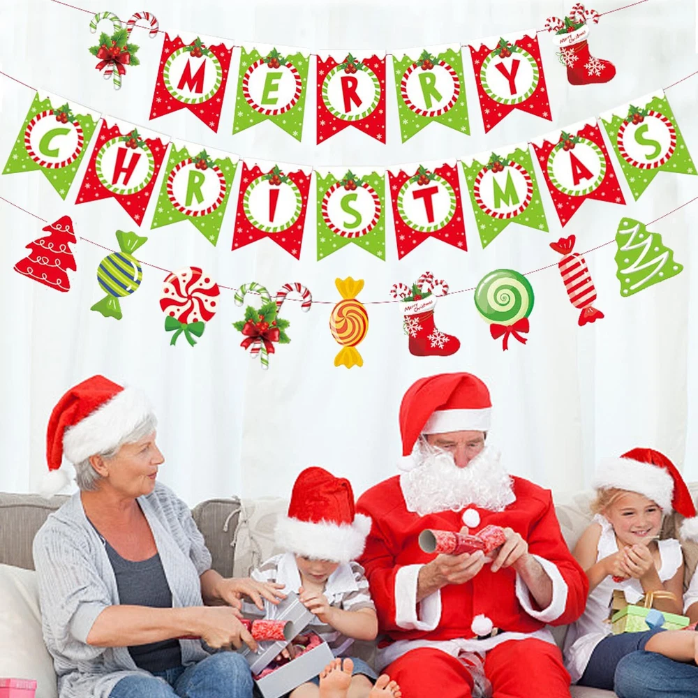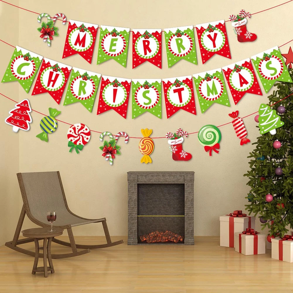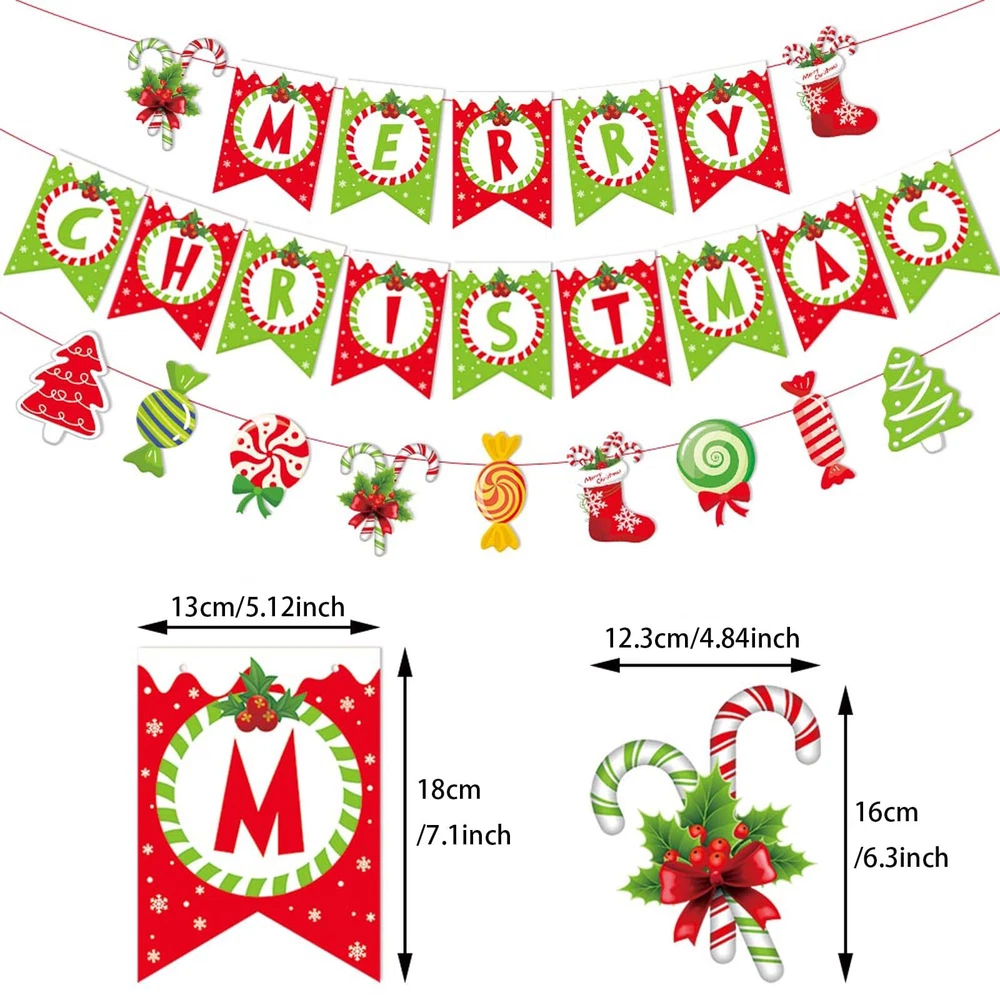 🍬【Package Contains】1pack red green white merry christmas sign banner, 1pack paper red green white yellow christmas trees socks sweet candy banner bunting, 3pcs strings (each string is 3m/9.8ft, total 9m/29.4ft), 2 threading needles. 🍭【High Quality】These red green white christmas banner bunting are made of high quality cardstock, non-toxic, no odor, safe, environmental friendly, neatly cut, durable and reusable, it will enhance your christmas party atmosphere. 🍬【Easy to Assemble】DIY needed. There are two small holes on the merry christmas banner and christmas trees christmas socks sweet candy bunting banner, you can use the string to assemble it according to the picture, or assemble it according to your preference. 🍭【Available Occasion】Our red green white merry christmas banner bunting hanging paper christmas decoration supplies are perfect for parties and events, like xmas party, christmas party, new year party and etc. It also can decorate wall, fireplace, mantel, home, dining room, kids room, baby room, garden, school, classroom, nursery, dorm, office, bars, restaurants and other indoor or outdoor occasions ,also great as a christmas photo backdrop. 🍬【Customer Service】If you have any questions with our red green white merry christmas bunting banner xmas decoration supplies, pls feel free to contact us, and you will get a refund or a new replacement.
