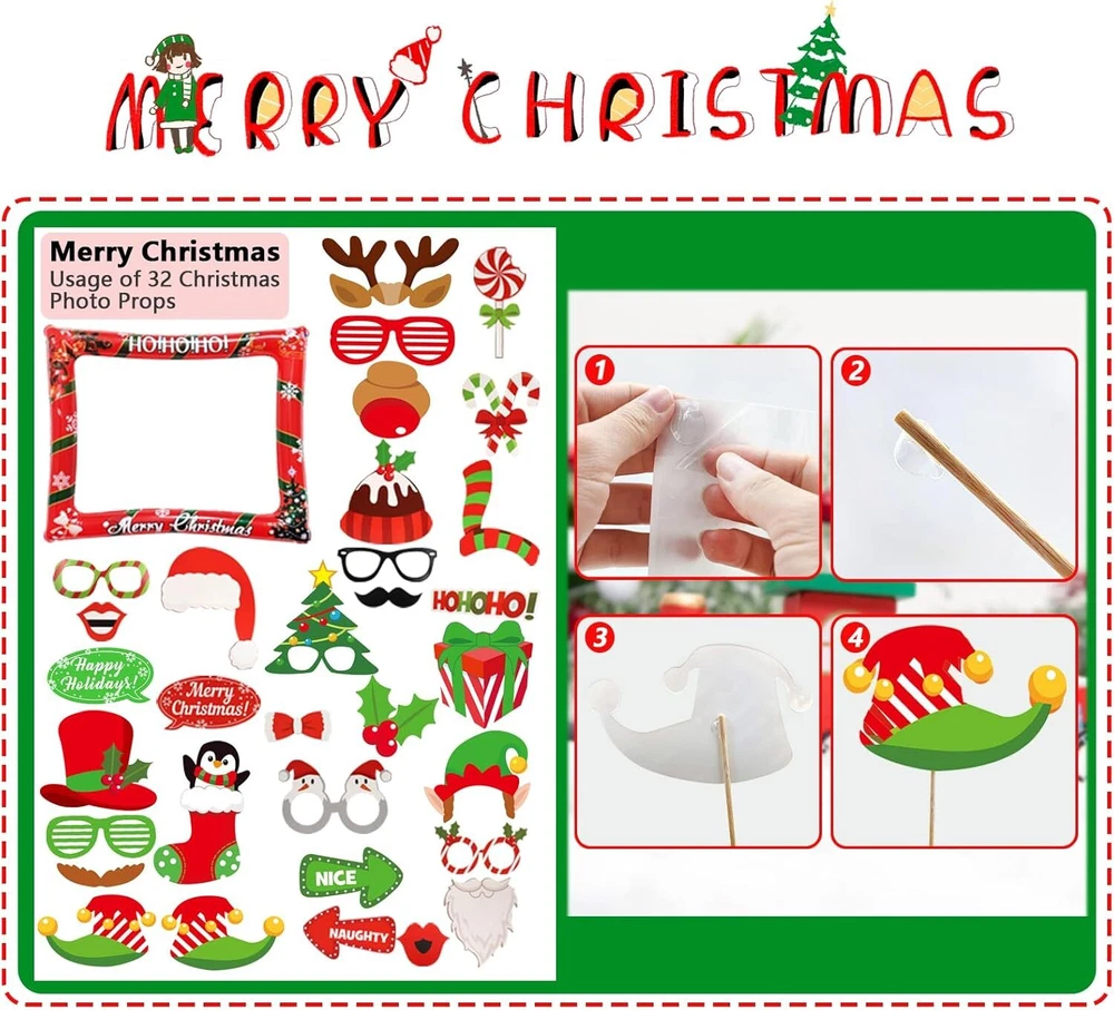 Christmas Party Photo Booth Props Frame, LMSHOWOWO Red Product Details Product Dimensions: 7.87 x 7.87 x 0.75 inches Item Weight: 8.1 ounces Manufacturer: LMSHOWOWO Country of Origin: China Item model number: EJ0020011 【Christmas Desing】The Inflatable Selfie Photo Frame is printed with classic Christmas tree, Santa, ring bell, reindeer and "Merry Christmas" words on the frame edge, adding Christmas festive atmosphere; Traditional Christmas elements make your photo more special 【Widely Applicable】Xmas Photo Booth Frame fits for your Christmas party, new year decoration, family dinner, friends gathering, birthday party, costume party, stage performance, weddings, school events, bars, holidays, pool parties, etc; and other festival occasions, the creative design makes the festive atmosphere more active and joyful, creating more fun when taking photos 【Easy To Use】This funny set of christmas selfie decorations provide strong wooden sticks and glue dots; So easy to assemble and use; Just attach the wooden stickers to the xmas selfie props with the glue dot and inflate the christmas selfie picture frame with an inflator; This christmas picture frame and props is very suitable for those who are love taking photos or selfies at all kinds of parties, leave a good memory 【Rich Christmas Elements Design】The Inflatable Selfie Photo Frame is printed with classic Christmas tree, Santa, ring bell, reindeer and "Merry Christmas" words on the frame edge, adding Christmas festive atmosphere; Traditional Christmas elements make your photo more special and funny