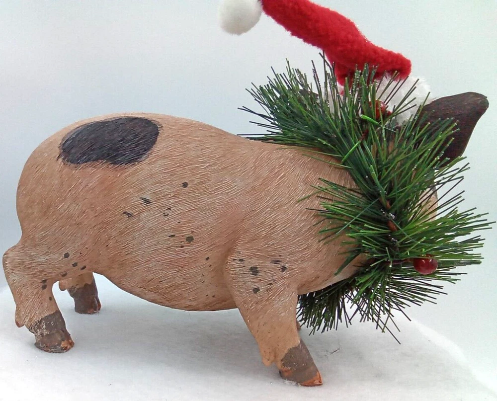 Christmas Pig Figurine Statute Santa Hat Wreath Snout Hoof Tail Textured Stands