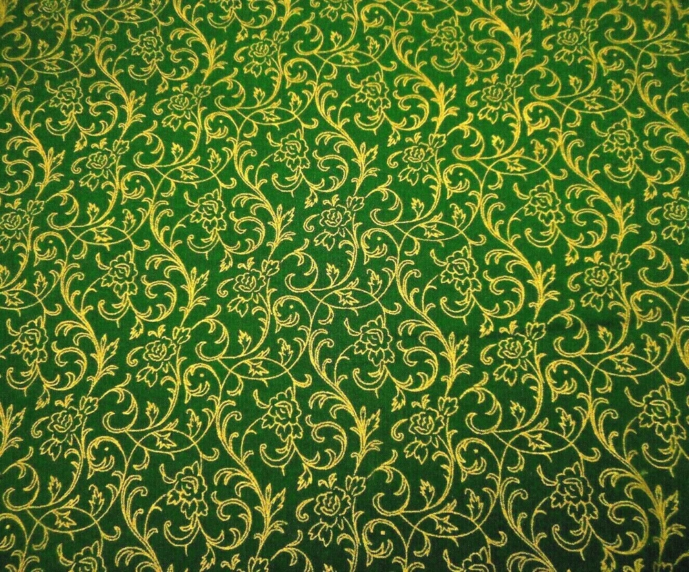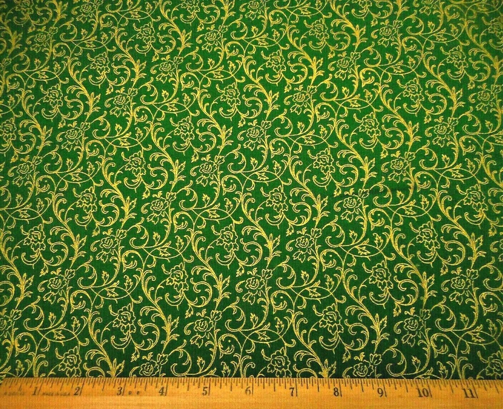 This is a very nice fabric that is 100% cotton. It has metallic gold swirling flowers on a green background. READ: Because computer monitors show colors and shades differently, the fabric colors can vary from the photos. If you have any questions regarding this, please contact me before p urchasing the item. I have been a quilter for 30 years and am an accomplished seamstress & would be happy to answer any questions you might have. This is for 1 Yard of Fabric. If you purchase more than 1 Yard, I will give you one continuous cut. If you have a problem with anything you purchase from me, please contact me before leaving neutral or negative feedback and I will work it out with you. Payment is due within 48 hours. If payment isn't received within 5 days, it will automatically go to Ebay's resolution center for non-payment. INSTRUCTIONS FOR COMBINED SHIPPING: I Do combine shipping. You must add the items to your shopping cart and request an invoice from me using the REQUEST TOTAL BUTTON BEFORE completing the payment process, or I won't be able to combine your shipping. Payment is due upon receipt of your invoice. Thank you for looking and God bless you and your family. IF THERE IS A PROBLEM WITH ANY PURCHASE, PLEASE CONTACT ME, THE SELLER, VIA EBAY'S MESSAGING SYSTEM PRIOR TO OPENING A CASE--OPENING A CASE, EVEN IF RESOLVED SMOOTHLY, CAN HURT THE SELLER'S RATINGS. THANK YOU