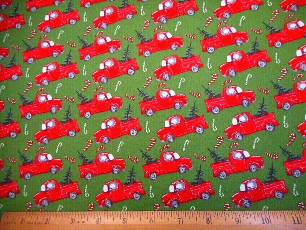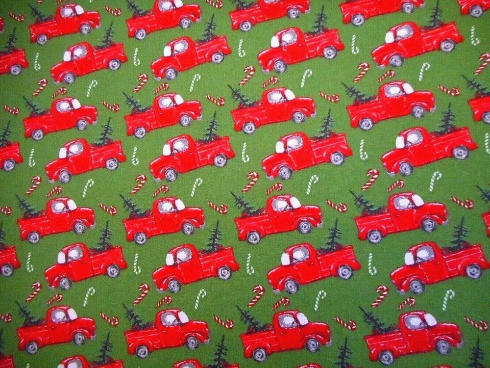 This is a very nice fabric that is 100% cotton. It has red vintage trucks with Xmas trees in the bed & tossed candy canes on a green background. READ: Because computer monitors show colors & shades differently, the fabric colors can vary from the photos. If you have any questions regarding this, contact me before p urchasing the item. I have been a quilter for 30 years and am an accomplished seamstress & would be happy to answer any questions you might have. This is for a 1 Yard of Fabric. If you purchase more than 1 Yard, I will give you one continuous cut. If you have a problem with anything you purchase from me, please contact me before leaving neutral or negative feedback and I will work it out with you. Payment is due within 48 hours. If payment isn't received within 5 days, it will automatically go to Ebay's resolution center for non-payment. INSTRUCTIONS FOR COMBINED SHIPPING: I Do combine shipping. You must add the items to your shopping cart and request an invoice from me using the REQUEST TOTAL BUTTON BEFORE completing the payment process, or I won't be able to combine your shipping. Payment is due upon receipt of your invoice. Thank you for looking and God bless you and your family. IF THERE IS A PROBLEM WITH ANY PURCHASE, PLEASE CONTACT ME, THE SELLER, VIA EBAY'S MESSAGING SYSTEM PRIOR TO OPENING A CASE--OPENING A CASE, EVEN IF RESOLVED SMOOTHLY, CAN HURT THE SELLER'S RATINGS. THANK YOU