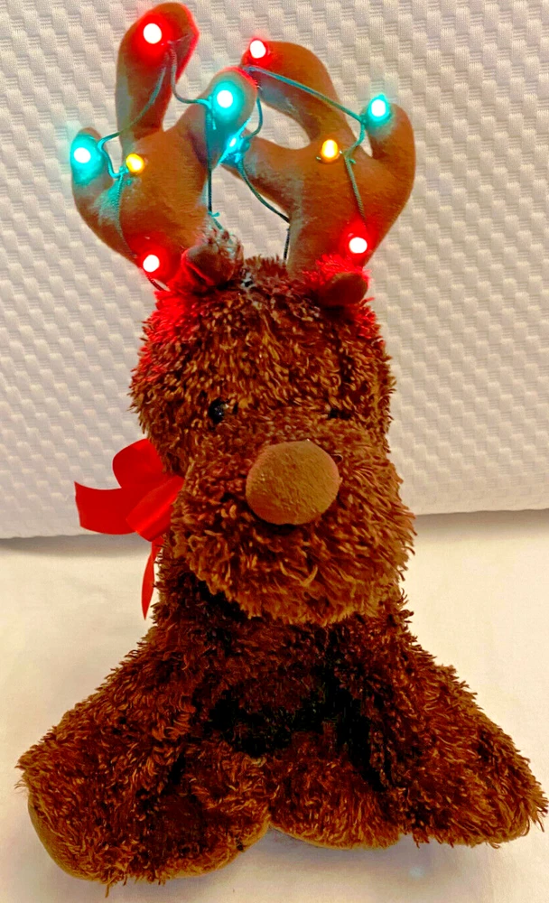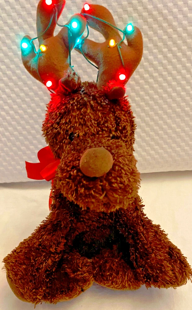 Brown Reindeer with light up antelers plush. Sings jingles bells, head moves white he sings. Great addition to your home for christmas decor. Charming plush reindeer antlers light up as he sings jingle bells and his head dances around. Vintage.