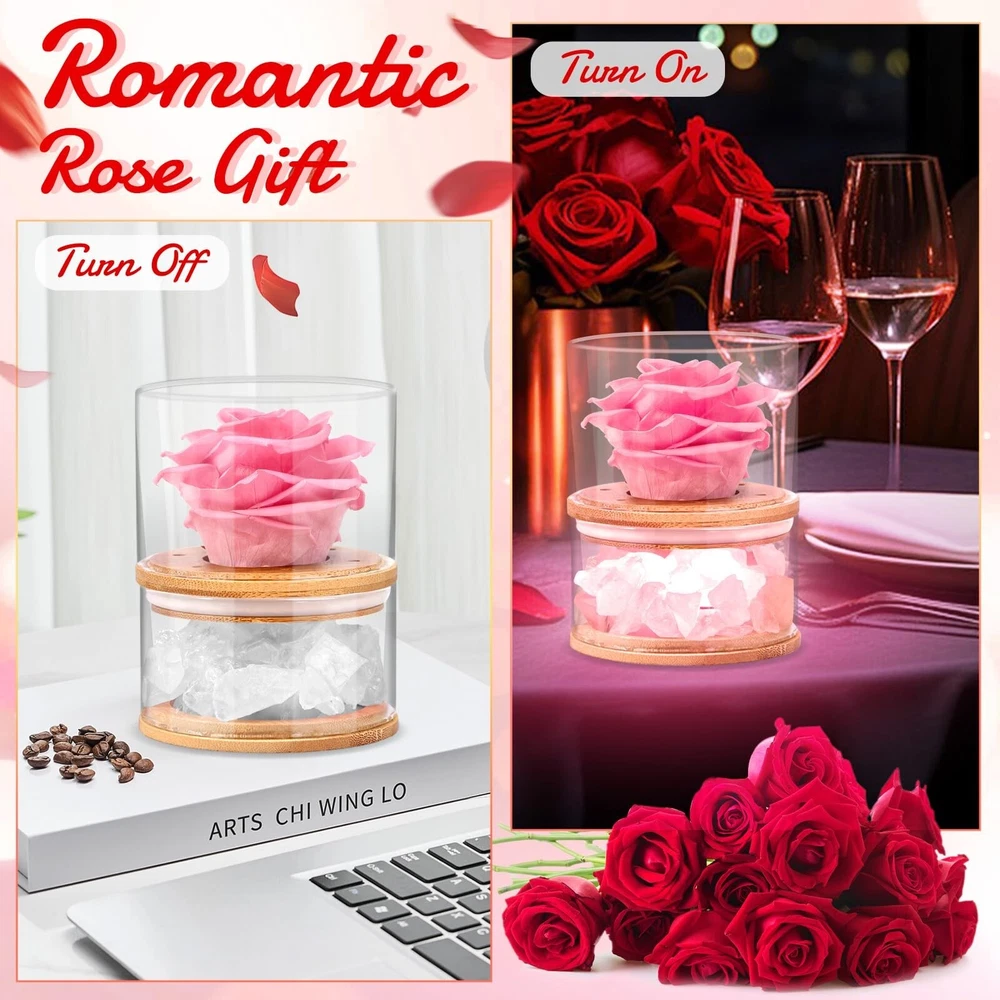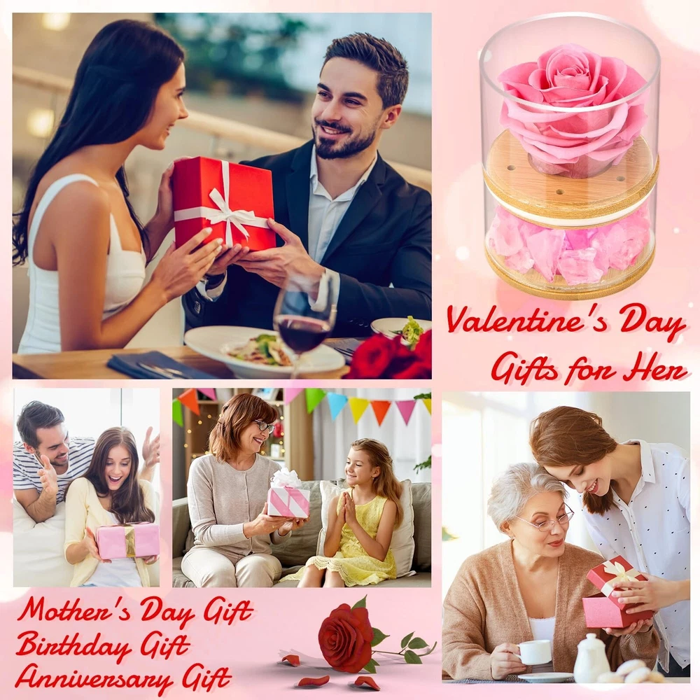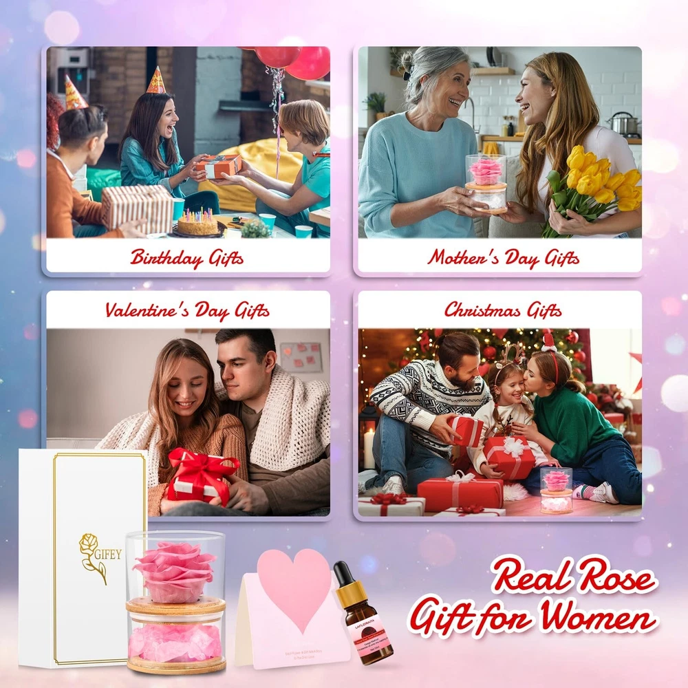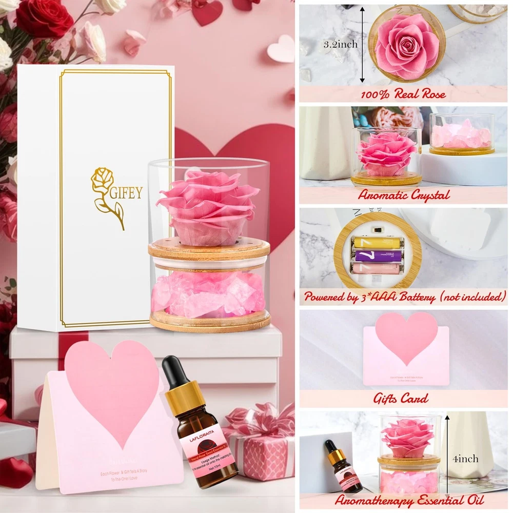 Christmas Rose Gifts for Women,Preserved Pink Roses with Lights,Forever Flower Birthday Gifts for Women, Girlfriend,Mom,Wife,Gifts Idea on Christmas,Valentine's Day, Birthday,Anniversary Product Details Color: Pink Brand: GIFEY MPN: 1 UPC: 704219936562 EAN: 0704219936562 Brand: GIFEY Plant or Animal Product Type: Rose Color: Pink Material: Crystal Recommended Uses For Product: gifts for women,gifts for her Brand: GIFEY Plant or Animal Product Type: Rose Color: Pink Material: Crystal Recommended Uses For Product: gifts for women,gifts for her Specific Uses For Product: Home Decor Package Information: Terrarium Occasion: Valentine's Day Number of Items: 1 Unit Count: 1.0 Count Seasons: All Manufacturer: GIFEY UPC: 704219936562 Package Dimensions: 6.34 x 5.16 x 4.09 inches Item Weight: 1.08 pounds Country of Origin: China Item model number: 1 Date First Available: December 23, 2023 Preserved Real rose Preserved rose is made of 100% real nature fresh flowers, After a unique preservation method, it will stay for 3-5 years. No pollen. No need to water, no maintenance required. Meanwhile, preserved flowers gift is a perfect christmas Gifts and birthday gift for her, on behalf of eternal love. Anniversary Gifts for Wife,As an flowers for delivery prime birthday gifts for mom girlfriend wife. Unique Christmas gifts for her,Eternal Rose and Aromatherapy set Rose essential oil extracted from the flowers of rose, Each set includes10ml bottles equipped with precision droppers for easy.Just add a few drops of rose essential oil to the mineral crystal, and the sweet and romantic aroma can permeate the entire ,filling her room with a soothing. and light emitted through the crystal stones at the bottom(Battery not included)creating a relaxing and romantic atmosphere, Its not just a exquisite gift but a beautiful gift piece of decor that adds a touch of elegance. Absolutely perfect for making her feel special on her christmas /birthday /anniversery or any holiday. Exquisite Gift Set,Christmas Birthday Gifts for Women: Preserved Rose Set Includes Preserved rose and crystal stones ,Rose Essential oil and getting card .Our product has a beautiful package which as gift to women, friends and relatives Suitable for christmas/Birthday/Mothers Day/Anniversary/Thanksgiving. Women christmas Gift Ideas,Gifts for WomenPersonalized gift set can be suitable for women of all ages, whether as christmas gifts for women or mom Christmas gifts, will be a great idea. As Christmas gifts for women,Christmas gifts for mom ,gifts for grandma ,mom birthday gifts.Birthday gifts for wife, Birthday gifts for girlfriend or Birthday gifts for sister bestfriend and so on. Varied UsingSurprise christmas gifts for mom, wife, girlfriend,bestfriend on christmas, birthday,Mother's Day, Thanksgiving, New Year's Day, wedding, Valentine's Day or other holiday occasions. Besides, this everlasting rose is also a great decor in home.Eternal rose means eternal love, this product will be the best gift for her.