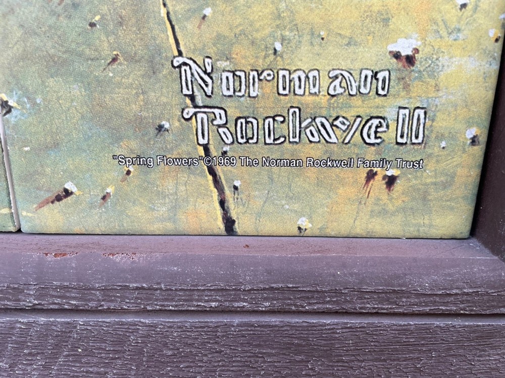 This beautiful framed tile art by Norman Rockwell is the perfect addition to any collection. With its stunning depiction of Spring flowers, this piece will bring a touch of nature and artistry to any room. The brand of this collectible is well-known and highly respected, making it a must-have for any art enthusiast. The tile is suitable for display in a variety of settings and occasions, whether as part of a collection or as a standalone piece. Its features include a sturdy frame that complements the artwork perfectly. Don't miss out on this amazing opportunity to own a piece of history and beauty. Buy Now Sale $49.99reg $399.99 Norman Rockwell Spring Flowers framed tile art. Frame and tile are waterproof, which enables you to display in your garden or on the outside of your house. Emagine this beautiful artwork on a stand among your flower garden. Norman Rockwell " Spring Flowers framed tile artwork. Spring Flowers signed by artist. Kiln fired tile with artwork imbedded in thetile, not painted on the outside. Will not scratch. Norman Rockwell's charming still life, Spring Flowers, was published in McCall's in 1969. It was inspired by his third wife, Molly. By using her sun hat, garden gloves, sneakers, and the arrangement of flowers in the basket, Rockwell portrays Molly's presence without painting her directly. It is a portrait of a woman who stays in touch with nature through the medium of her garden. image size 18x24 frame size 25x31
