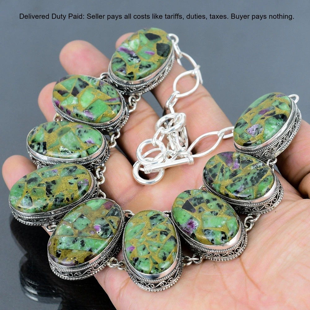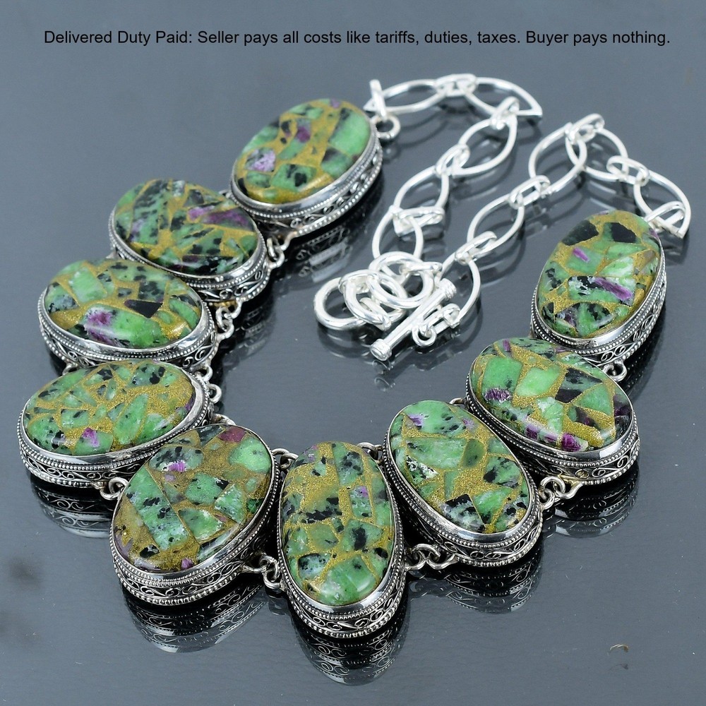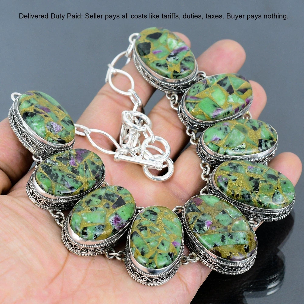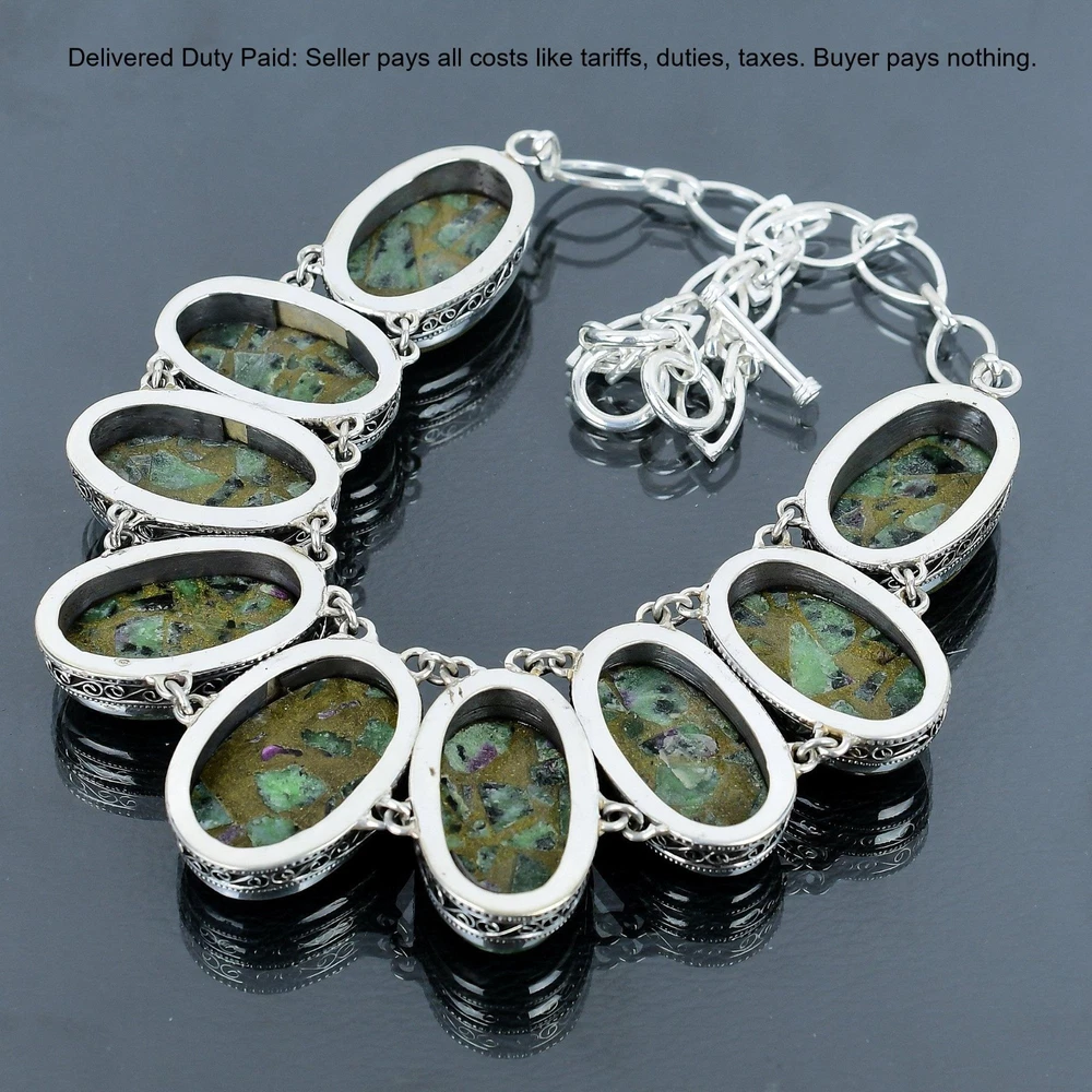 Welcome to Madonna Jewels Christmas Sale 925 Silver Oval Copper Ruby Zoisite Stone Vintage Chain Necklace Handmade Necklace, Sterling Silver Necklace, Copper Ruby Zoisite Necklace, Handcrafted Necklace SKU : VN-1307 Gemstone : Copper Ruby Zoisite Stone Shape : Oval Metal Purity : 925 Sterling Silver Necklace Length : Inches Adjustable : Yes Silver Jewelry is a popular choice for many people due to its unique properties and numerous benefits. Here are some of the key properties and benefits of wearing silver jewelry: Properties: Durability: Silver is a durable metal that can withstand regular wear and tear. Malleability: Silver is highly malleable, which means it can be easily shaped and molded into various designs. Conductivity: Silver is an excellent conductor of heat and electricity. Anti-bacterial: Silver has natural anti-bacterial properties, which can help prevent the growth of harmful bacteria. Benefits: Aesthetic appeal: Silver jewelry is known for its beauty and versatility, and can be worn with a variety of outfits and styles. Hypoallergenic: Silver is generally hypoallergenic, which means it is unlikely to cause an allergic reaction in most people. Healing properties: Some people believe that wearing silver jewelry can help with various physical and emotional conditions, such as arthritis, anxiety, and depression. Spiritual significance: Silver has been used in various cultures for its spiritual and symbolic significance, and wearing silver jewelry can help to connect with these traditions. Investment value: Silver is a precious metal that retains its value over time, and investing in silver jewelry can be a smart financial decision. Overall, silver jewelry offers a unique combination of beauty, durability, and benefits, making it a popular choice for people around the world. For Mother's Day Gift For Father's Day Gift For Promise For Valentine' Day For Halloween Party For Christmas Day Gift For New Year Party For Mom For Her If you can't find the information you need or need some advice for your design? Feel free to contact us. We are fast to reply :) All our work is made by hand with Love and Care in our workshop Thank you so much for visiting and hope you enjoy shopping with us Madonna Jewels is dedicated to providing customers with high-quality sterling silver jewelry. As a manufacturer of handmade jewelry, we offer an extensive range of silver gemstone jewelry that demonstrates our exceptional craftsmanship. We are skilled in adorning gemstones to complement any style, and we give you the freedom to design your own jewelry collection with dazzling, natural, and genuine gemstones. Our talented craftsmen carefully handcraft each jewelry piece, ensuring that it is unique and made with authentic gemstones. The jewelry item you see on our website is precisely the same one you will receive.