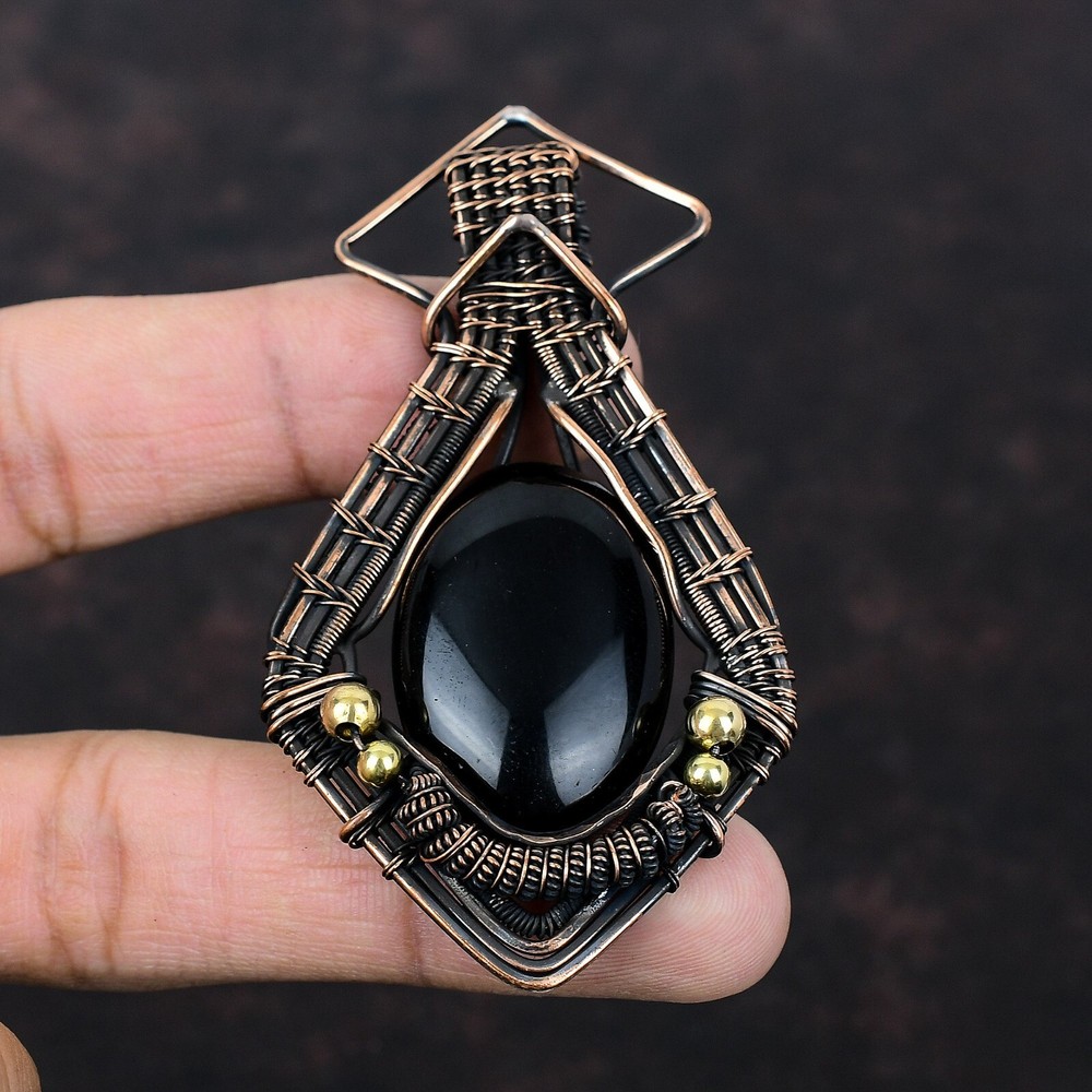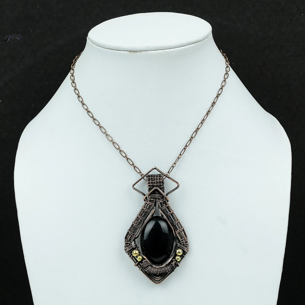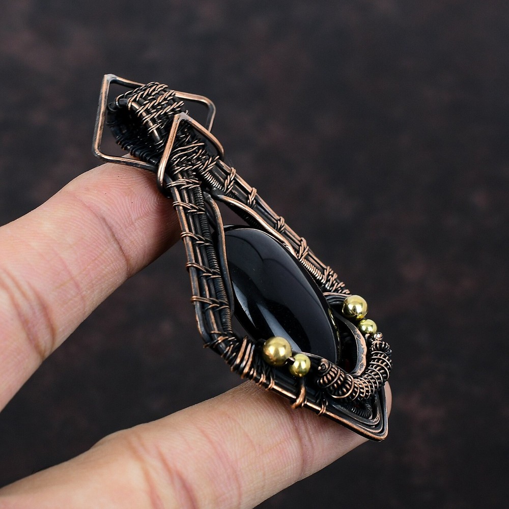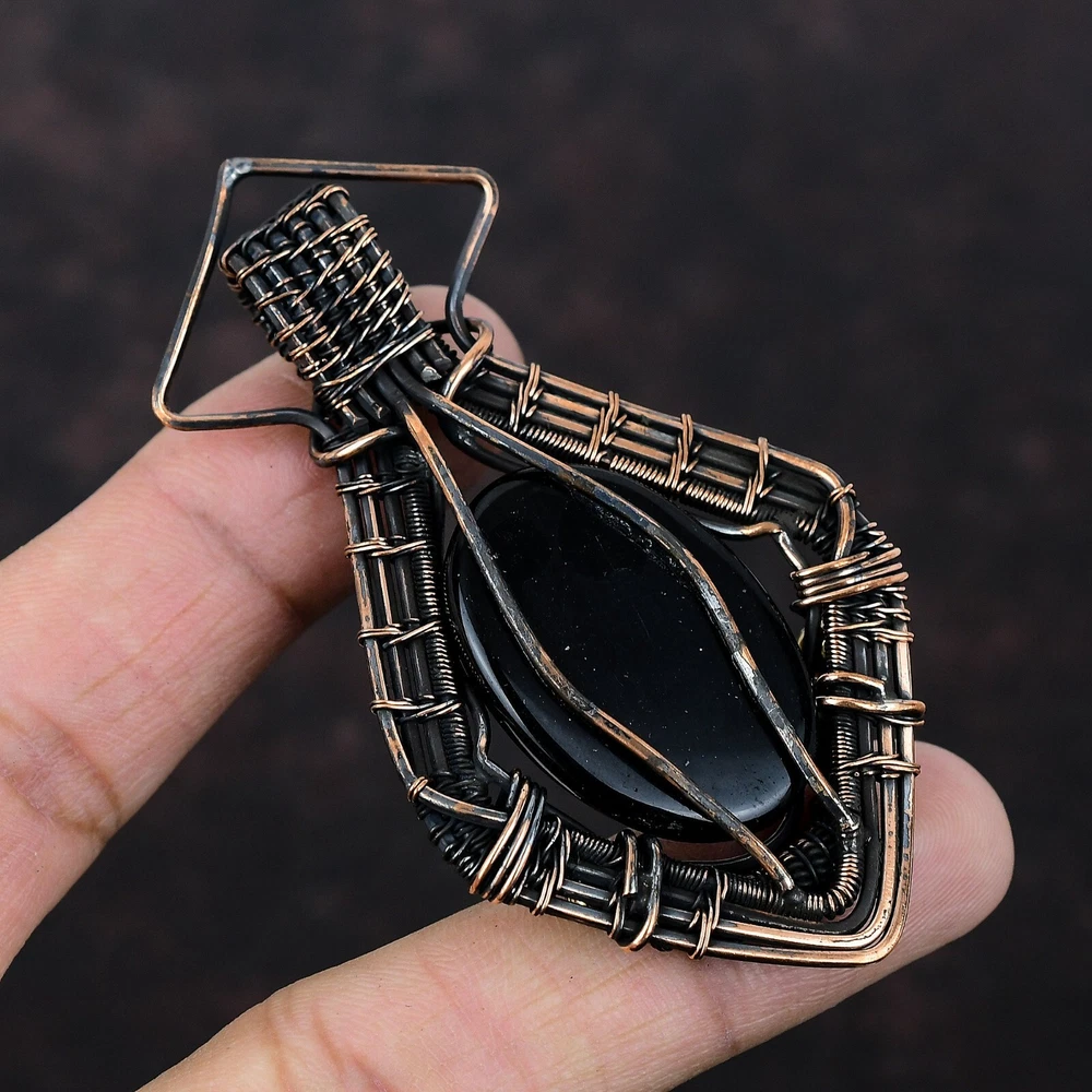 Note : Due to the natural formation of this gemstone. Slight variation in design and color are to be expected. Welcome to Silver Creation Handmade Pendant, Wire Wrapped Pendant, Wire Wrapped Jewelry, Copper Pendant, Copper Wire Pendant, Wrapped Jewelry, Wire Wrap Pendant, Wire Wrap Jewelry SKU : VFWP-1713 Gemstone : Black Onyx Stone Shape : Oval Metal Purity : Unknown Copper Length : 80 Millimetres Width : 44 Millimetres Copper has been used for jewelry making for thousands of years, dating back to ancient civilizations such as the Egyptians, Romans, and Aztecs. Copper was valued for its beauty, versatility, and durability, and was often used to make everything from jewelry and coins to cookware and tools. In addition to its historical significance, copper jewelry also offers several benefits. Copper is a natural conductor of heat and electricity, which makes it ideal for energy healing and therapeutic purposes. Wearing copper jewelry is believed to have various health benefits, such as improving circulation, reducing inflammation, and boosting the immune system. Some people also believe that copper jewelry has the ability to balance energy and improve mood. For Mother's Day Gift For Father's Day Gift For Promise For Valentine' Day For Halloween Party For Christmas Day Gift For New Year Party For Mom For Her If you can't find the information you need or need some advice for your design? Feel free to contact us. We are fast to reply :) All our work is made by hand with Love and Care in our workshop Thank you so much for visiting and hope you enjoy shopping with us Silvercreations is committed to delivering the best quality sterling silver jewelry to customers. As a handmade jewelry manufacturer, we offer an extensive selection of copper gemstone jewelry that showcases the brilliance of our craftsmanship. We are an experienced handmade jewelry supplier with expertise in embellishing gemstones to suit every style. We offer you the liberty to create your jewelry ensemble with sparkling, earthy, and pure gemstones. Our Talented artisans masterfully handcraft each piece of jewelry you see here. Our pieces are made with genuine gemstones.