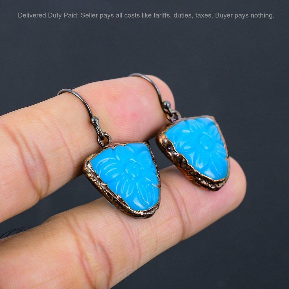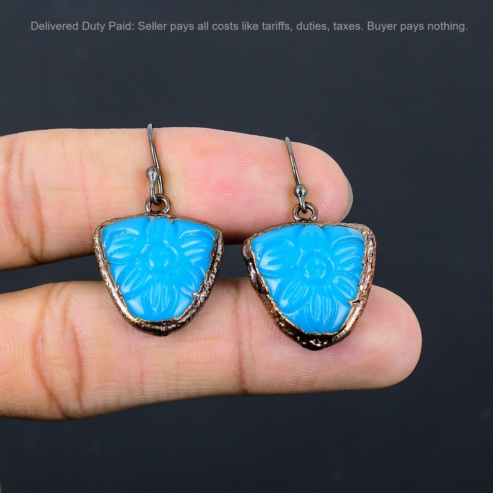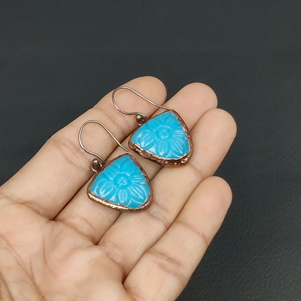 Welcome to bdenterprises123 Christmas Sale Copper Carved Blue Onyx Stone Dangle Drop Electroformed Earrings Handmade Earrings, Wire Wrapped Earrings, Wire Wrapped Jewelry, Copper Pendant, Copper Wire Earrings, Wrapped Jewelry, Wire Wrap Earrings, Wire Wrap Jewelry SKU : HZE-45 Gemstone : Carved Blue Onyx Stone Shape : Trillion Metal Purity : Unknown Copper Length : 39 Millimeters Width : 22 Millimeters Copper has been used for jewelry making for thousands of years, dating back to ancient civilizations such as the Egyptians, Romans, and Aztecs. Copper was valued for its beauty, versatility, and durability, and was often used to make everything from jewelry and coins to cookware and tools. In addition to its historical significance, copper jewelry also offers several benefits. Copper is a natural conductor of heat and electricity, which makes it ideal for energy healing and therapeutic purposes. Wearing copper jewelry is believed to have various health benefits, such as improving circulation, reducing inflammation, and boosting the immune system. Some people also believe that copper jewelry has the ability to balance energy and improve mood. For Mother's Day Gift For Father's Day Gift For Promise For Valentine's Day For Halloween Party For Christmas Day Gift For New Year Party For Mom For Her If you can't find the information you need or need some advice for your design? Feel free to contact us. We are fast to reply :) All our work is made by hand with Love and Care in our workshop Thank you so much for visiting and hope you enjoy shopping with us bdenterprises123 is committed to delivering the best quality sterling silver jewelry to customers. As a handmade jewelry manufacturer, we offer an extensive selection of copper gemstone jewelry that showcases the brilliance of our craftsmanship. We are an experienced handmade jewelry supplier with expertise in embellishing gemstones to suit every style. We offer you the liberty to create your jewelry ensemble with sparkling, earthy, and pure gemstones. Our Talented artisans masterfully handcraft each piece of jewelry you see here. Our pieces are made with genuine gemstones. The one-of-a-kind piece you see here is the same exact piece you will receive.
