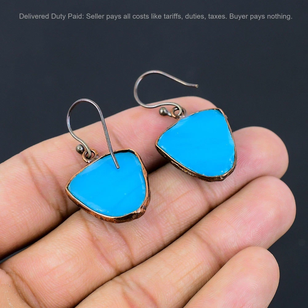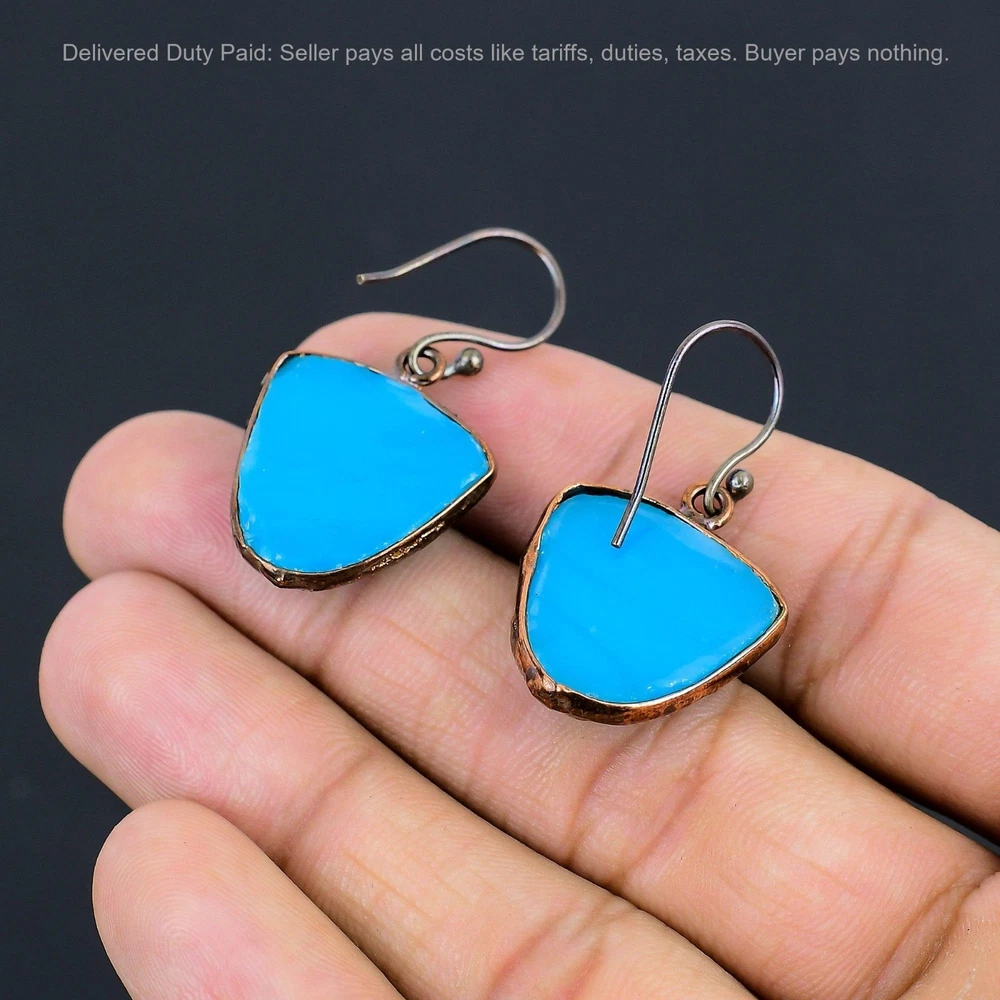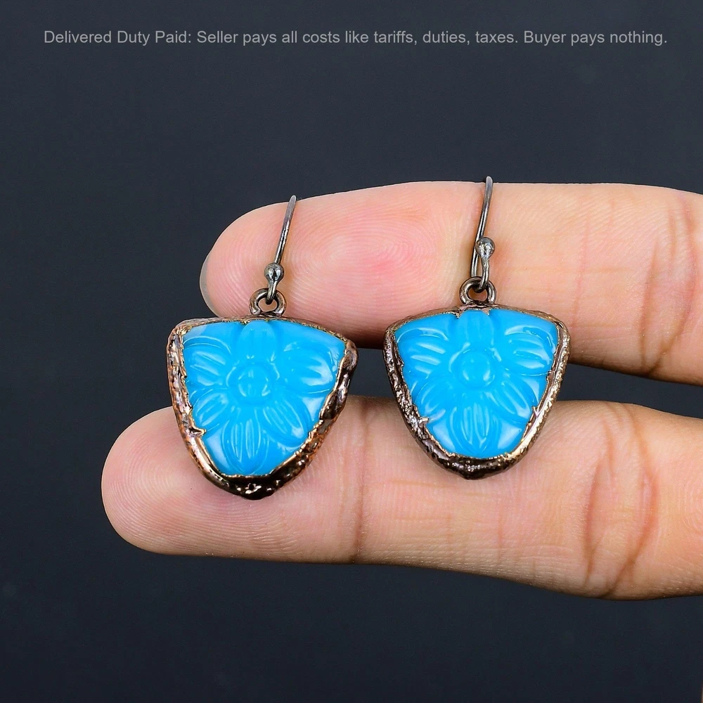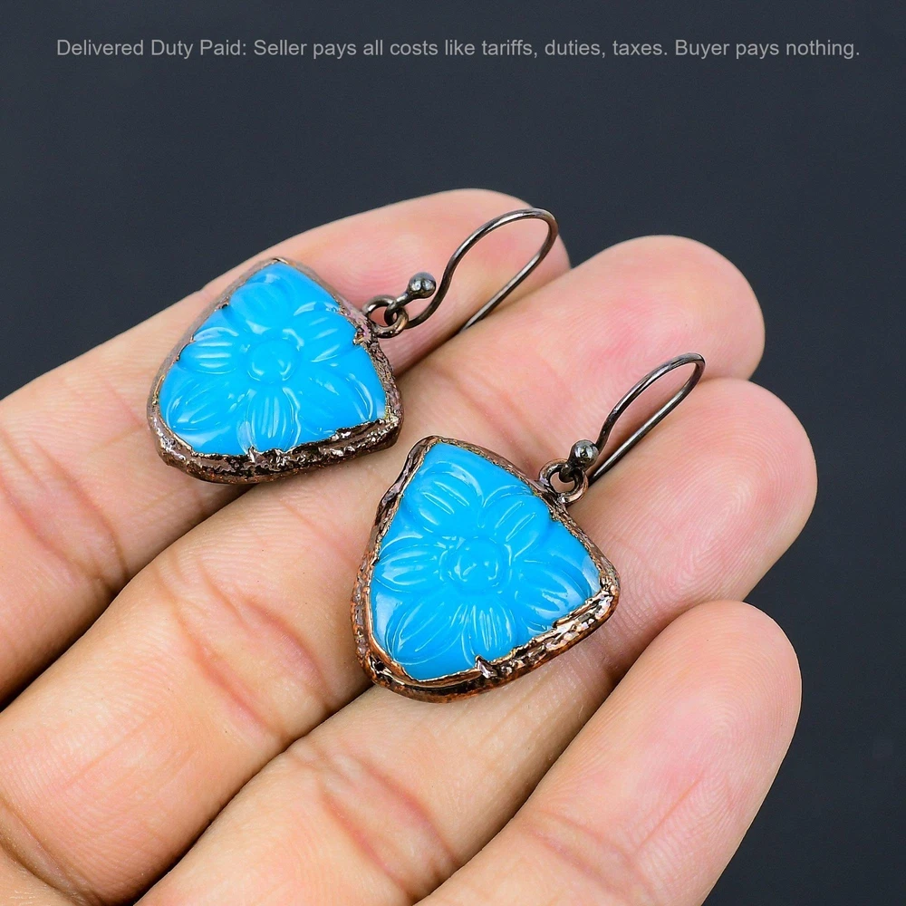 Welcome to bdenterprises123 Christmas Sale Copper Carved Blue Onyx Stone Dangle Drop Electroformed Earrings Handmade Earrings, Wire Wrapped Earrings, Wire Wrapped Jewelry, Copper Pendant, Copper Wire Earrings, Wrapped Jewelry, Wire Wrap Earrings, Wire Wrap Jewelry SKU : HZE-45 Gemstone : Carved Blue Onyx Stone Shape : Trillion Metal Purity : Unknown Copper Length : 39 Millimeters Width : 22 Millimeters Copper has been used for jewelry making for thousands of years, dating back to ancient civilizations such as the Egyptians, Romans, and Aztecs. Copper was valued for its beauty, versatility, and durability, and was often used to make everything from jewelry and coins to cookware and tools. In addition to its historical significance, copper jewelry also offers several benefits. Copper is a natural conductor of heat and electricity, which makes it ideal for energy healing and therapeutic purposes. Wearing copper jewelry is believed to have various health benefits, such as improving circulation, reducing inflammation, and boosting the immune system. Some people also believe that copper jewelry has the ability to balance energy and improve mood. For Mother's Day Gift For Father's Day Gift For Promise For Valentine's Day For Halloween Party For Christmas Day Gift For New Year Party For Mom For Her If you can't find the information you need or need some advice for your design? Feel free to contact us. We are fast to reply :) All our work is made by hand with Love and Care in our workshop Thank you so much for visiting and hope you enjoy shopping with us bdenterprises123 is committed to delivering the best quality sterling silver jewelry to customers. As a handmade jewelry manufacturer, we offer an extensive selection of copper gemstone jewelry that showcases the brilliance of our craftsmanship. We are an experienced handmade jewelry supplier with expertise in embellishing gemstones to suit every style. We offer you the liberty to create your jewelry ensemble with sparkling, earthy, and pure gemstones. Our Talented artisans masterfully handcraft each piece of jewelry you see here. Our pieces are made with genuine gemstones. The one-of-a-kind piece you see here is the same exact piece you will receive.