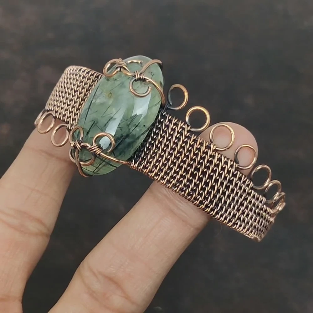 Note : Due to the natural formation of this gemstone. Slight variation in design and color are to be expected. Welcome to Silver Creation Handmade Cuff, Wire Wrapped Cuff, Wire Wrapped Jewelry, Copper Pendant, Copper Wire Cuff, Wrapped Jewelry, Wire Wrap Cuff, Wire Wrap Jewelry SKU : VFWC-315 Gemstone : Moss Prehnite Stone Shape : Oval Metal Purity : Unknown Copper Length : Millimetres Width : Millimetres Copper has been used for jewelry making for thousands of years, dating back to ancient civilizations such as the Egyptians, Romans, and Aztecs. Copper was valued for its beauty, versatility, and durability, and was often used to make everything from jewelry and coins to cookware and tools. In addition to its historical significance, copper jewelry also offers several benefits. Copper is a natural conductor of heat and electricity, which makes it ideal for energy healing and therapeutic purposes. Wearing copper jewelry is believed to have various health benefits, such as improving circulation, reducing inflammation, and boosting the immune system. Some people also believe that copper jewelry has the ability to balance energy and improve mood. For Mother's Day Gift For Father's Day Gift For Promise For Valentine' Day For Halloween Party For Christmas Day Gift For New Year Party For Mom For Her If you can't find the information you need or need some advice for your design? Feel free to contact us. We are fast to reply :) All our work is made by hand with Love and Care in our workshop Thank you so much for visiting and hope you enjoy shopping with us Silvercreations is committed to delivering the best quality sterling silver jewelry to customers. As a handmade jewelry manufacturer, we offer an extensive selection of copper gemstone jewelry that showcases the brilliance of our craftsmanship. We are an experienced handmade jewelry supplier with expertise in embellishing gemstones to suit every style. We offer you the liberty to create your jewelry ensemble with sparkling, earthy, and pure gemstones. Our Talented artisans masterfully handcraft each piece of jewelry you see here. Our pieces are made with genuine gemstones.