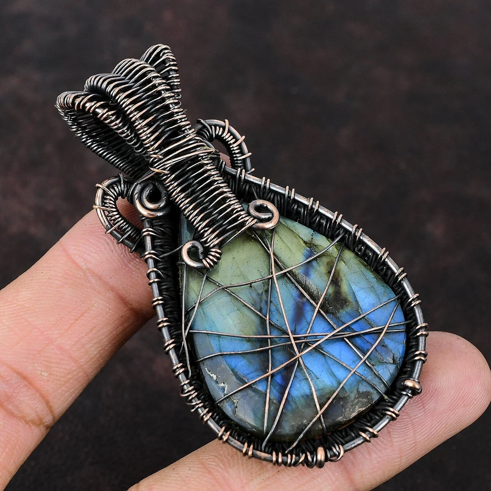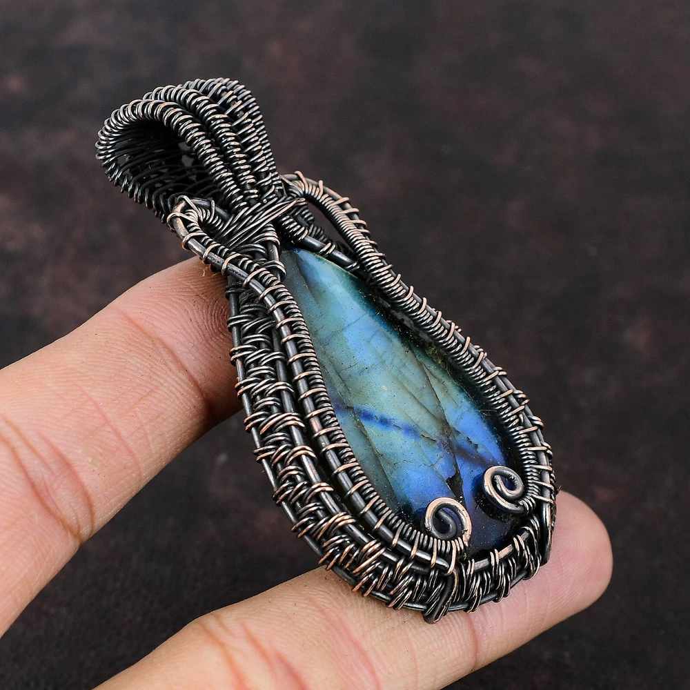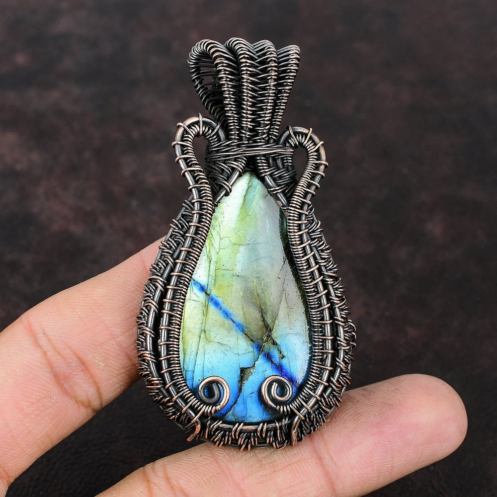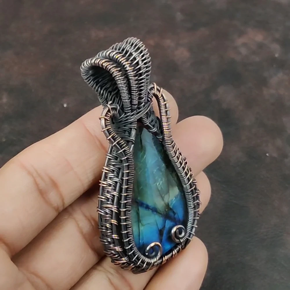 Note : Due to the natural formation of this gemstone. Slight variation in design and color are to be expected. Welcome to Silver Creation Handmade Pendant, Wire Wrapped Pendant, Wire Wrapped Jewelry, Copper Pendant, Copper Wire Pendant, Wrapped Jewelry, Wire Wrap Pendant, Wire Wrap Jewelry SKU : FWP-568 Gemstone : Labradorite Stone Shape : Pear Metal Purity : Unknown Copper Length : 73 Millimetres Width : 40 Millimetres Copper has been used for jewelry making for thousands of years, dating back to ancient civilizations such as the Egyptians, Romans, and Aztecs. Copper was valued for its beauty, versatility, and durability, and was often used to make everything from jewelry and coins to cookware and tools. In addition to its historical significance, copper jewelry also offers several benefits. Copper is a natural conductor of heat and electricity, which makes it ideal for energy healing and therapeutic purposes. Wearing copper jewelry is believed to have various health benefits, such as improving circulation, reducing inflammation, and boosting the immune system. Some people also believe that copper jewelry has the ability to balance energy and improve mood. For Mother's Day Gift For Father's Day Gift For Promise For Valentine' Day For Halloween Party For Christmas Day Gift For New Year Party For Mom For Her If you can't find the information you need or need some advice for your design? Feel free to contact us. We are fast to reply :) All our work is made by hand with Love and Care in our workshop Thank you so much for visiting and hope you enjoy shopping with us Silvercreations is committed to delivering the best quality sterling silver jewelry to customers. As a handmade jewelry manufacturer, we offer an extensive selection of copper gemstone jewelry that showcases the brilliance of our craftsmanship. We are an experienced handmade jewelry supplier with expertise in embellishing gemstones to suit every style. We offer you the liberty to create your jewelry ensemble with sparkling, earthy, and pure gemstones. Our Talented artisans masterfully handcraft each piece of jewelry you see here. Our pieces are made with genuine gemstones.